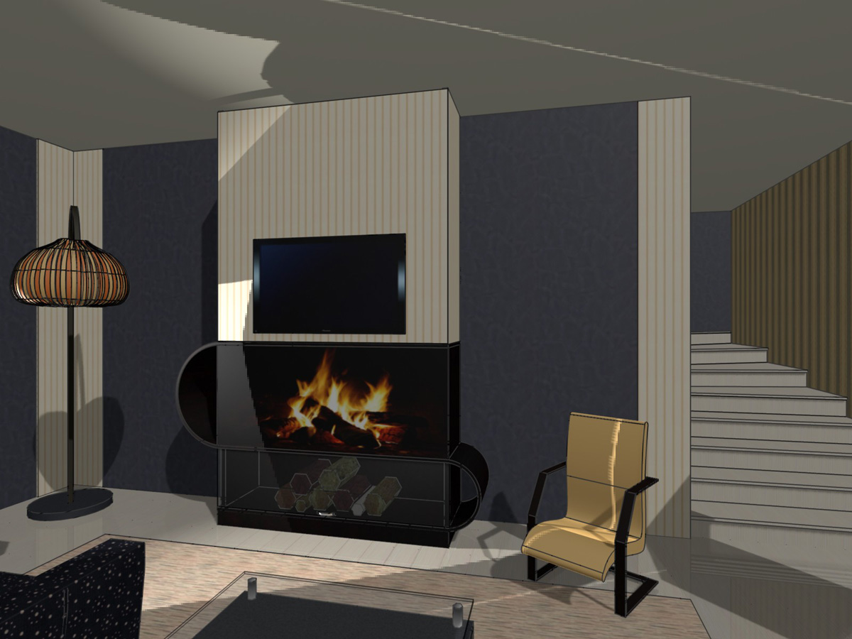 Нижняя ниша камина предназначена для хранения в ней дров. Ниша выполнена из каленого стекла и просматриваема с разных сторон. В верхней нише расположен камин с имитацией огня. Верхняя надстройка над камином позволяет создать объем общей конструкции таким образом, что камин становится центром композиции в любом помещении.