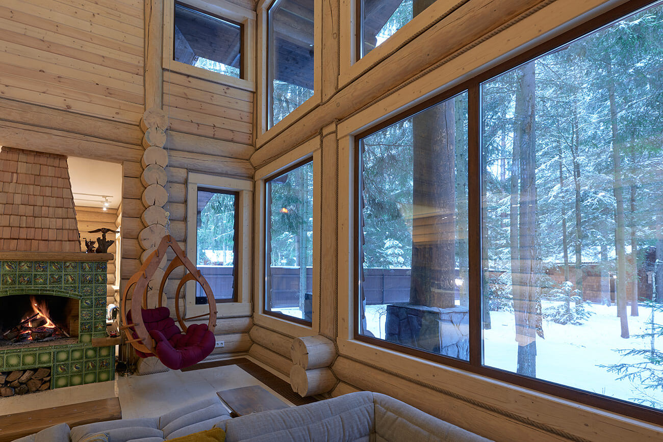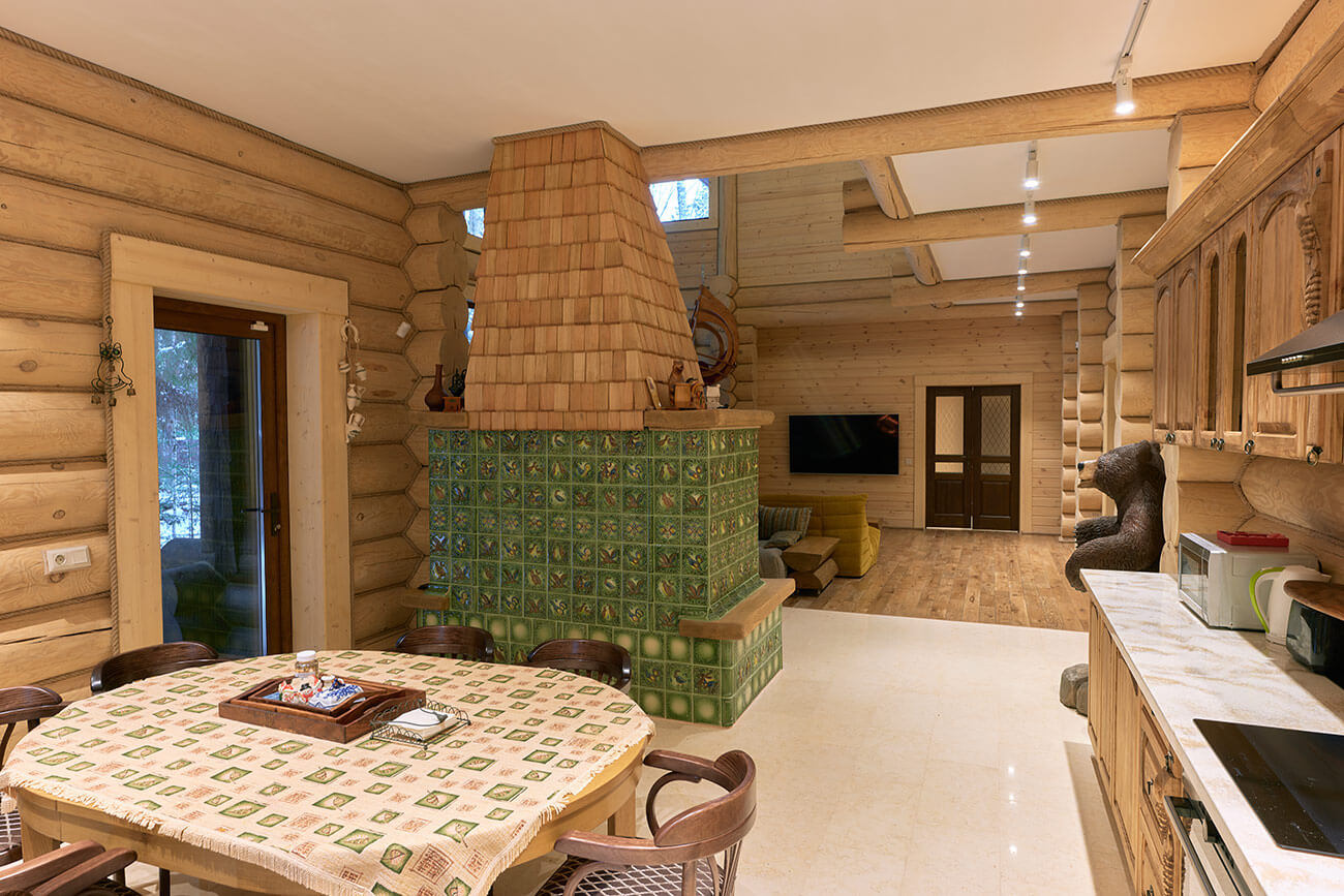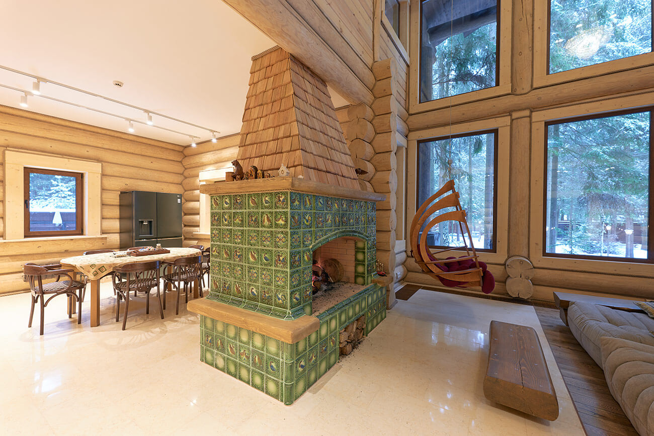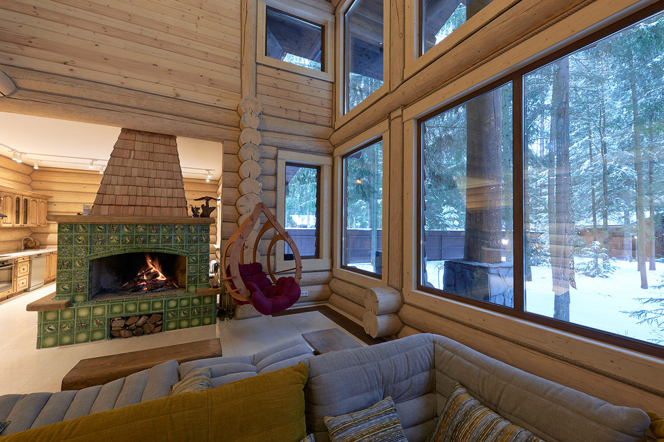 В центре дома расположена просторная двусветная гостиная, из которой открывается великолепный вид на сосновый лес. Главная роль в ней отведена камину, облицованному эксклюзивными изразцами ручной формовки и дранкой из лиственницы.