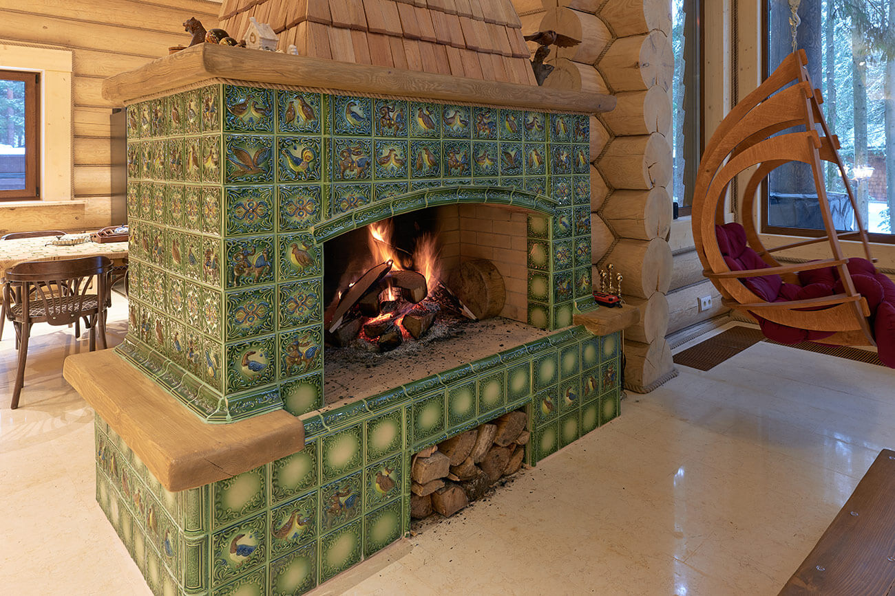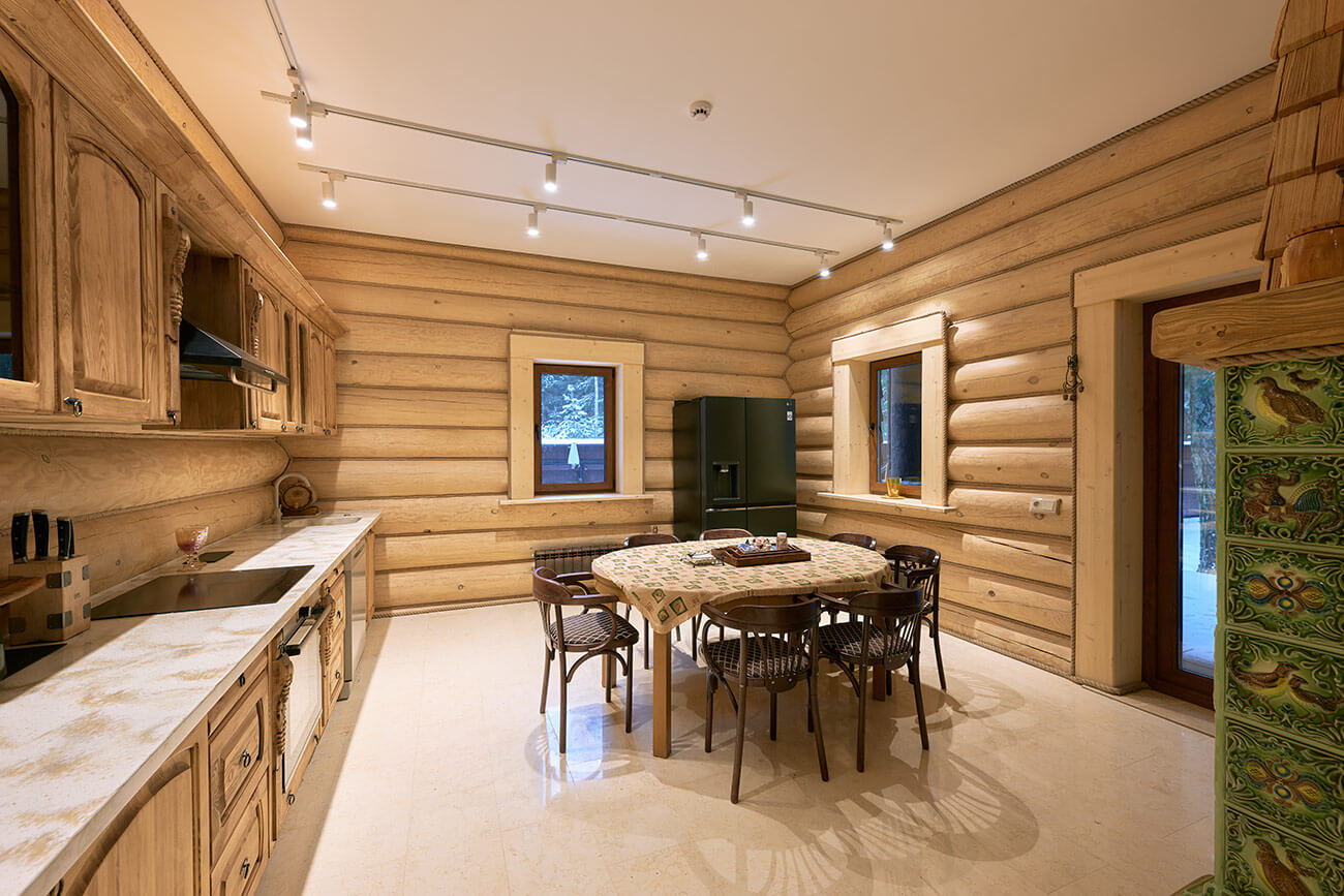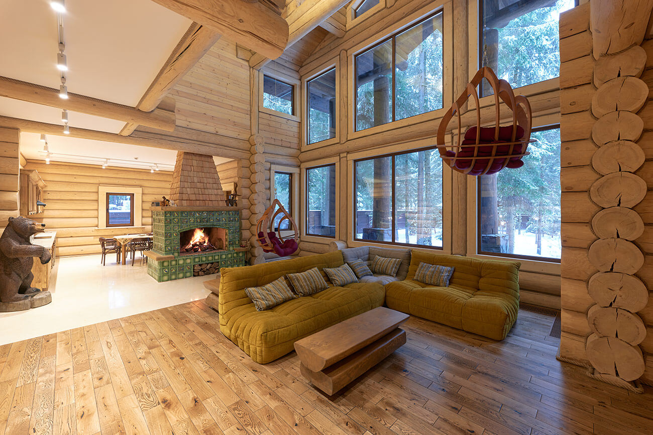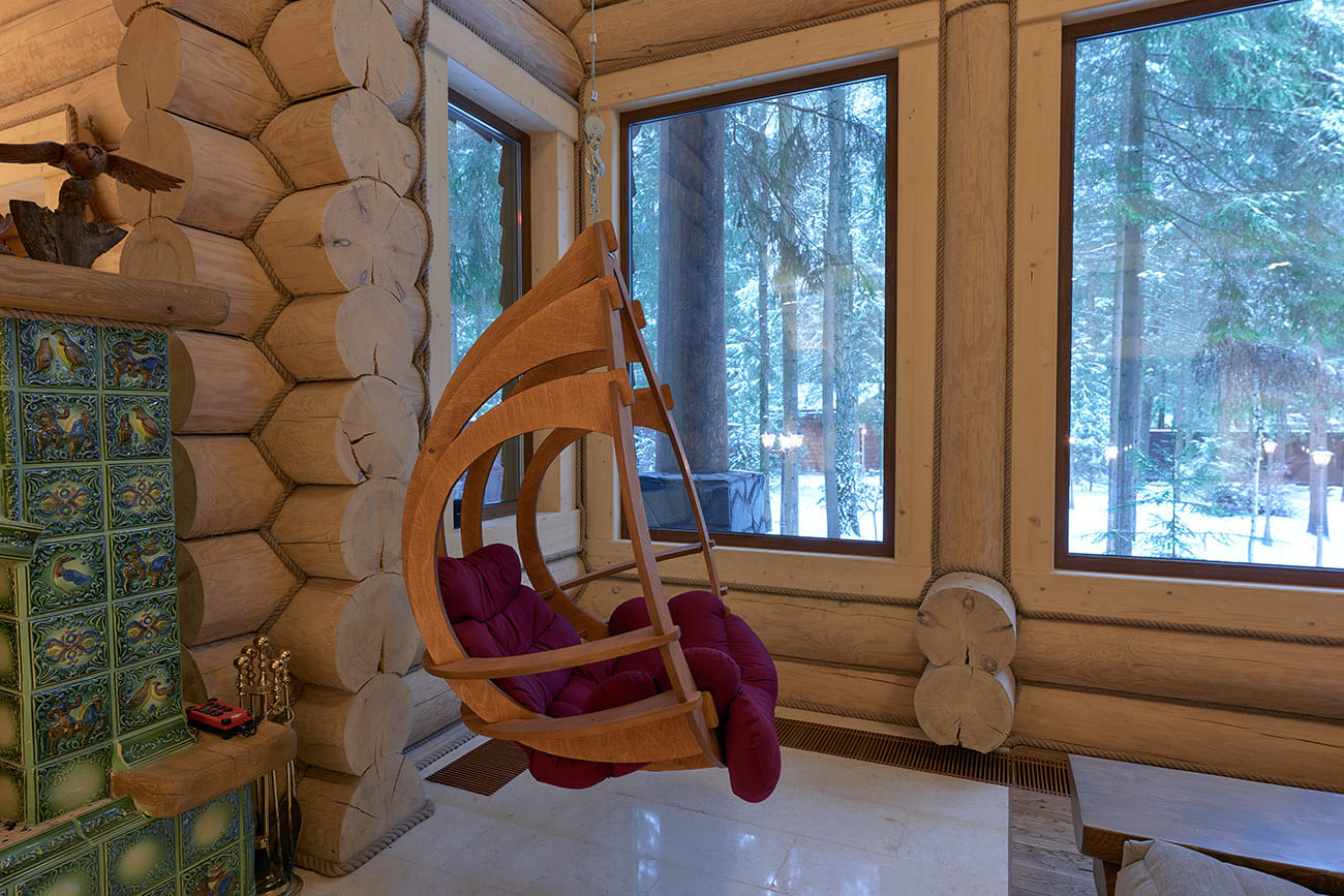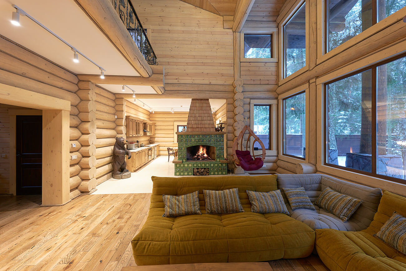 В центре дома расположена просторная двусветная гостиная, из которой открывается великолепный вид на сосновый лес. Главная роль в ней отведена камину, облицованному эксклюзивными изразцами ручной формовки и дранкой из лиственницы.