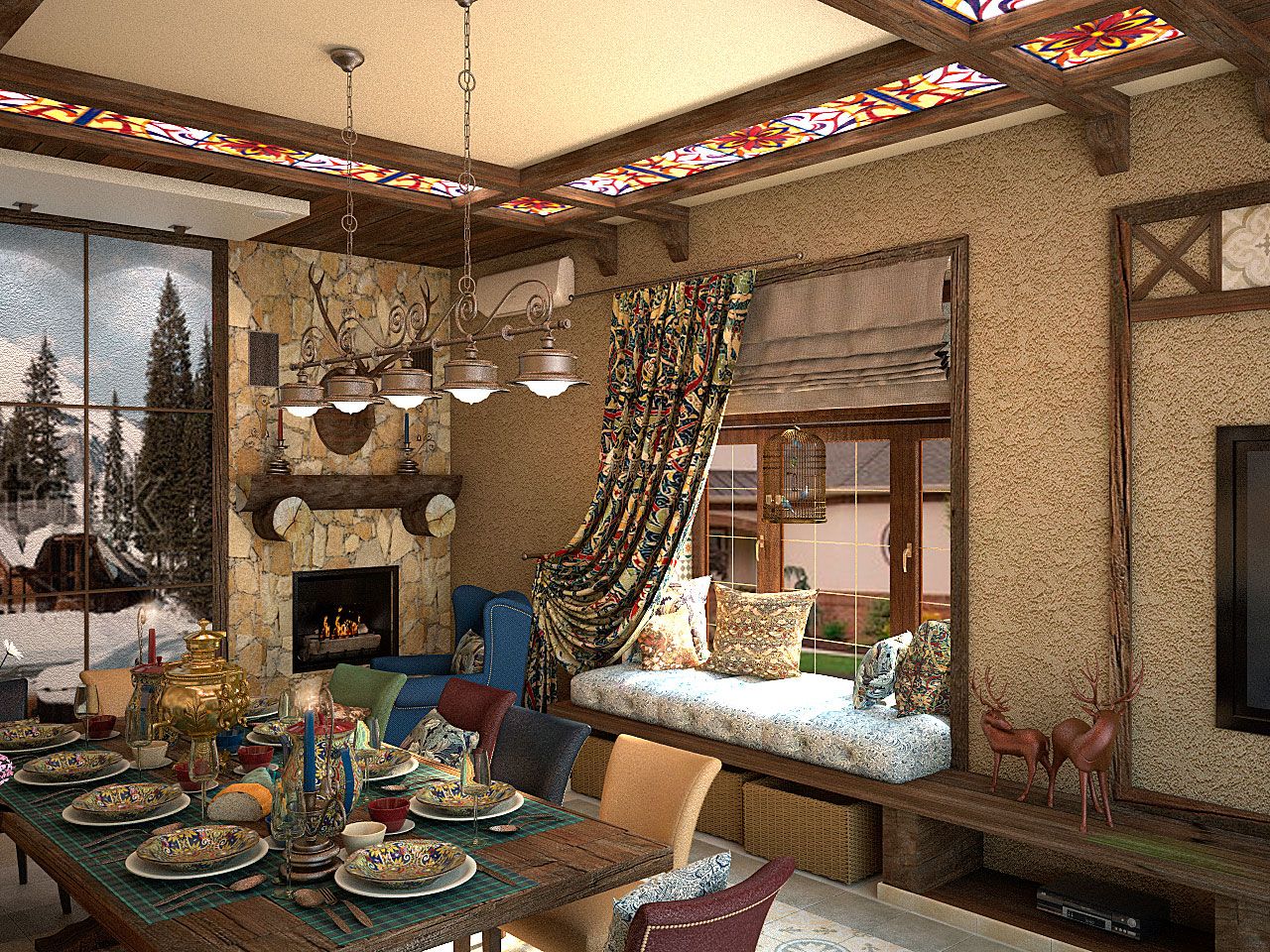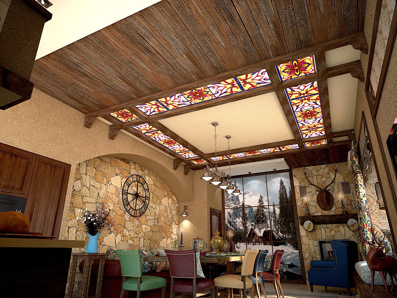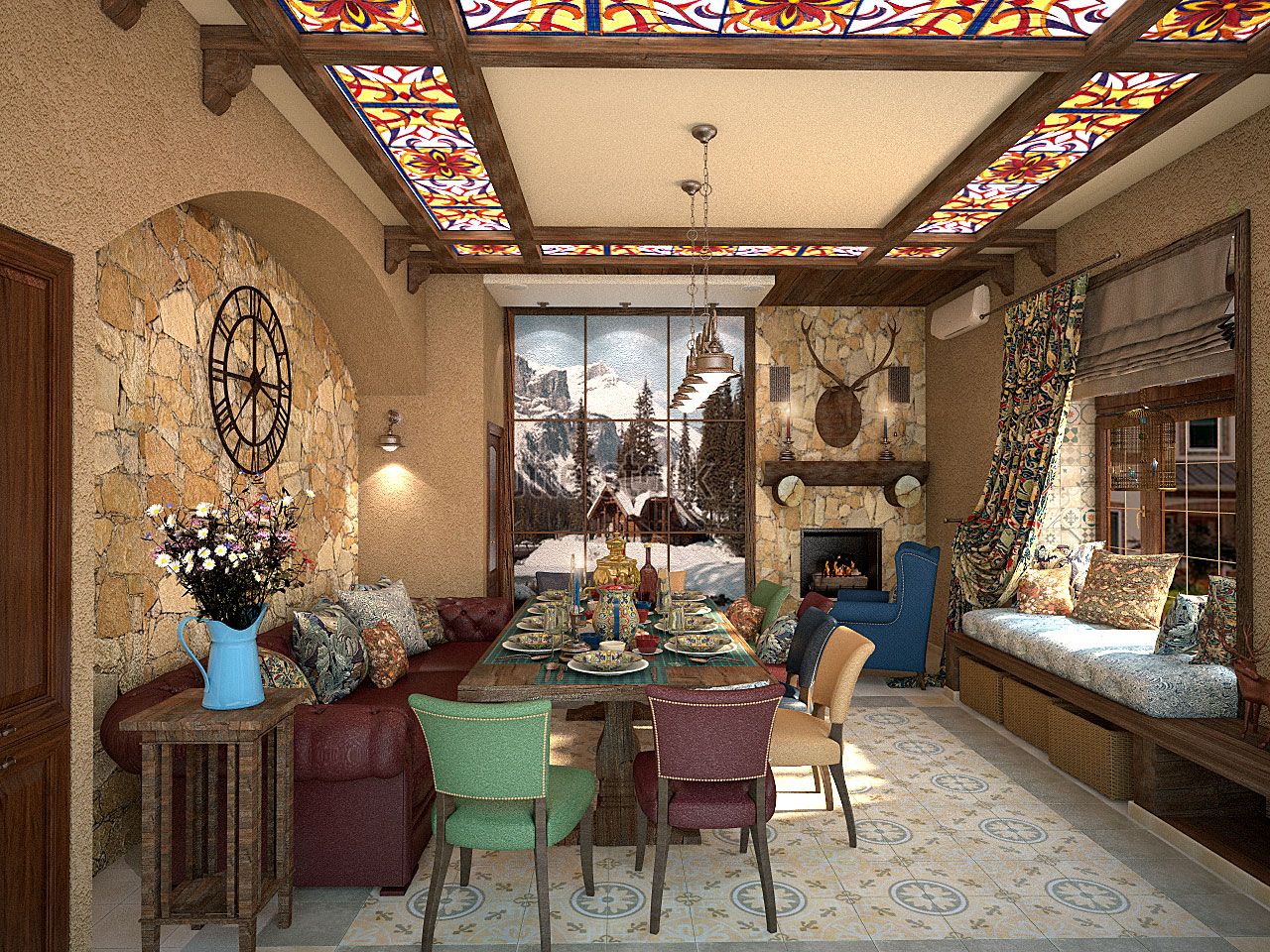 Комната для семейных праздников и шумных дружеских вечеринок выполнена в стиле рустик: грубые деревянные потолочные балки, красиво подчеркивающие данную стилистику, добротная тяжелая мебель с нарочито простыми линиями, природный камень, создающий впечатление старинного интерьера, витражные стекла на потолке, кованые металлические светильники из темного металла.