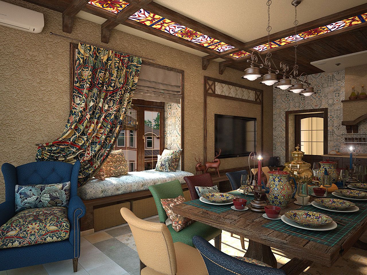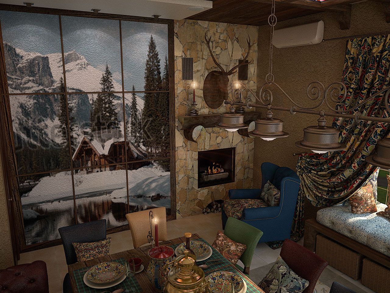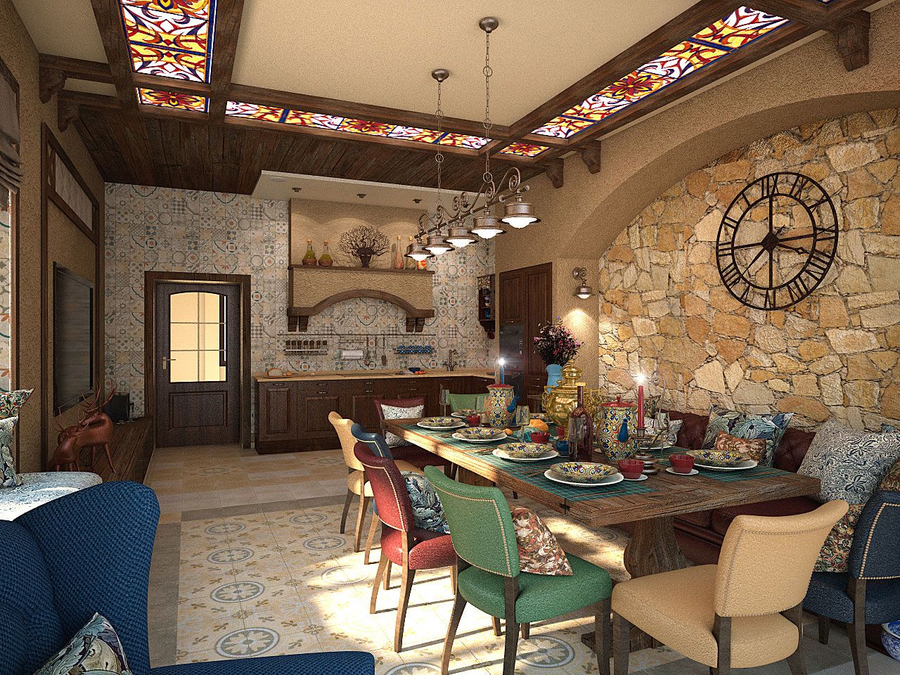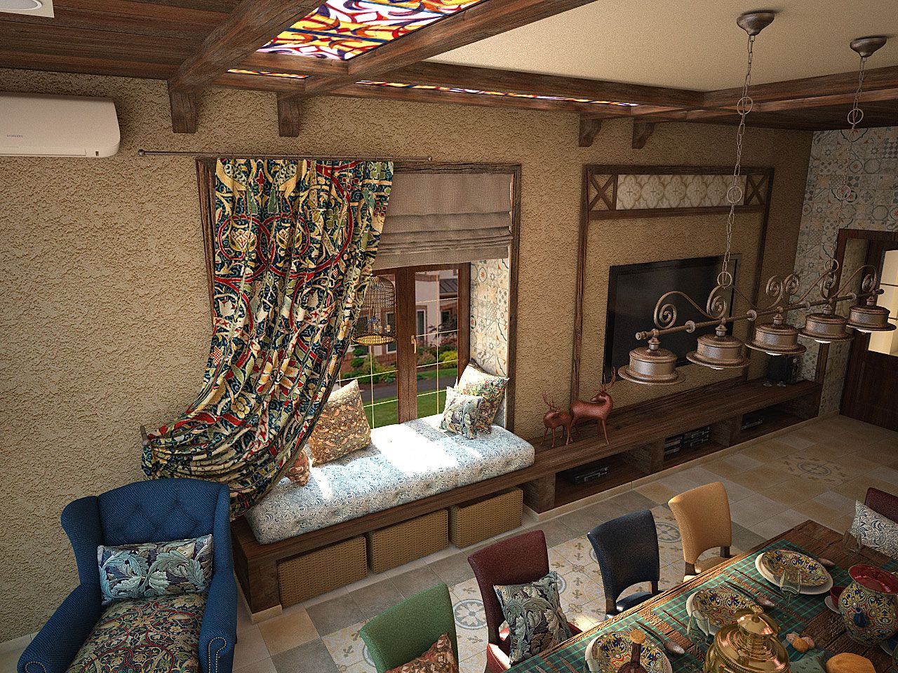 Комната для семейных праздников и шумных дружеских вечеринок выполнена в стиле рустик: грубые деревянные потолочные балки, красиво подчеркивающие данную стилистику, добротная тяжелая мебель с нарочито простыми линиями, природный камень, создающий впечатление старинного интерьера, витражные стекла на потолке, кованые металлические светильники из темного металла.