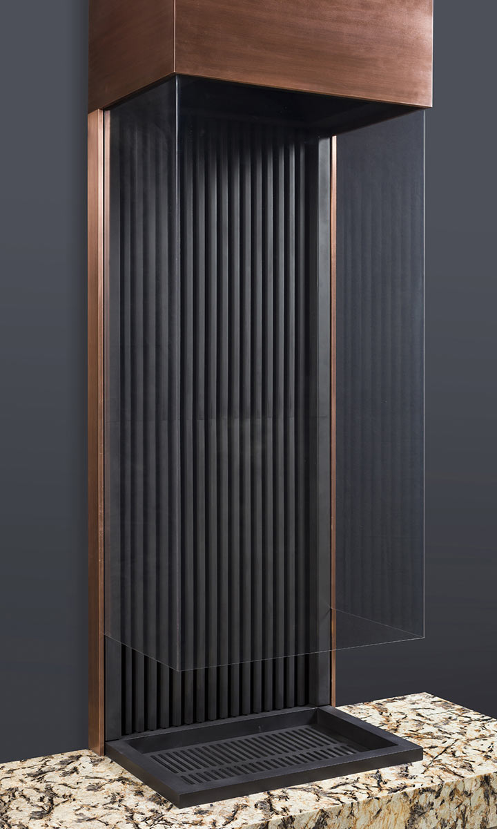 Отказавшись от декора и классических шаблонных решений, архитектор проекта сделал ставку на сочетание текстур благородных материалов. Металлический блеск меди, прозрачность стекла, дающая ощущение воздуха и пространства, деликатная полированная поверхность натурального камня — все это гармонично сочетается в выверенных пропорциях и чистоте линий.