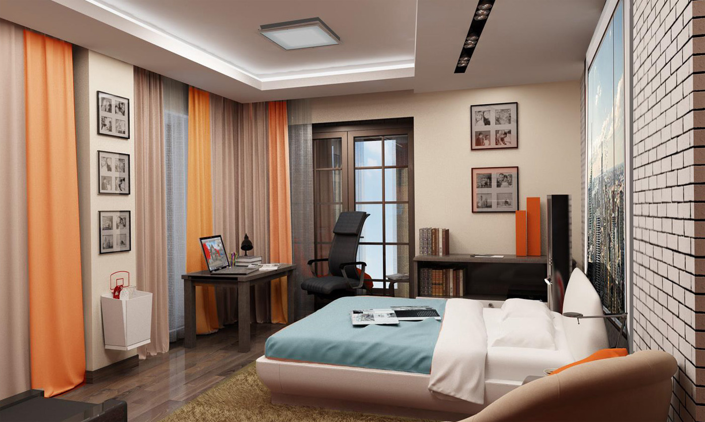 Спальня задумывалась как помещение, выполненное в светлой пастельной гамме с максимальным количеством светлых оттенков и ярких пятен. Изголовье постели оформлено кирпичной кладкой, типичной для стиля лофт. На ее фоне эффектно смотрится панно-фотография с изображением современного города, серо-голубая гамма которого гармонично сочетается с голубым покрывалом и красиво контрастирует с оранжевыми занавесками и длинноворсным напольным ковром бежевого цвета, придающим интерьеру тепло и уют.