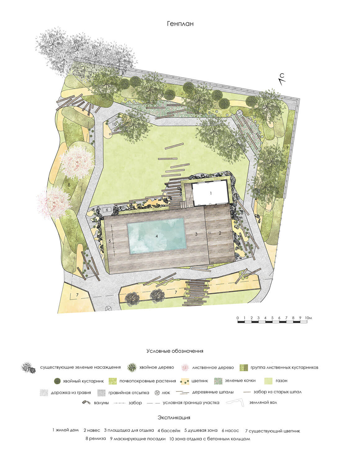 Участок с двух сторон окружен смешанным лесом, с третьей стороны к нему примыкает валунистый луг и лес. На территории уже была небольшая группа из сосны обыкновенной, искусственный вал вдоль северо-западной стороны и жилой дом с террасой в юго-восточной части территории.