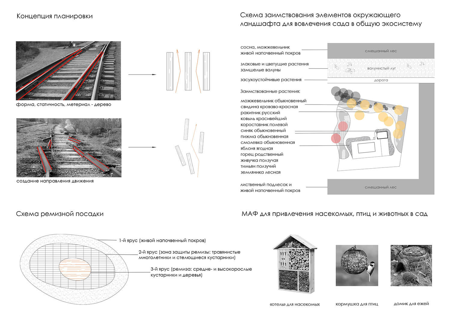 Концепция продиктована пожеланиями заказчика, локацией и личной жизненной позицией. Главными принципами стали сохранение состава почвы, растительности и экосистемы в целом, а также соподчинение сада окружающему ландшафту. В ходе проектирования был проанализирован растительный состав смешанного леса и природного луга. Для вовлечения пространства сада в общую экосистему среды часть растений были заимствованы. Для имитации окружающего ландшафта были переняты и другие элементы ландшафта — замшелые валуны, формы железной дороги.