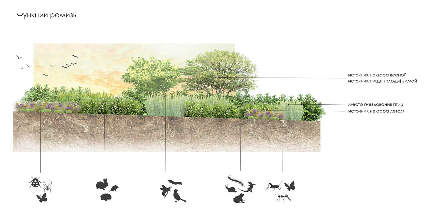 Для привлечения представителей животного мира в сад запроектированы ремизные посадки. Наподобие посадок в природе были составлены растительные композиции из трех ярусов. Яруса являются местом обитания разных живых организмов.