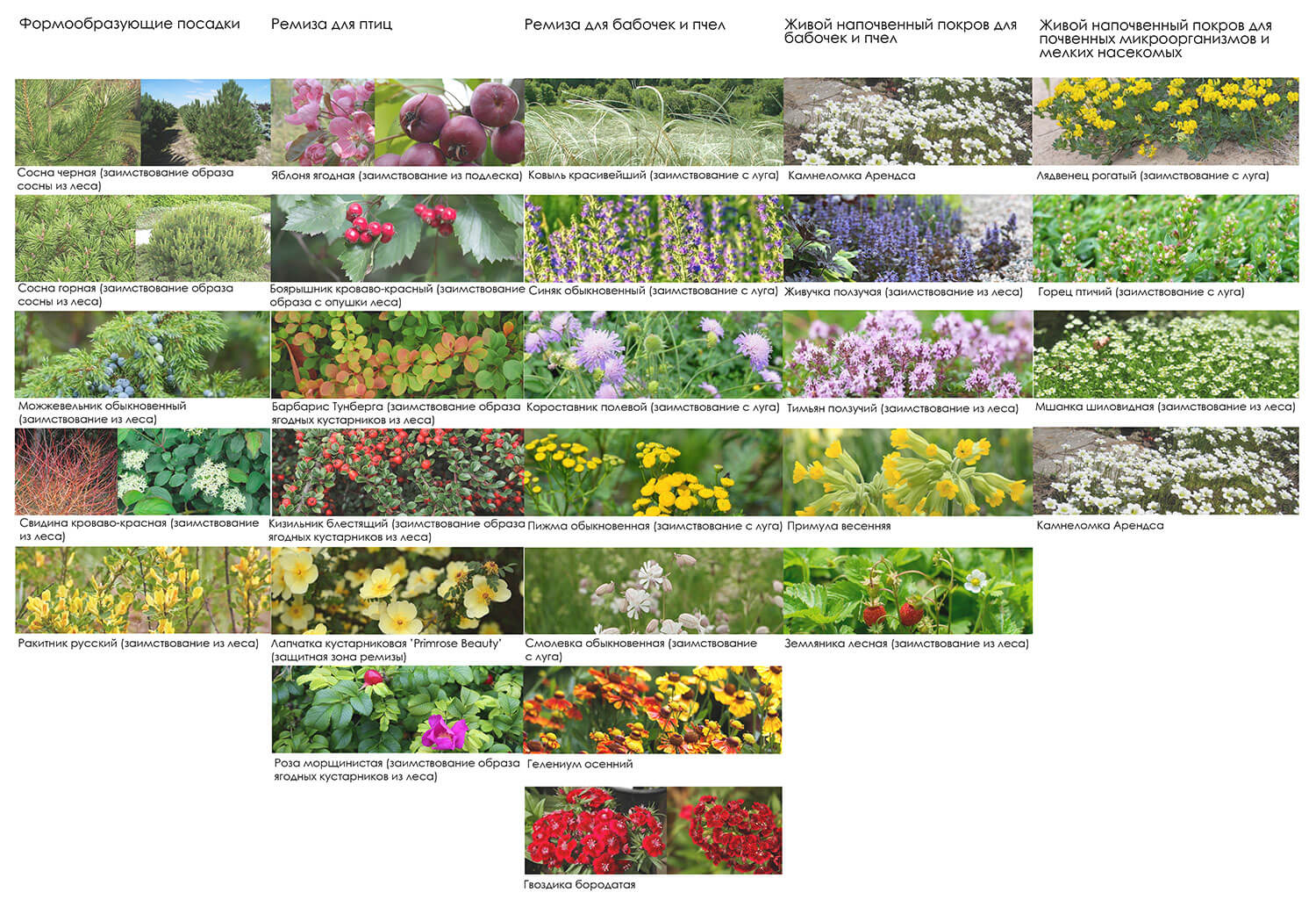 Первый ярус — живой напочвенный покров — является местом жизнедеятельности почвенных микроорганизмов и мелких насекомых, второй ярус — травянистые многолетники и стелющиеся кустарники — место обитания опыляющих насекомых и мелких птиц, гнездующихся на земле, и третий ярус — средне- и высокорослые кустарники и деревья — место обитания птиц, гнездующихся в ветвях и опыляющих насекомых.