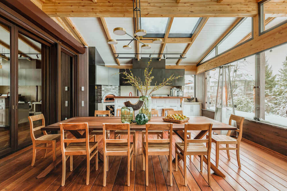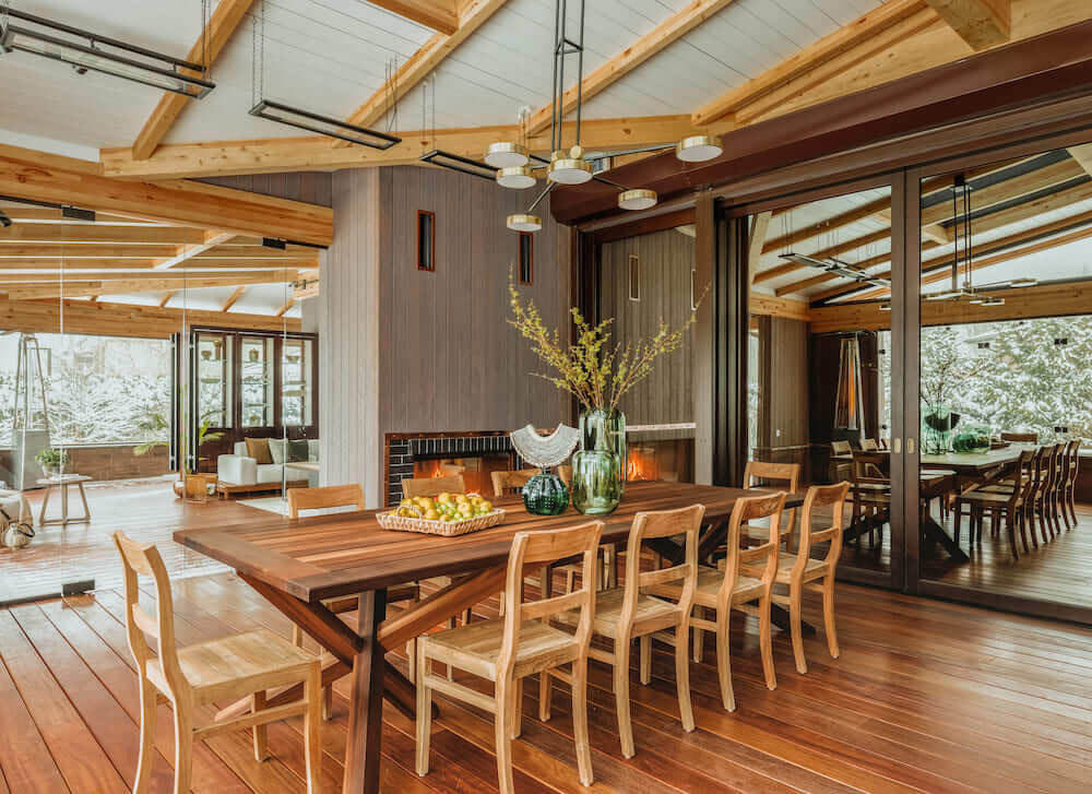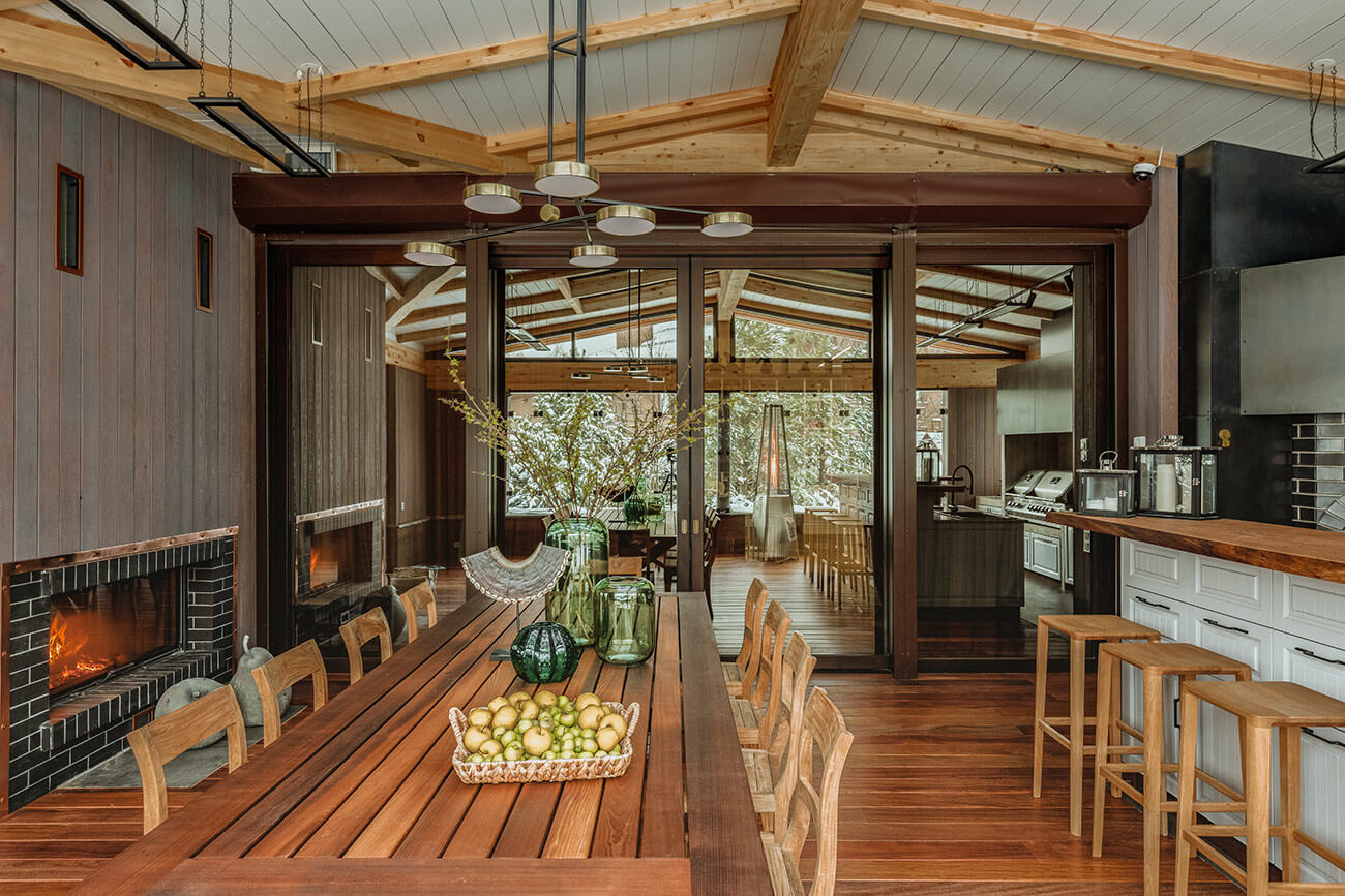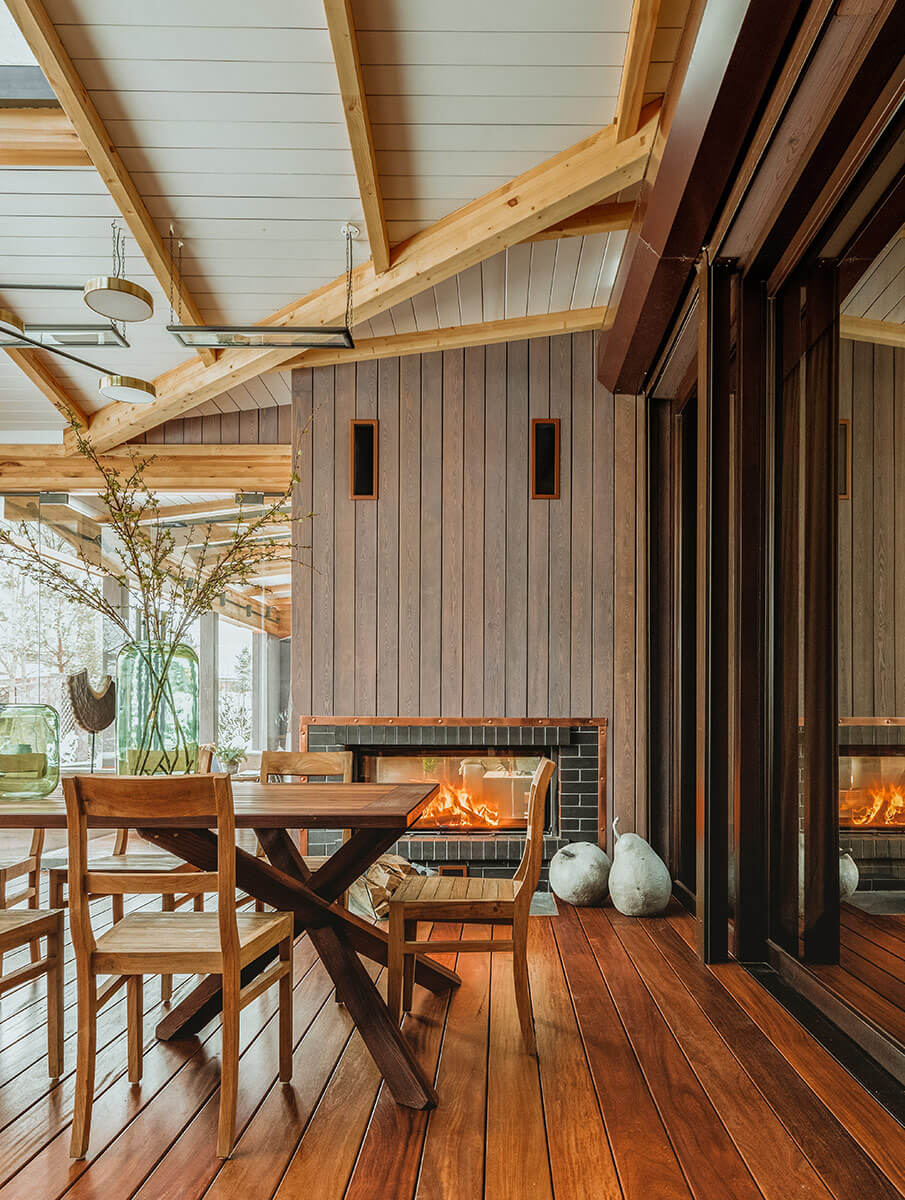 А в качестве центра притяжения — современная обеденная зона и пространство с камином.