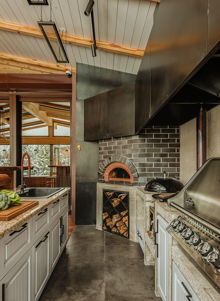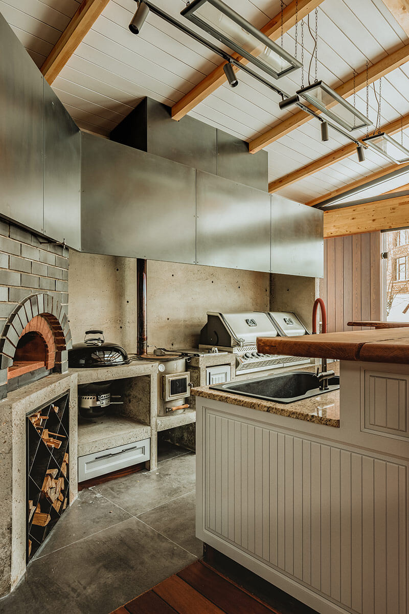 И началась работа: собрали каркас из клееного бруса, отлили основу кухни из железобетонной конструкции, разместили внутри печь для пиццы, печь для плова, угольный гриль и любимый хозяйский барбекю «Наполеон» — буквально Rolls-Royce среди жарочной техники.