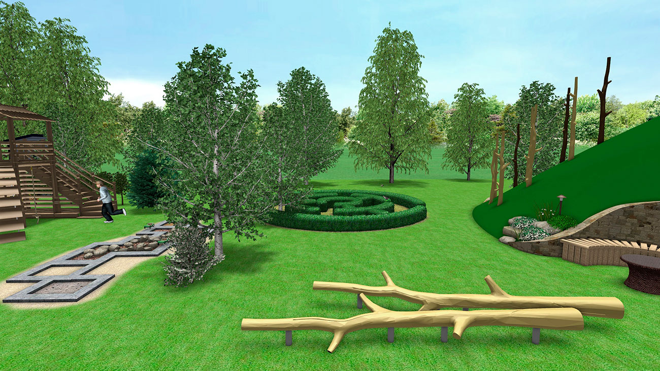 Стиль — пейзажный, основные элементы площадки составляют абстрактную композицию с различными элементами — беседка (она же детский игровой домик), выполненная в кубическом стиле, что позволяет создать некую доминанту на фоне плавных линий площадки, горка на склоне, песочница, сад камней, качели, игровая конструкция, зеленый и деревянный лабиринты, тактильная дорожка.