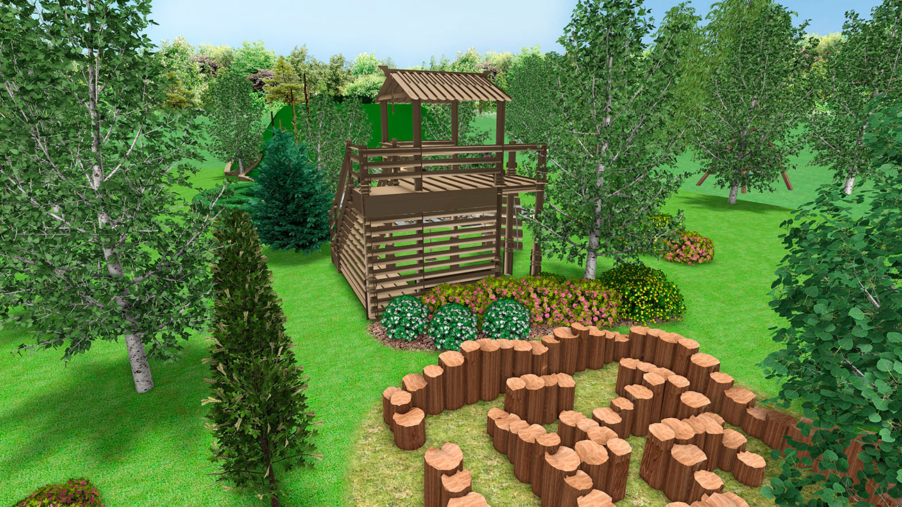 Участок проектирования выбран в загородном саду — поляна, окруженная лесом. Проектом предусмотрено создание тематической площадки, посвященной большой игре (популярной тематики непрерывного действия «квеста» для разных возрастов), с использованием природных материалов, чтобы игровая площадка составляла комплекс интересных и неповторимых игр, где экономически невыгодно применять сложное, интенсивно используемое оборудование.