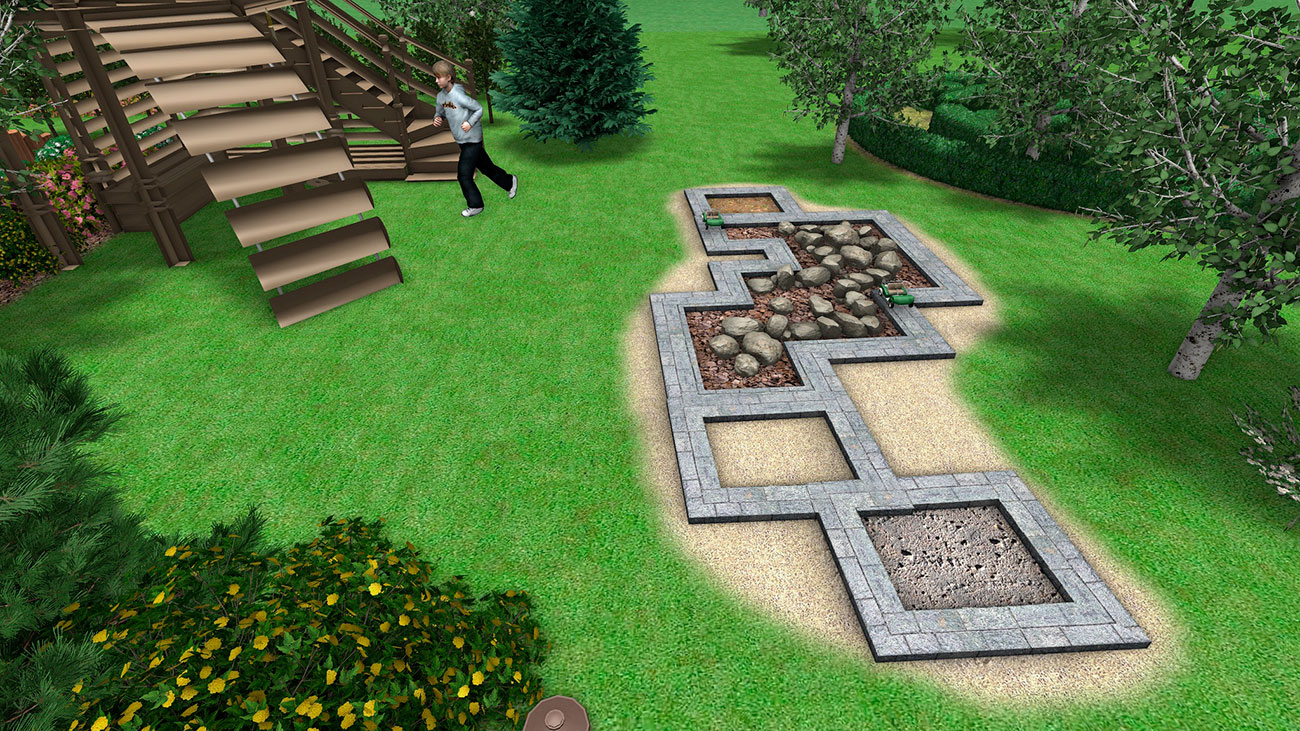 Тактильная дорожка — с наполнением из мелкого щебня (гальки), толстых веток (40-50 мм диам.), окатанного булыжника, торцов дерева, шишек, коры, опилок/стружек — яркие декоративные материалы, и дети с присущей им фантазией обратят их в игру.