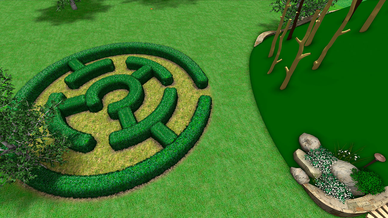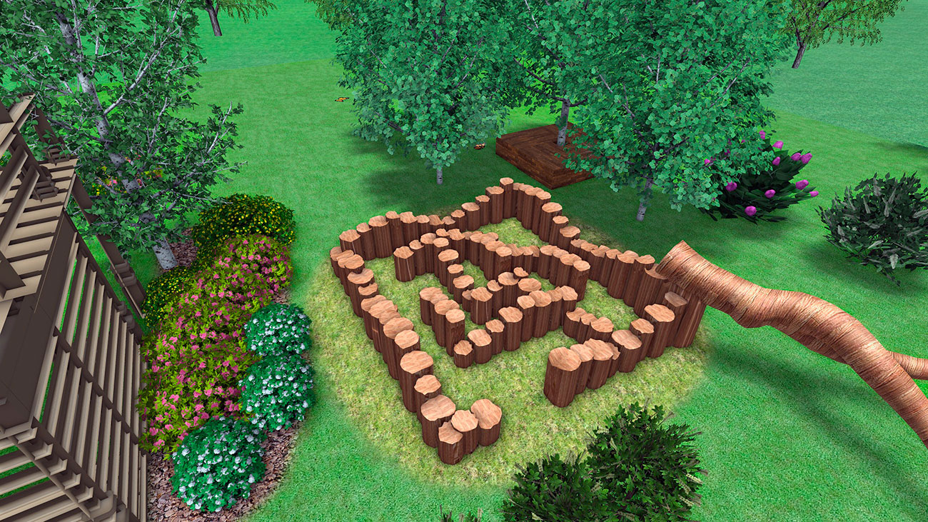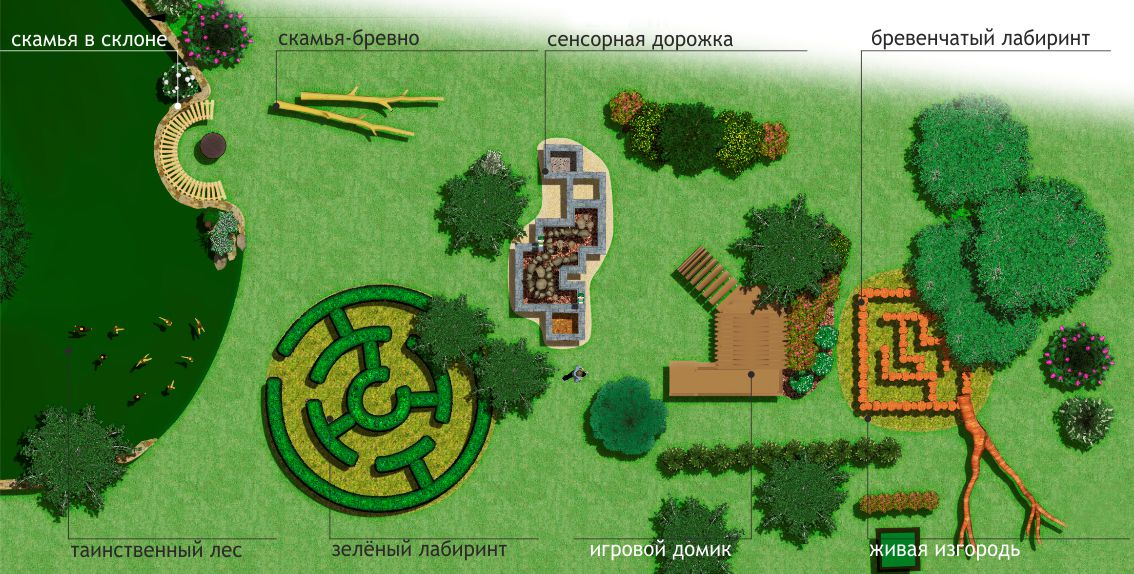 Одним из ярких элементов на площадке является зеленый лабиринт, имеющий игровые и эстетические функции.