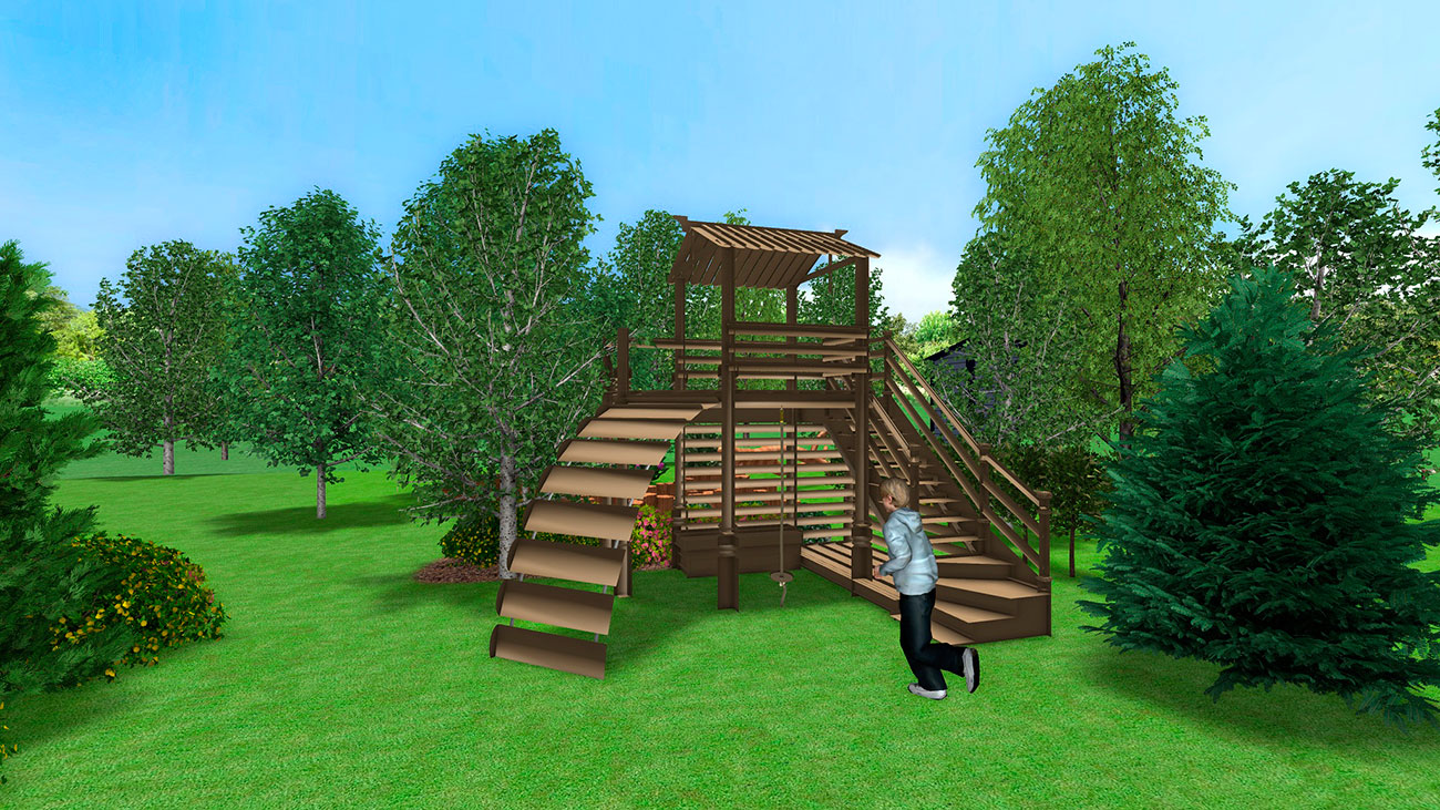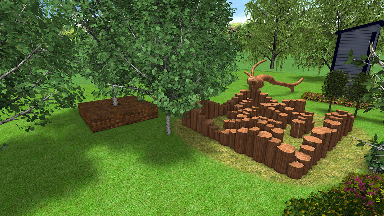 Согласно концепции данной детской площадки в гармонии с природой и максимальном использовании природных материалов идеальный строительный материал — дерево, недорогой, экологичный, «теплый», легко поддающийся обработке, выразительный и относительно долговечный. Из дерева запланированы различные игровые предметы, лазательная система, лабиринт, беседка, скамьи, дополнительно использованы канаты из натуральных джутовых волокон. Отдельные элементы сохраняют естественный вид дерева с характерным для него расположением корневищ и ветвей.