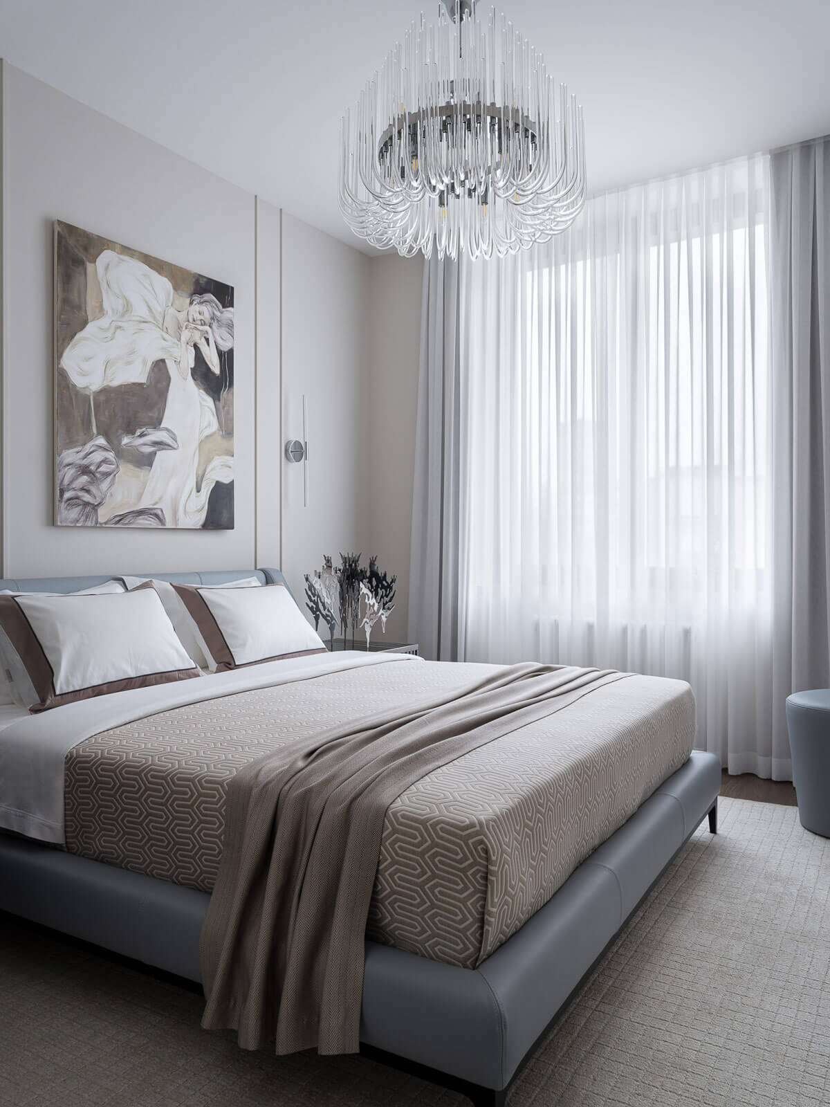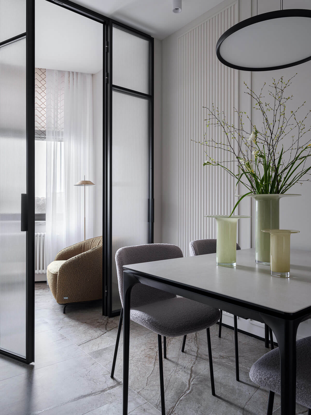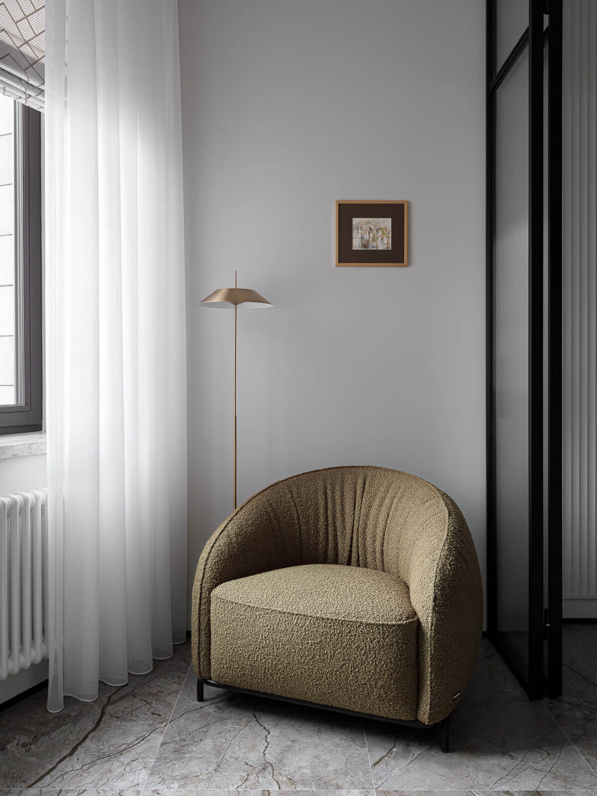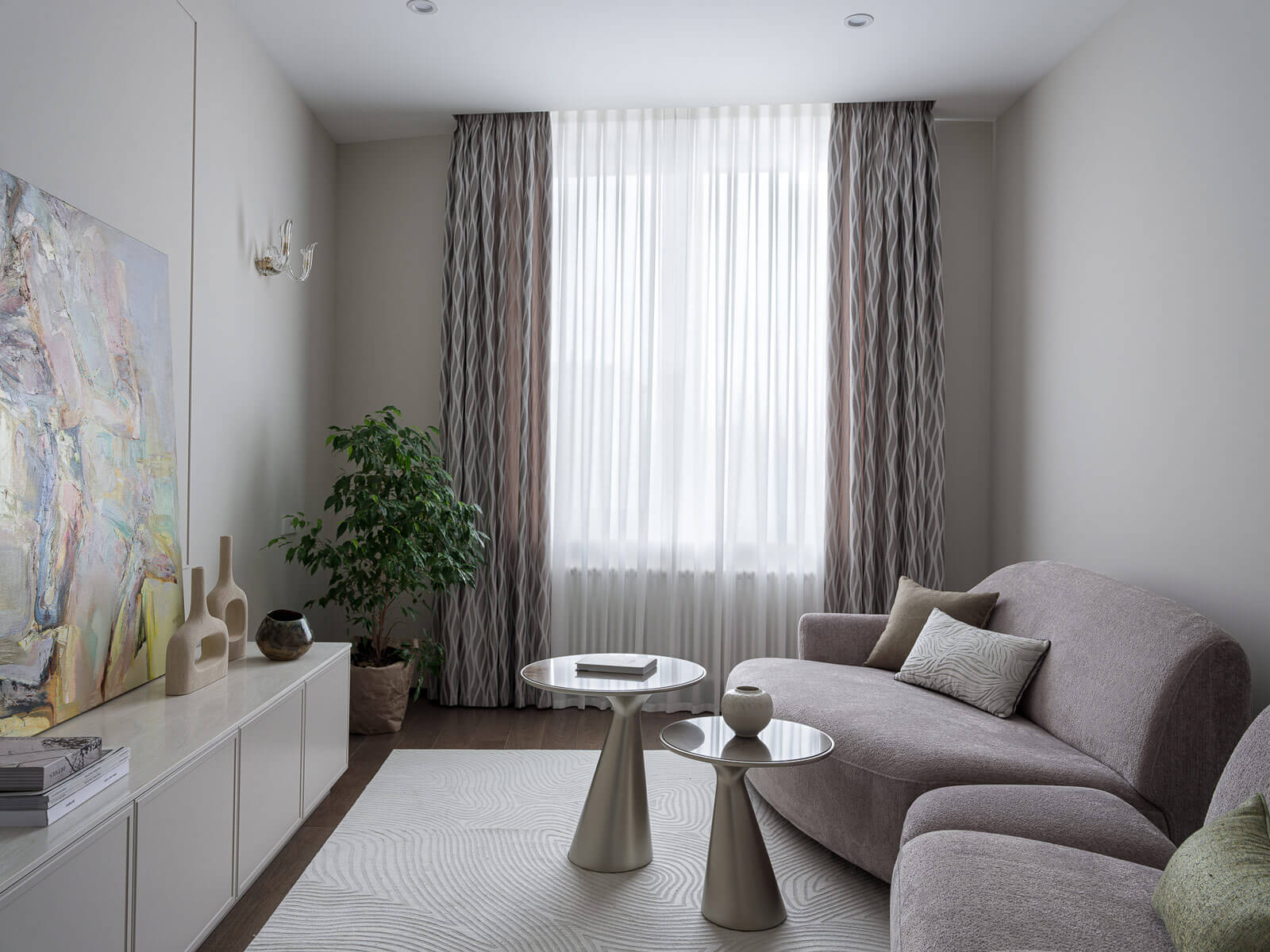 В основе пространства – мягкая, светлая палитра, визуально расширяющая площадь и создающая ощущение воздушности. Полы из итальянского керамогранита и паркета плавно перетекают из одной зоны в другую, объединяя интерьер в единое целое. Лаконичные стены стали идеальным фоном для стильной мебели и акцентных деталей. Тяжелые портьеры заменили легкие текстуры, пропускающие максимум естественного света. Качественные предметы мебели и дизайнерские светильники – преимущественно европейских брендов – придают пространству изысканность без излишней вычурности.