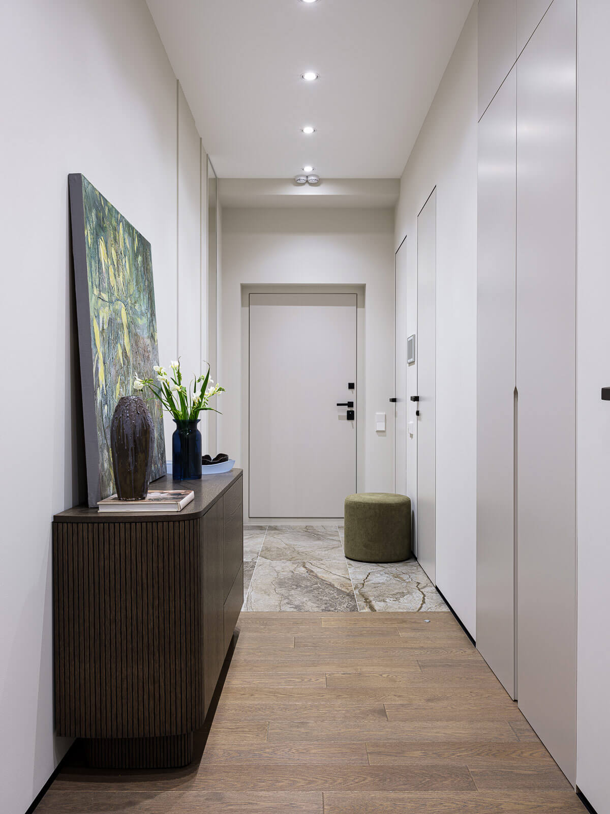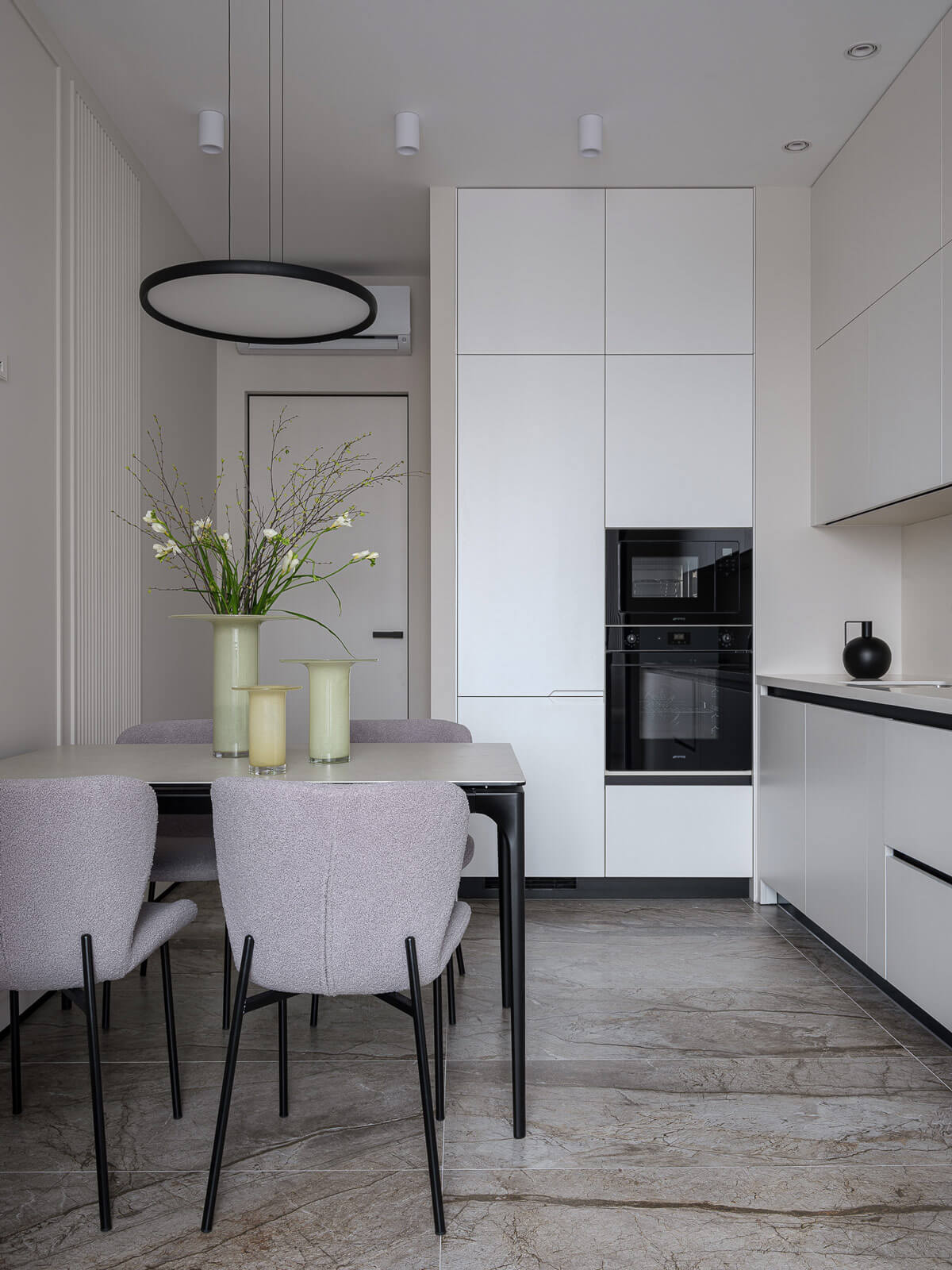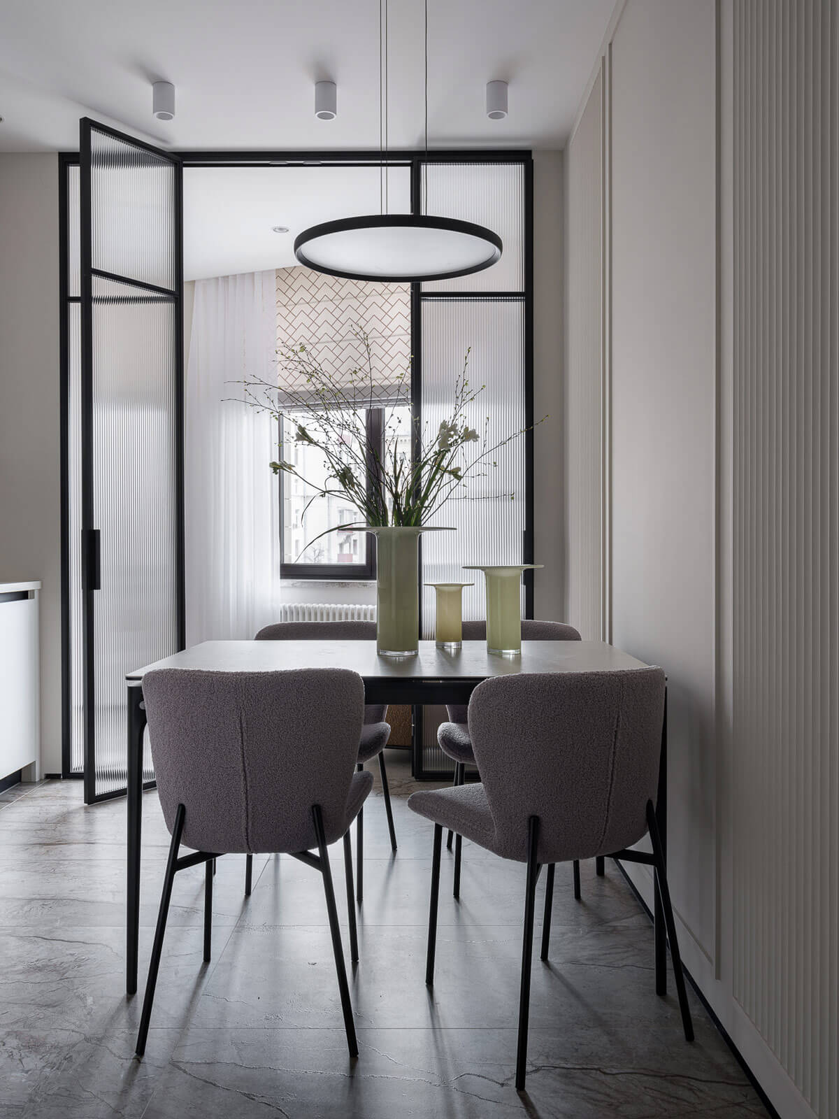 В основе пространства – мягкая, светлая палитра, визуально расширяющая площадь и создающая ощущение воздушности. Полы из итальянского керамогранита и паркета плавно перетекают из одной зоны в другую, объединяя интерьер в единое целое. Лаконичные стены стали идеальным фоном для стильной мебели и акцентных деталей. Тяжелые портьеры заменили легкие текстуры, пропускающие максимум естественного света. Качественные предметы мебели и дизайнерские светильники – преимущественно европейских брендов – придают пространству изысканность без излишней вычурности.