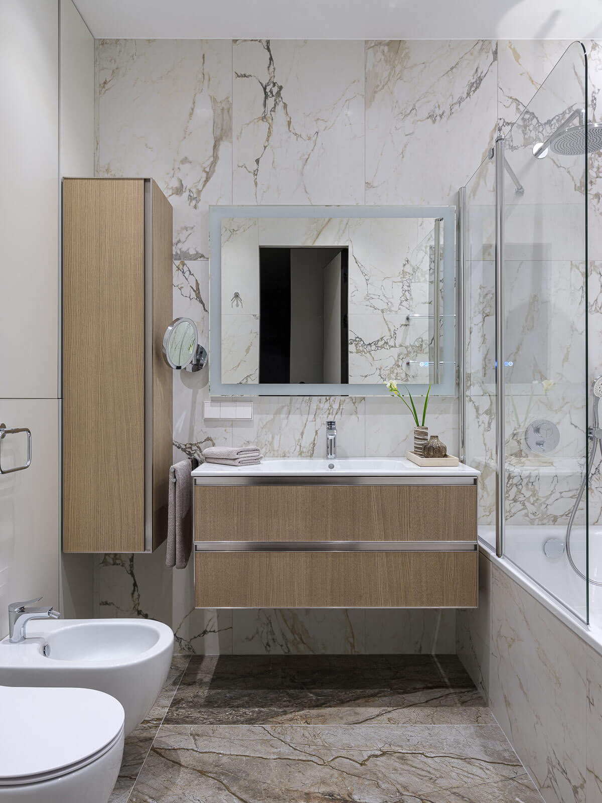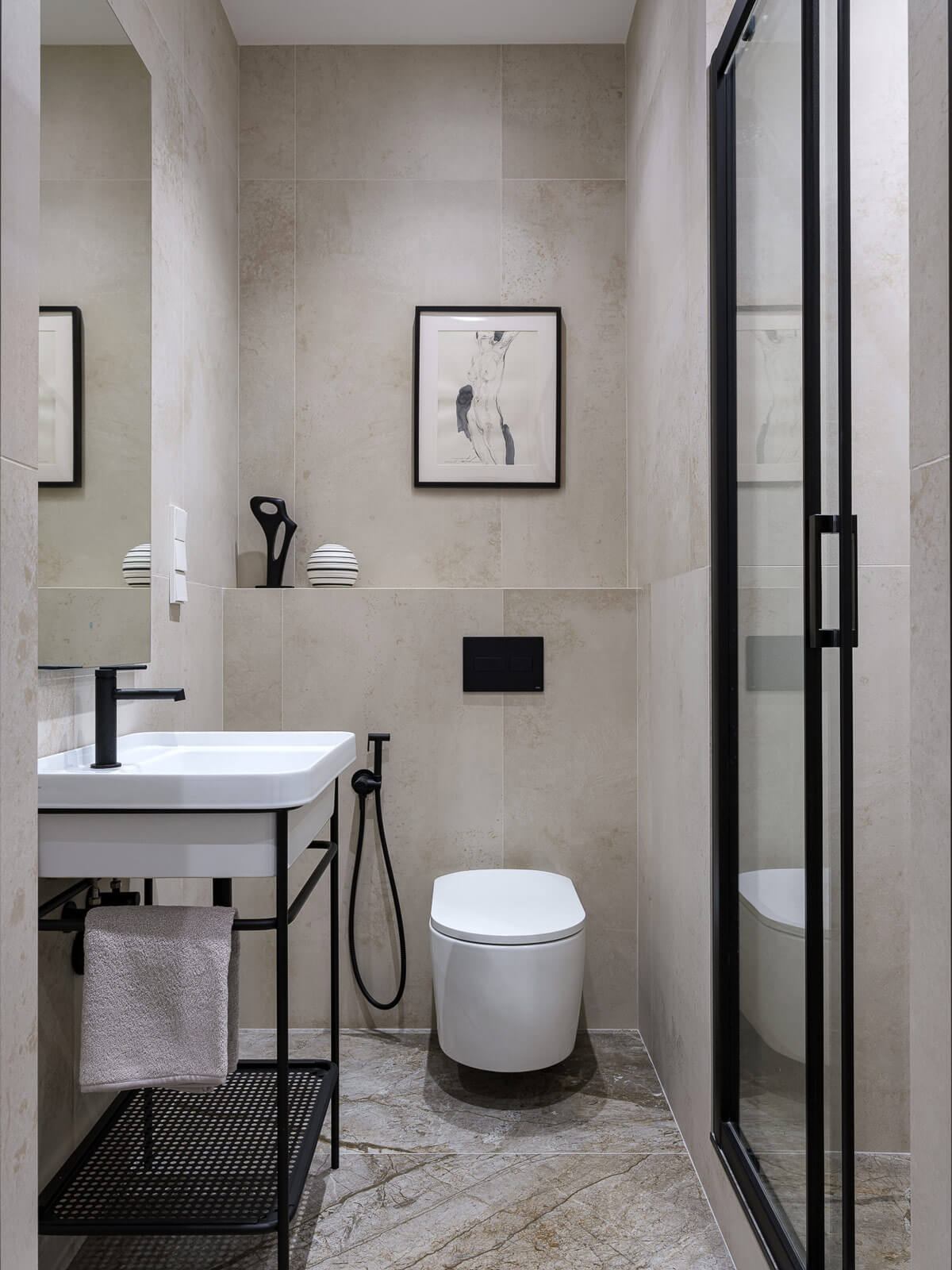 Грамотная планировка четко делит квартиру на гостевую и приватную зоны. У входа расположены гардеробная и полноценный гостевой санузел. Кухня плавно переходит в зону кабинета, который можно изолировать стеклянными перегородками. Просторная гостиная наполнена светом и не перегружена мебелью, а приватная часть включает мастер-спальню с гардеробной и хозяйский санузел с ванной и биде.