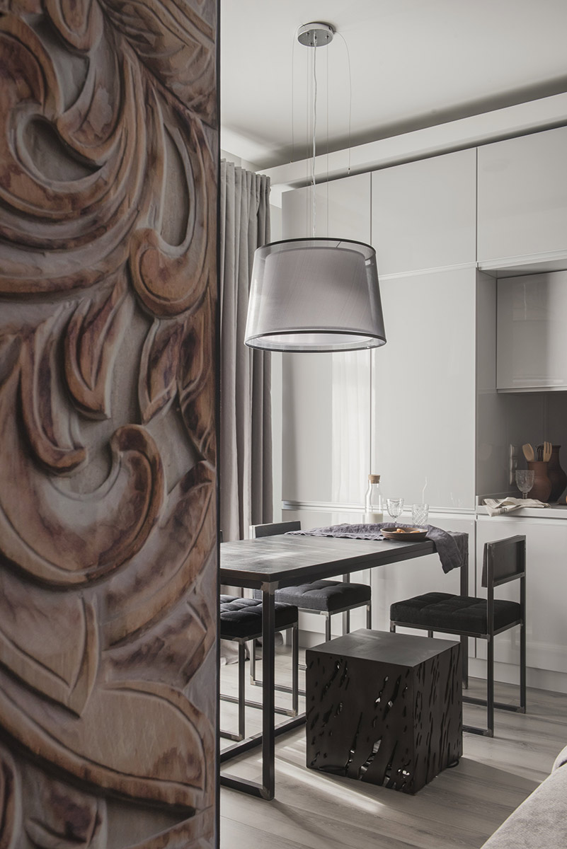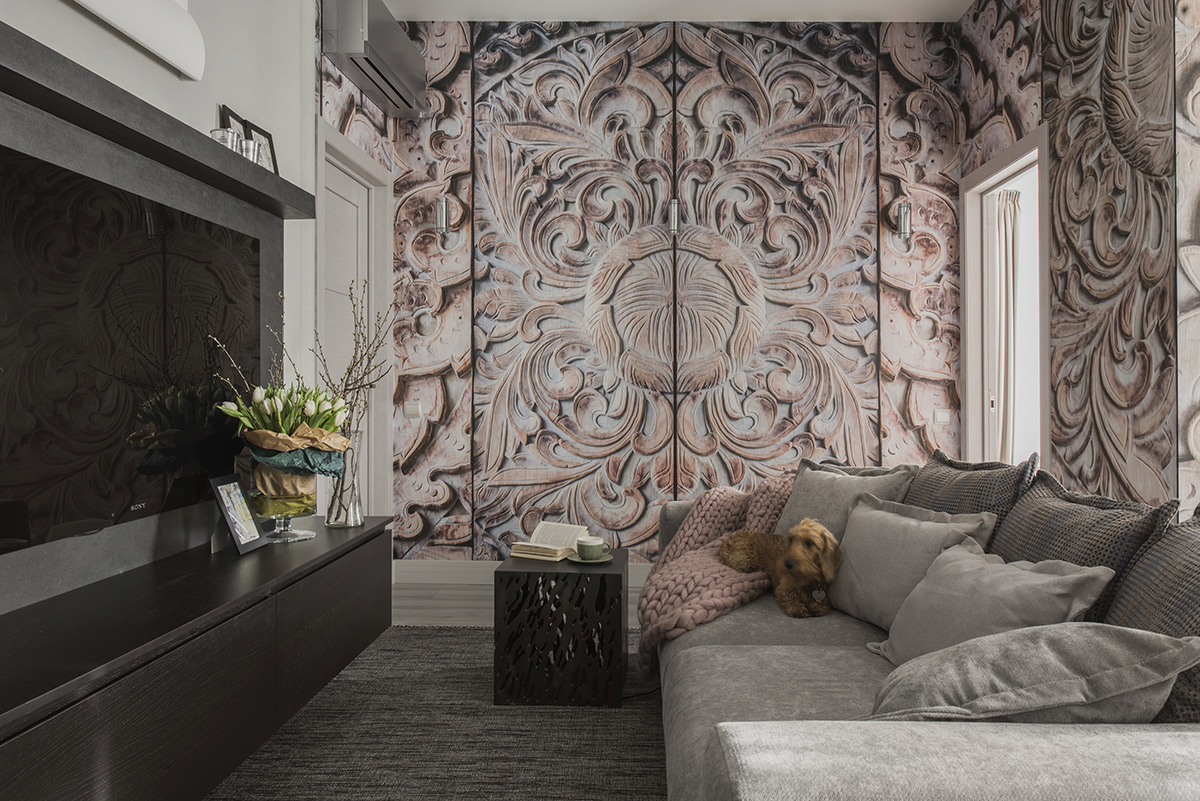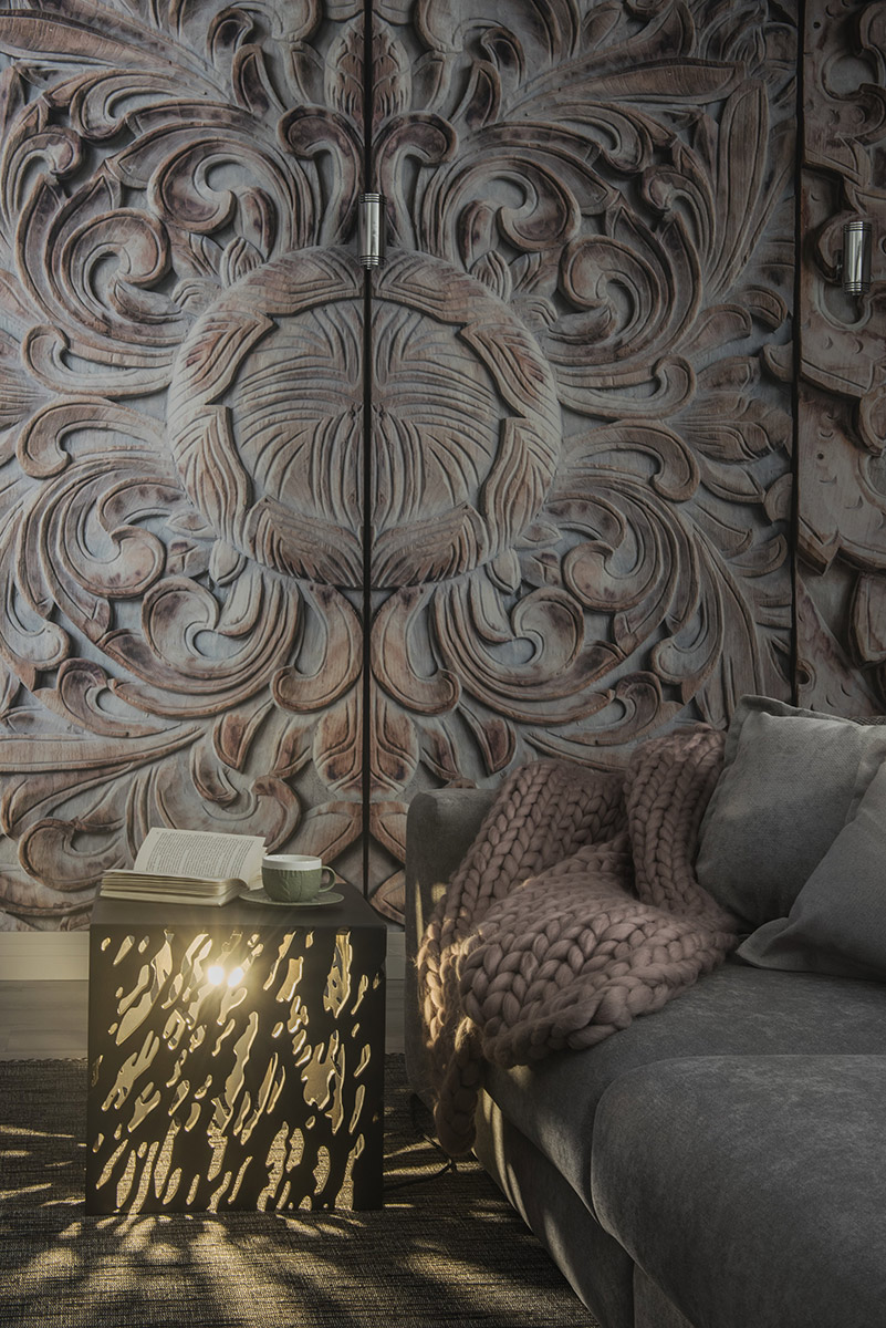Центр квартиры — глубокий мягкий диван — «гнездо», вокруг которого выстраиваются все помещения и функции пространства. Огромное фотопанно с резным деревянным орнаментом — это сильный стилеобразующий акцент. Вместе с грубоватой сварной мебелью, которую сознательно не красили, оно работают на образ «дома ручной работы». Хотя все остальные предметы обстановки незаметны и достаточно безлики.