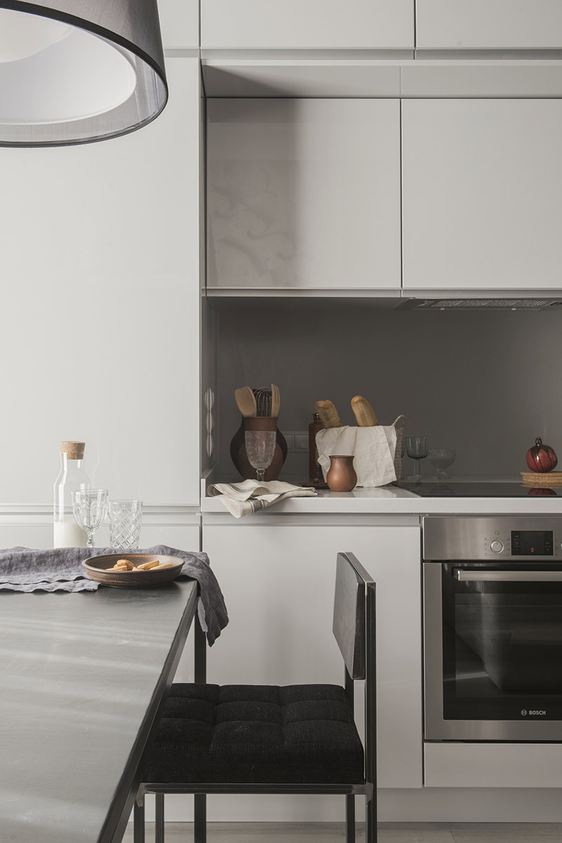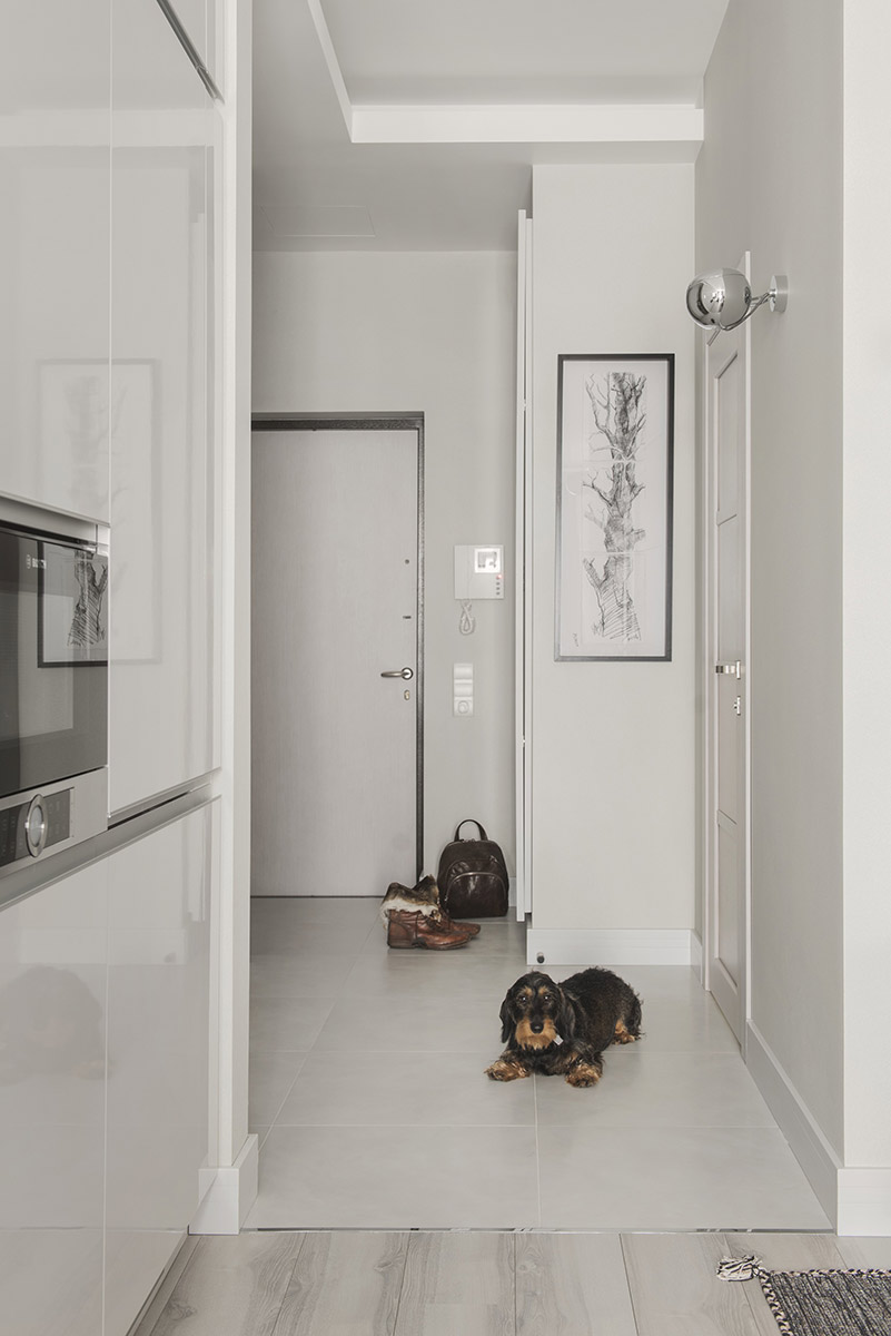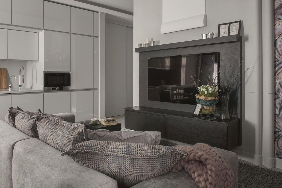 Вся корпусная мебель сделана как «продолжение стен»: кухня, утопленная в нишу, гардеробные шкафы. Инородное пятно телевизора встроено в единую конструктивно-мебельную композицию.