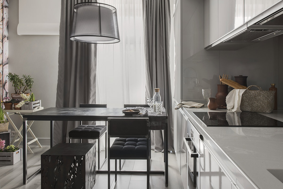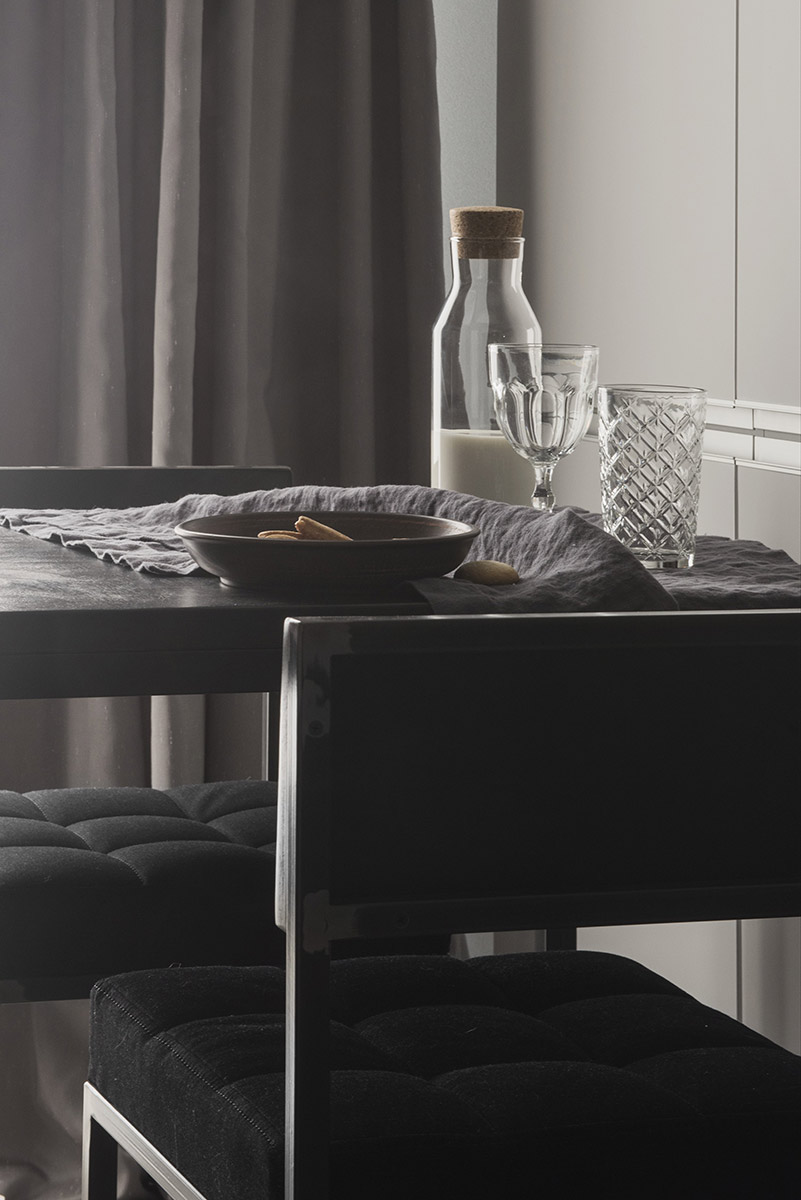 В зоне столовой тонкий ажур сварного каркаса, грубая деревянная столешница напротив яркого света и льняные текстуры — это ощущение «голландского» утра. Не хватает только морского бриза и колыхающейся шторы...