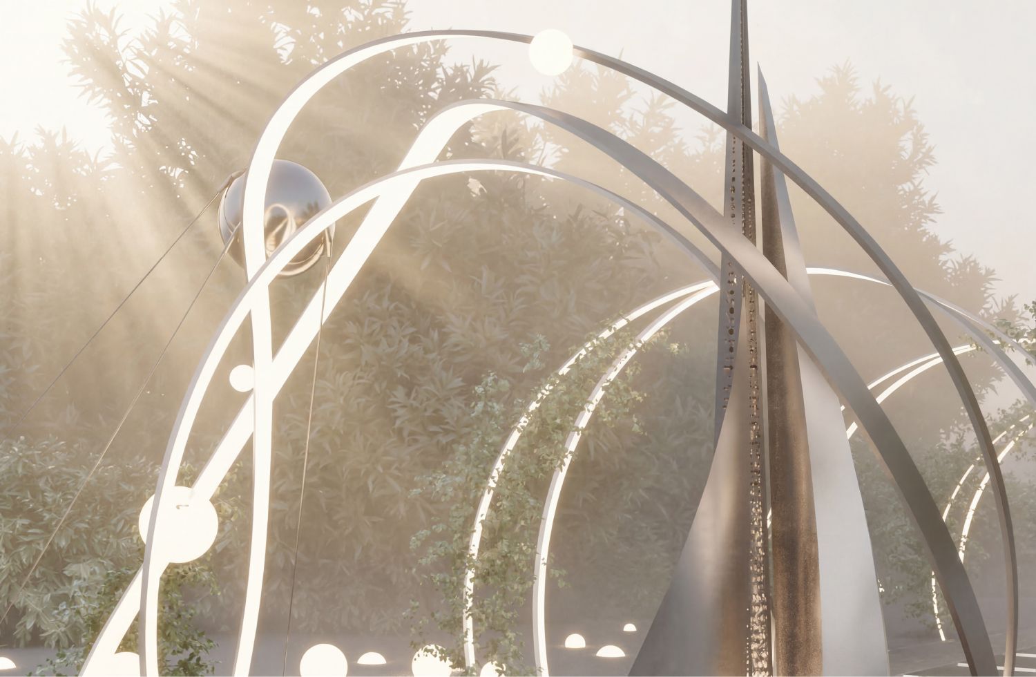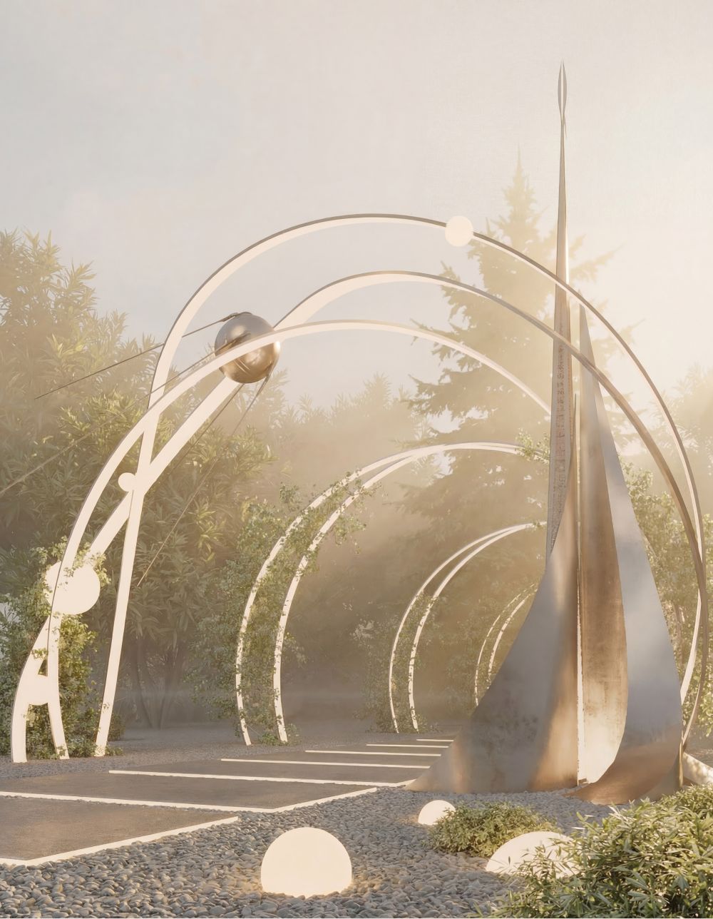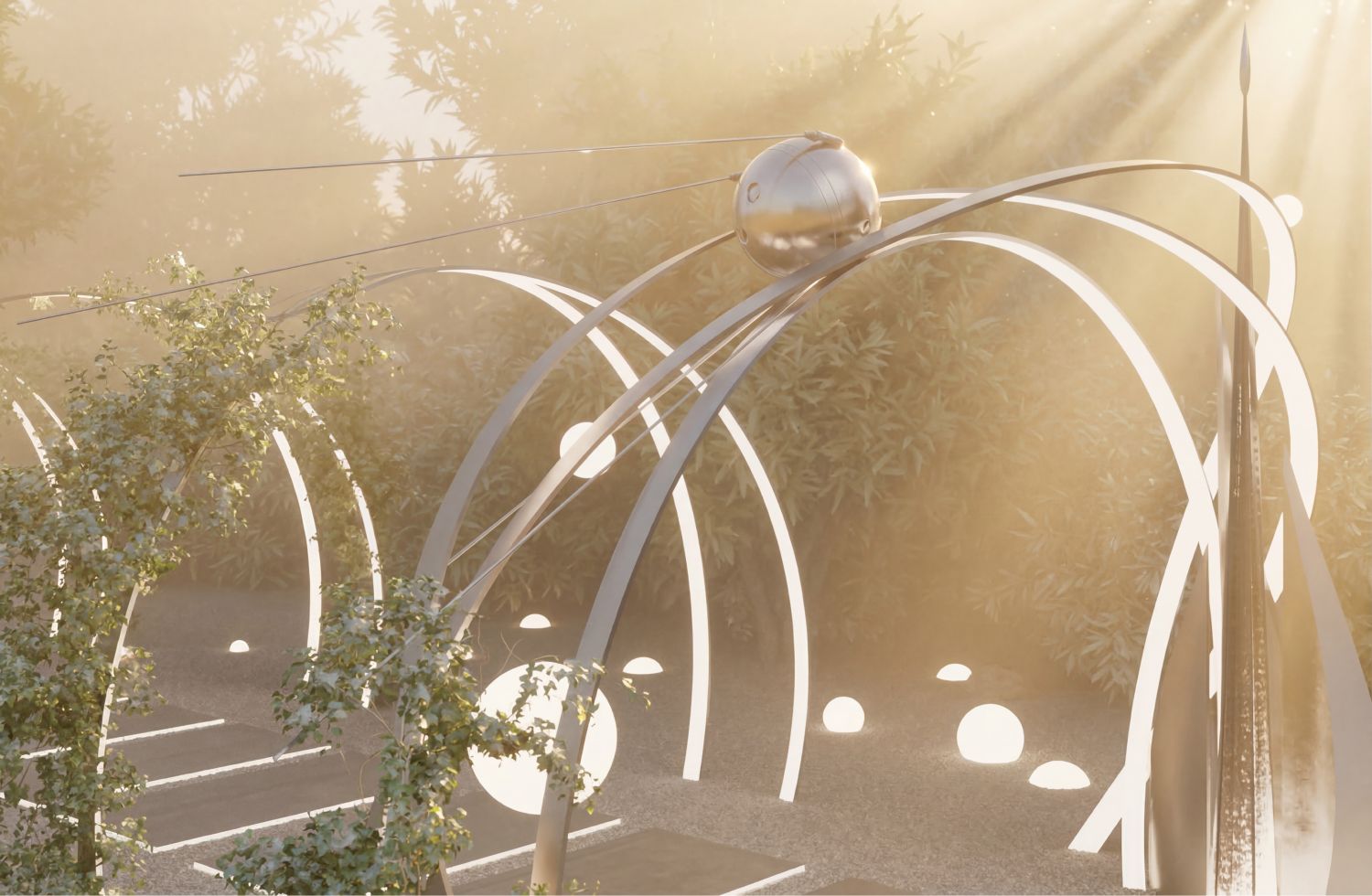 Дорожка со встроенными светильниками ведёт вглубь сквера. Почва вокруг засыпана галькой, что перекликается с морским побережьем, расположенным неподалеку. По периметру хаотично разбросаны сферические светильники — звёзды, упавшие с неба. У оснований арок высажены плетущиеся растения. Со временем они оплетут металл, соединяя рукотворное с живым, — как знак: космос начинается с этой земли.