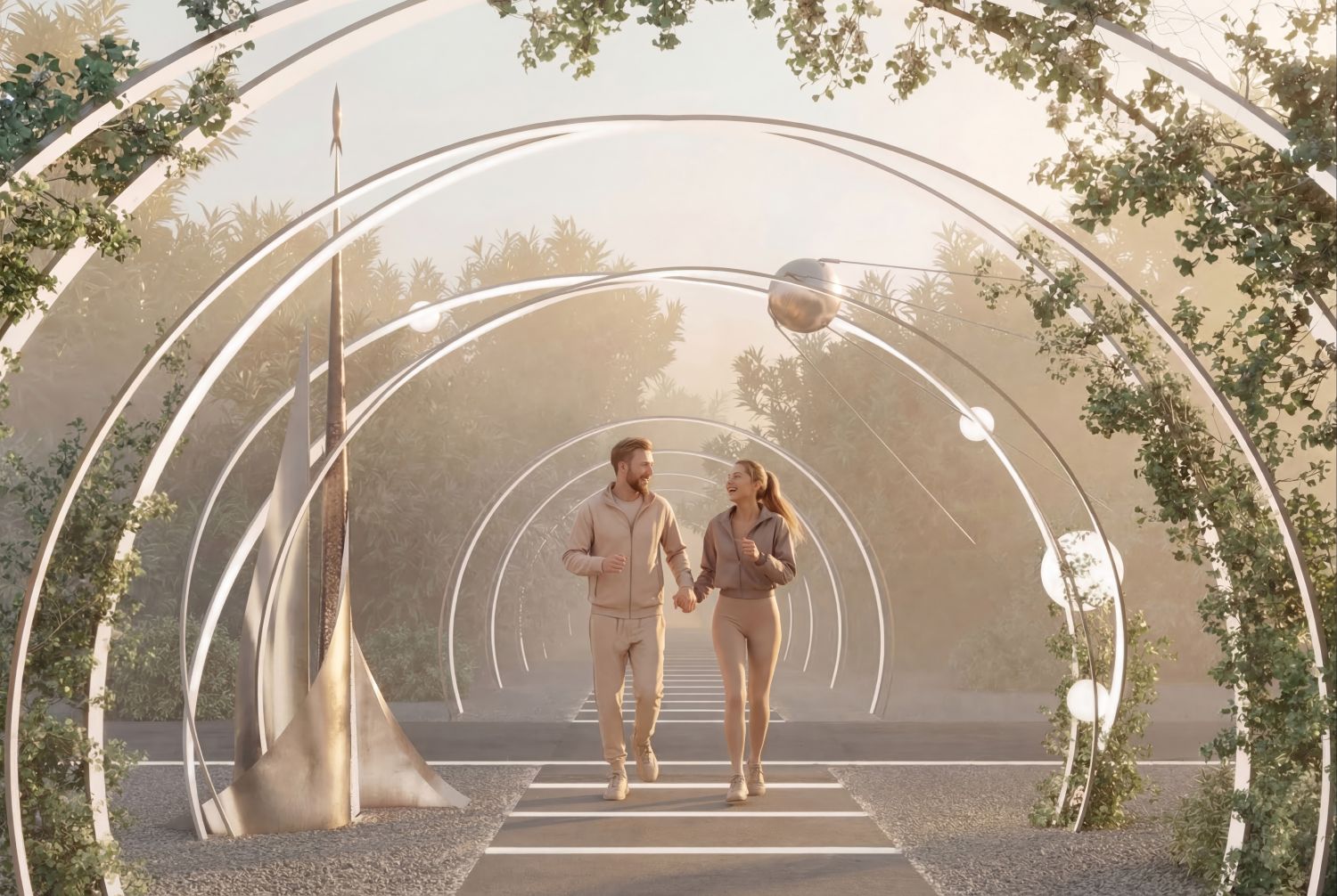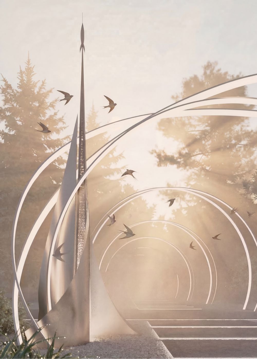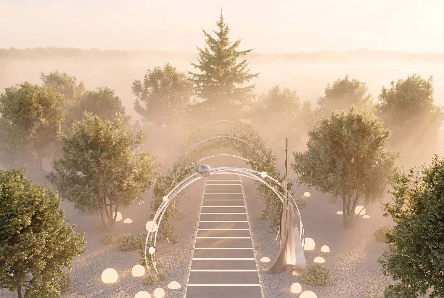 Дорожка со встроенными светильниками ведёт вглубь сквера. Почва вокруг засыпана галькой, что перекликается с морским побережьем, расположенным неподалеку. По периметру хаотично разбросаны сферические светильники — звёзды, упавшие с неба. У оснований арок высажены плетущиеся растения. Со временем они оплетут металл, соединяя рукотворное с живым, — как знак: космос начинается с этой земли.