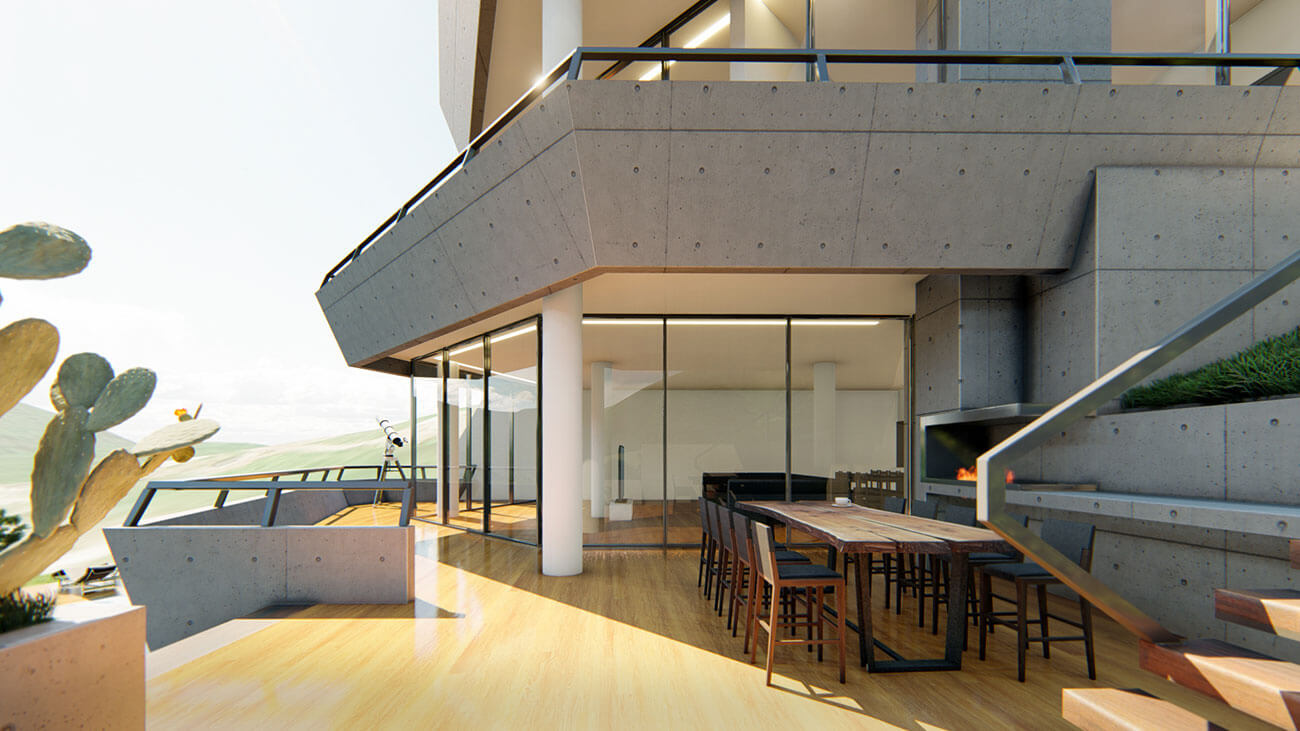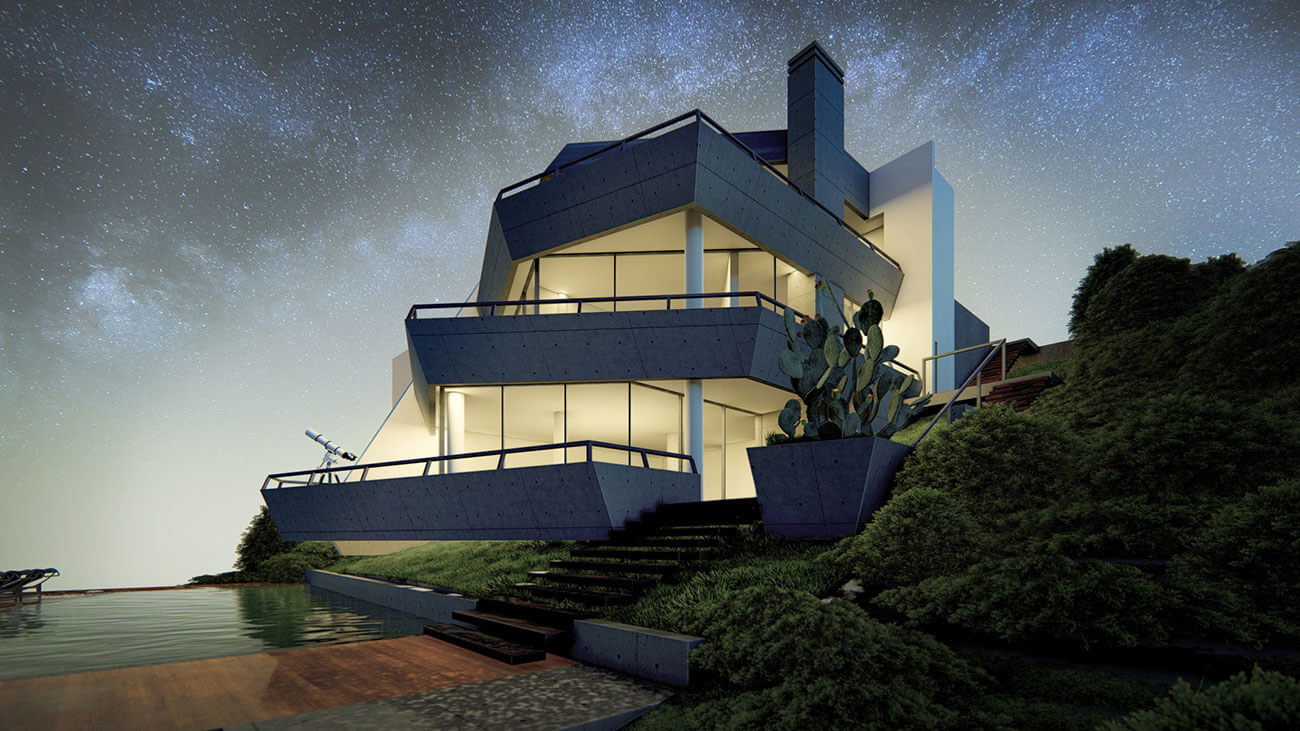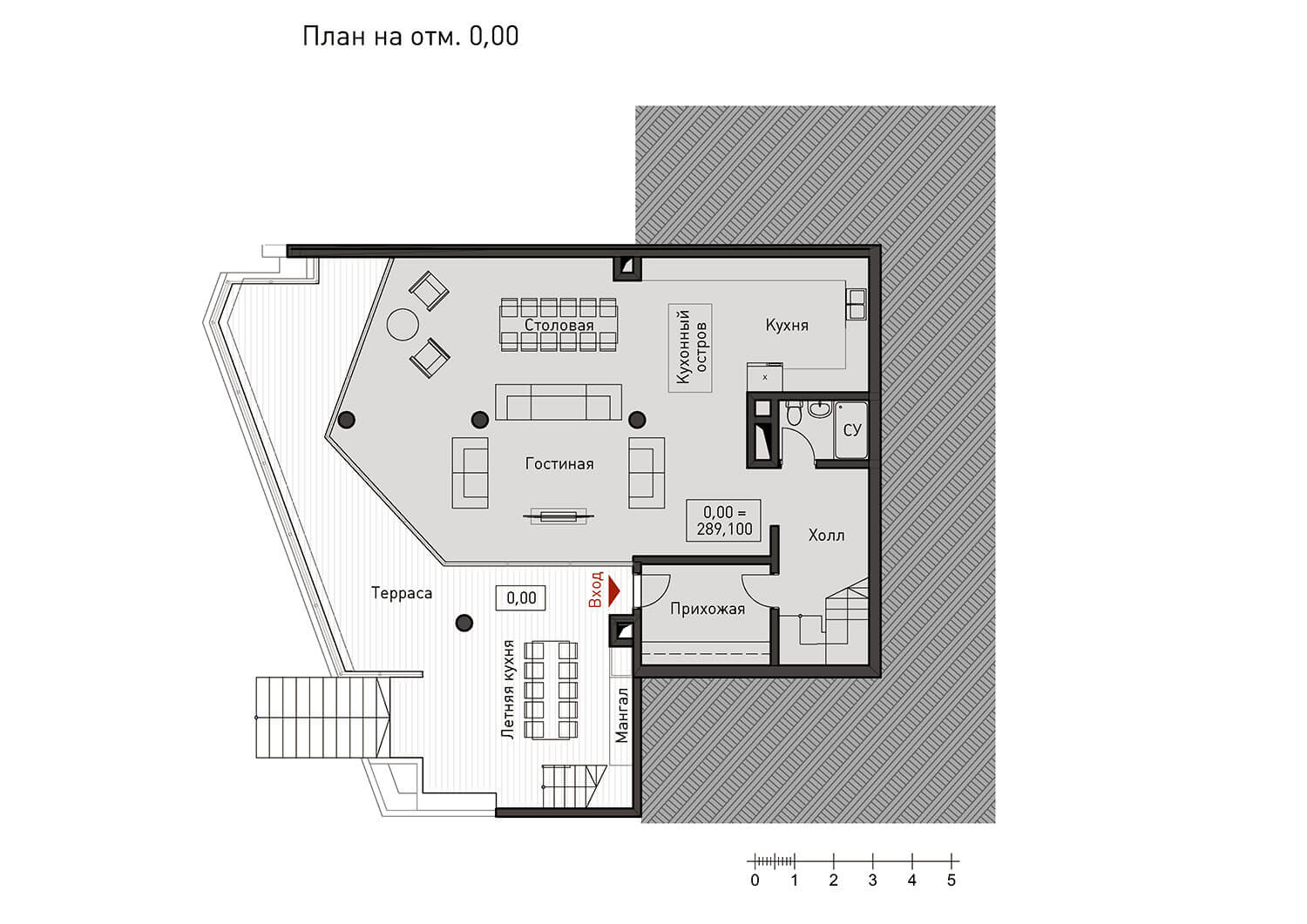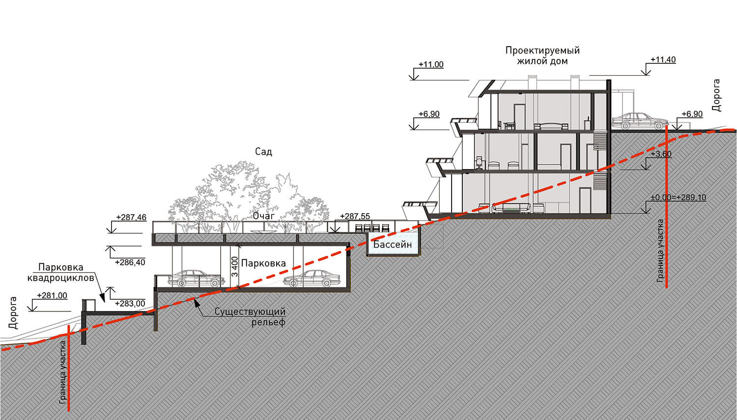 Дом трехэтажный. Подъезд имеется как с верхней, так и с нижней части участка. Здание интегрировано в склон. От дома, расположенного на смежном участке, отделен глухой стеной. На первом этаже при входе в гостиную расположена летняя кухня с мангальной зоной. На каждом этаже при жилых помещения расположены террасы, ограждение которых выполнено из шлифованного бетона.