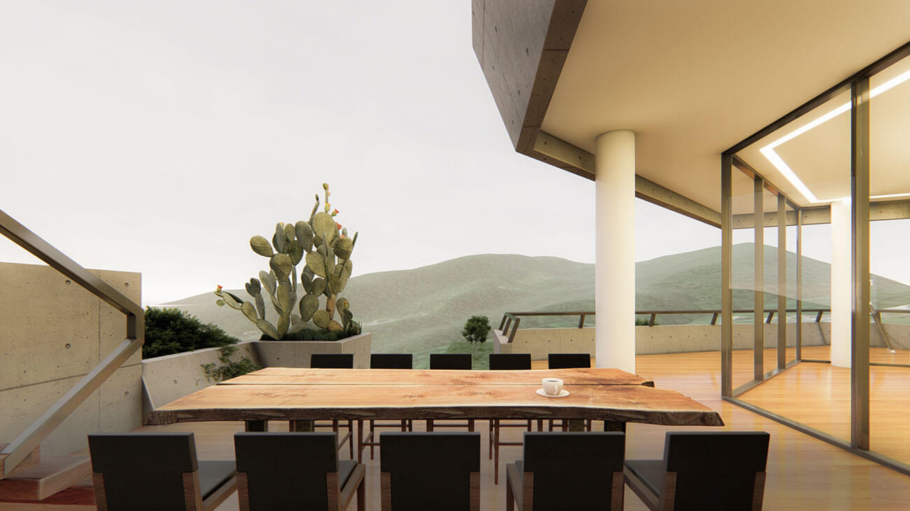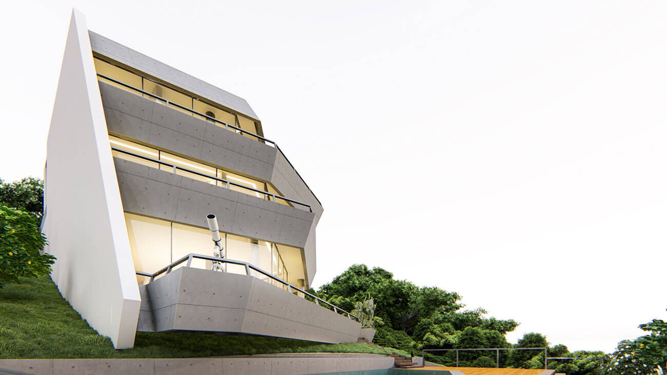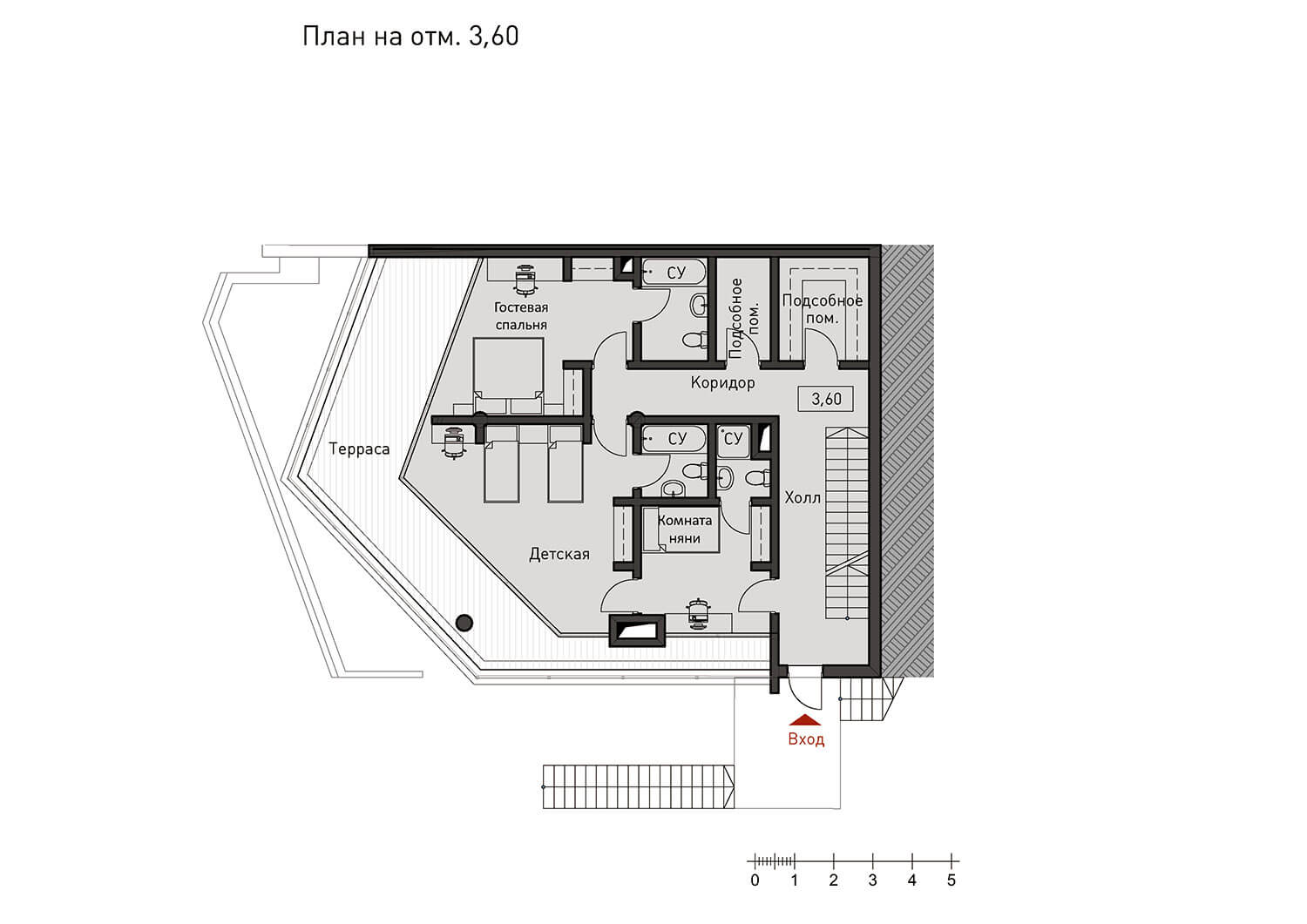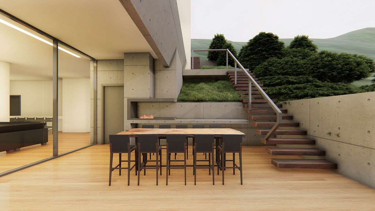 Дом трехэтажный. Подъезд имеется как с верхней, так и с нижней части участка. Здание интегрировано в склон. От дома, расположенного на смежном участке, отделен глухой стеной. На первом этаже при входе в гостиную расположена летняя кухня с мангальной зоной. На каждом этаже при жилых помещения расположены террасы, ограждение которых выполнено из шлифованного бетона.