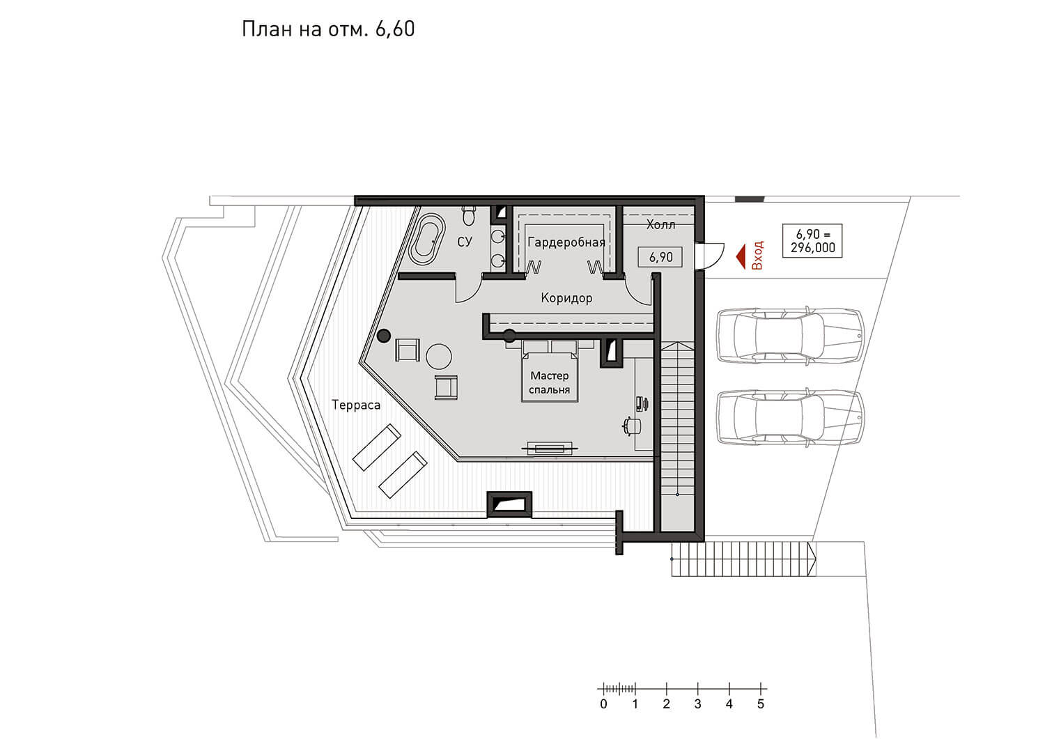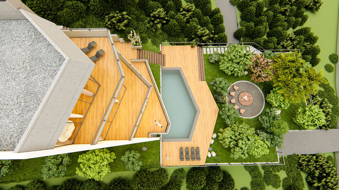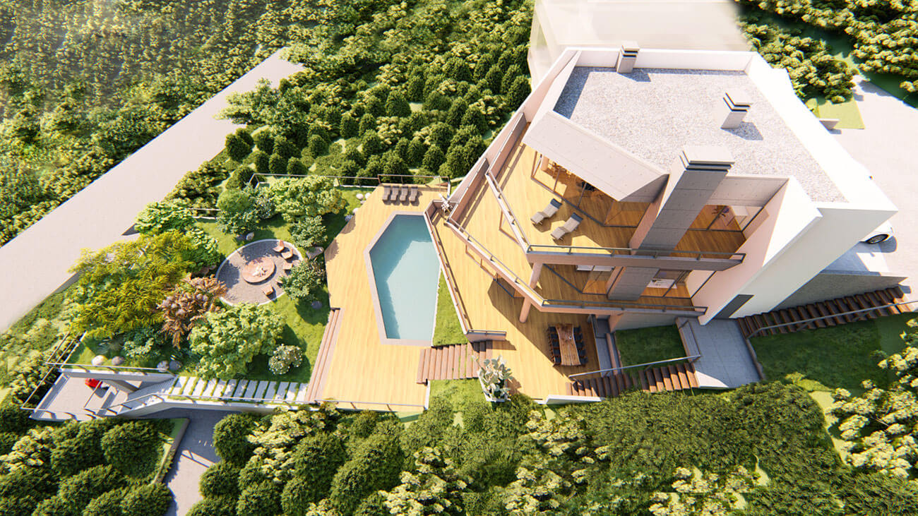 Концепция освоения территории продиктована контекстом окружающей застройки. Участок имеет значительный перепад высот. Дом расположен в верхней части владения, откуда открываются панорамные виды на окружение.