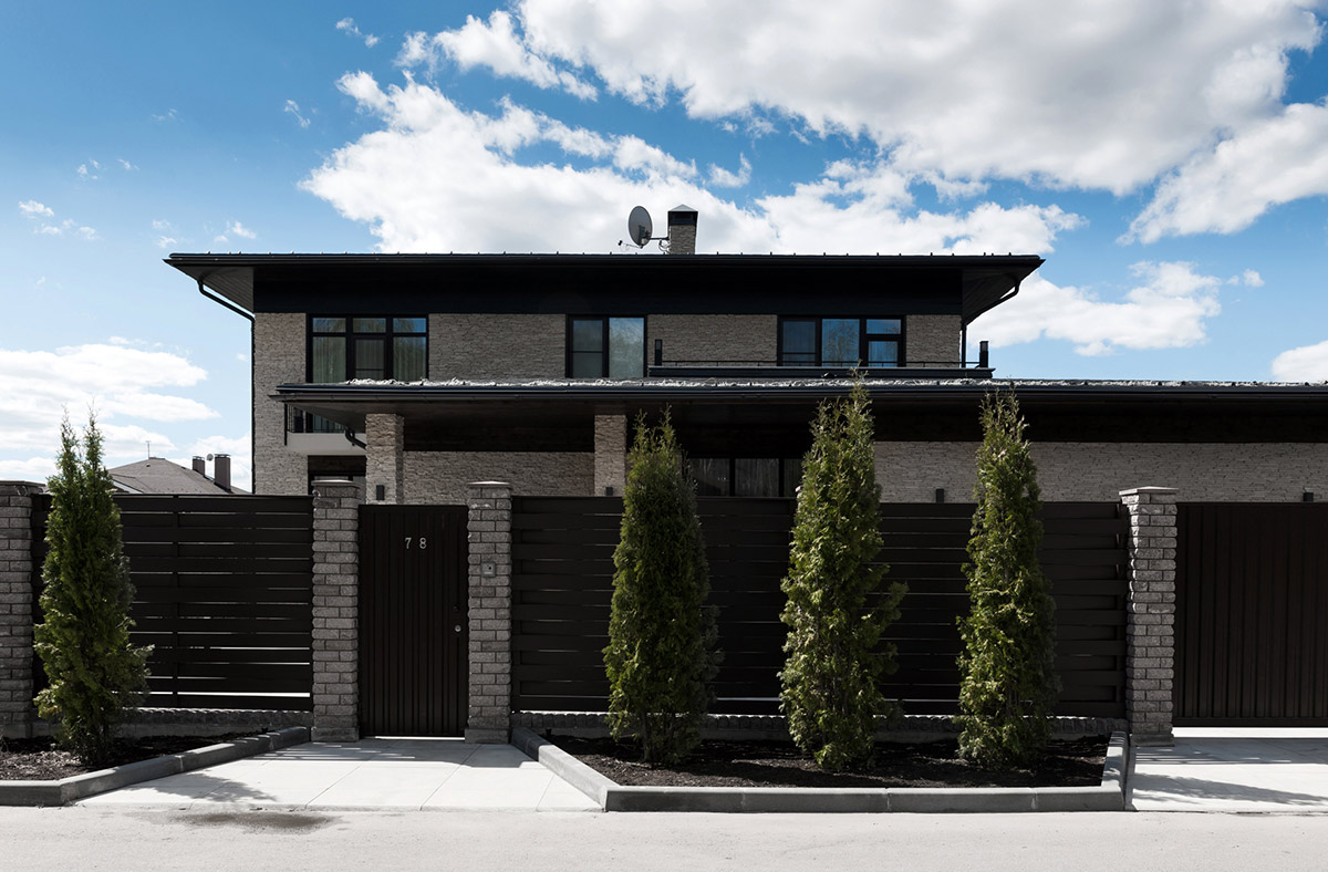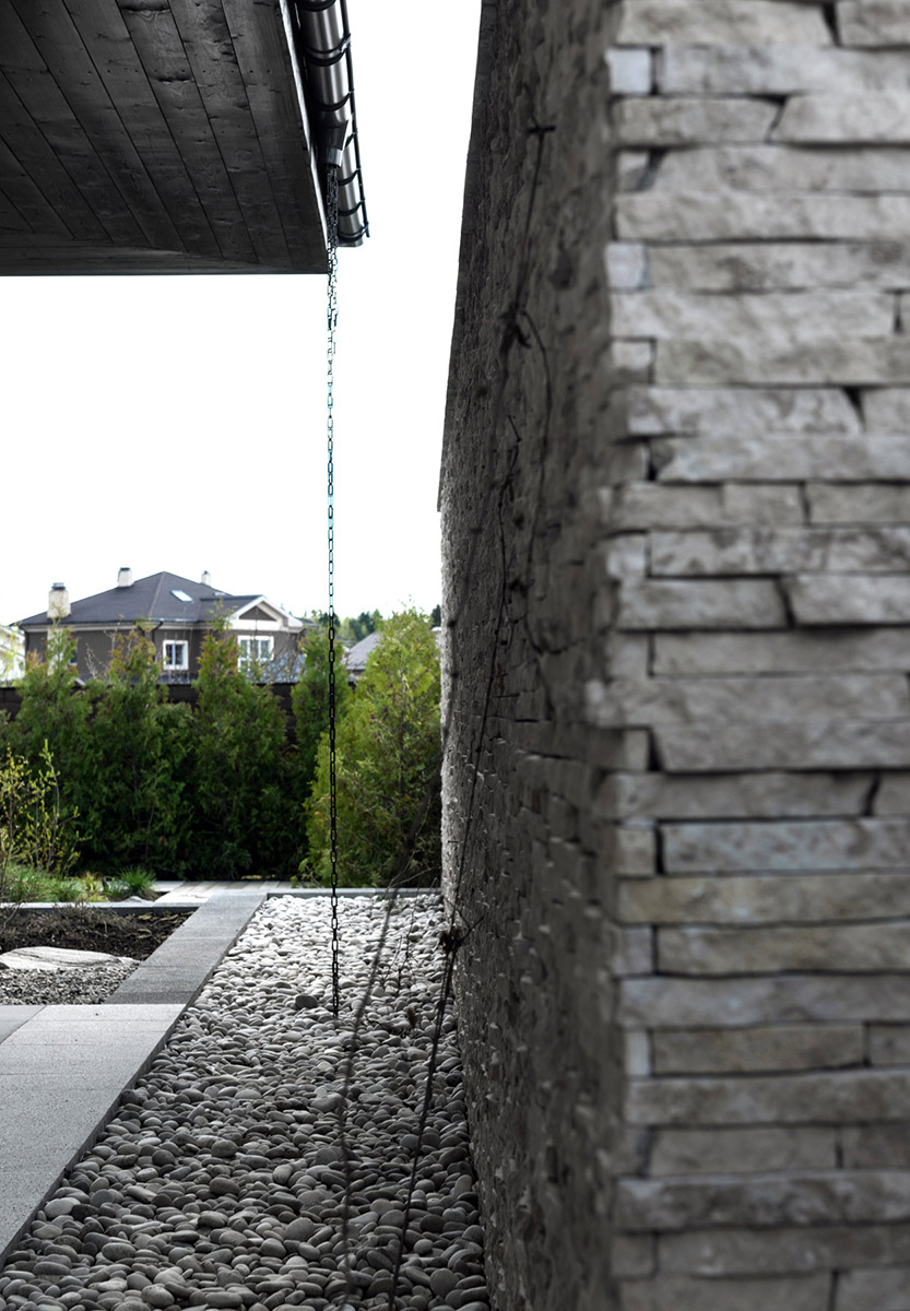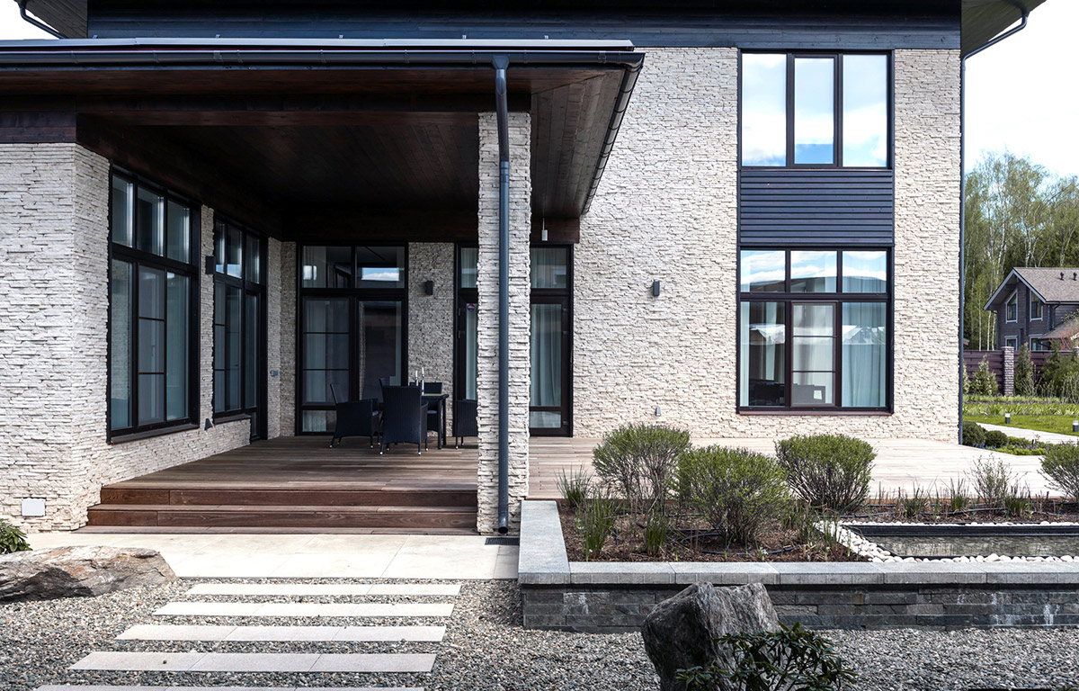 Двухэтажная вилла площадью 780 м² находится на территории Москвы. Она построена из монолита с заполнением кирпичом и облицована доломитом серым «лапша».