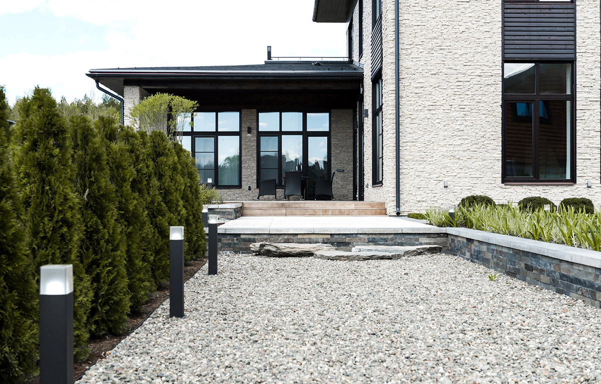 Планировка виллы классическая линейная. Двор — каре. Гостевой дом с патио расположен через гравийную реку.
