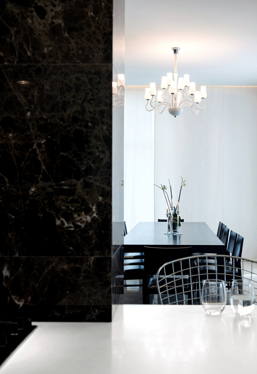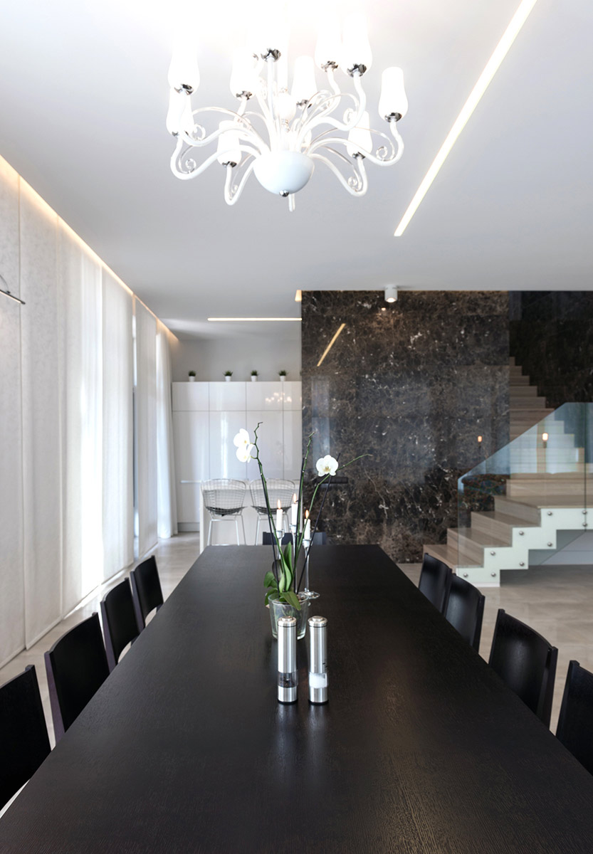 Освещение продумано таким образом, что свет разбит по периметру, на колоннах и стенах. Управление светом осуществляется из разных точек квартиры. Все помещения оснащены датчиками движения и ночниками, что необходимо для комфортной жизни.
