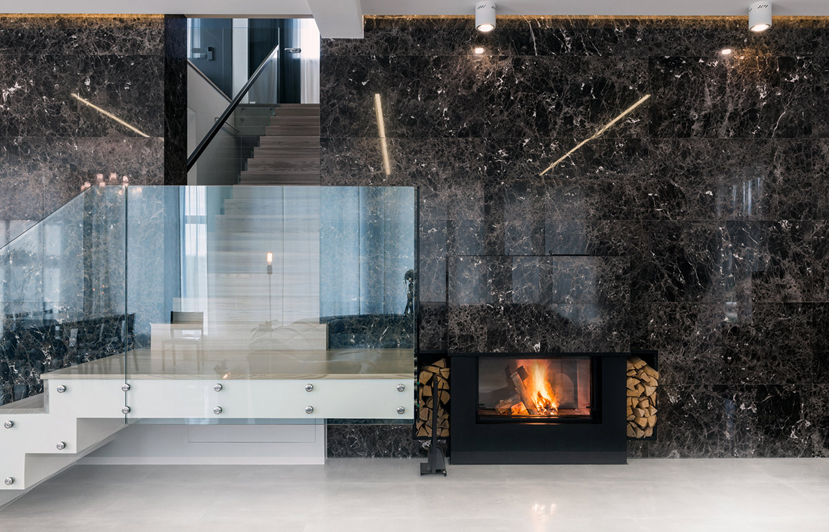 В гостиной установлен камин с двойным остеклением, он также работает в кинозале.