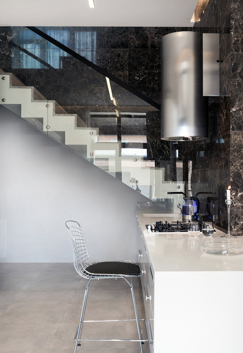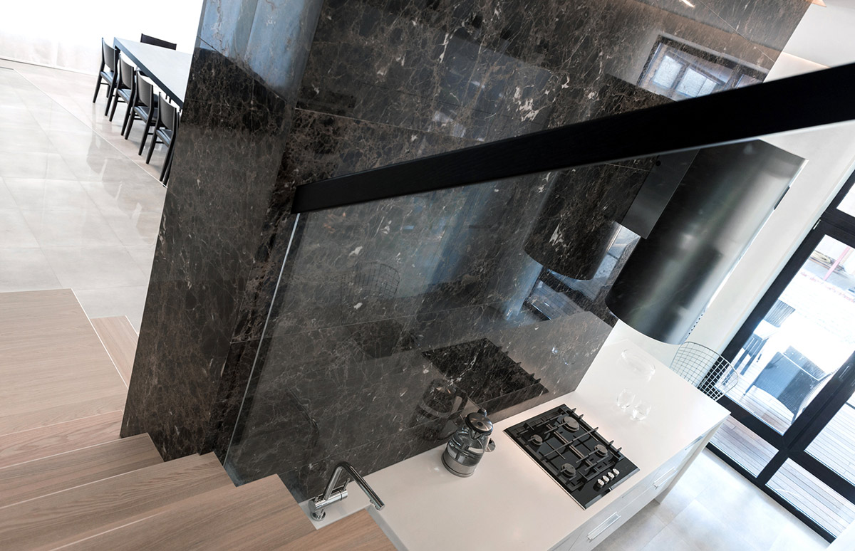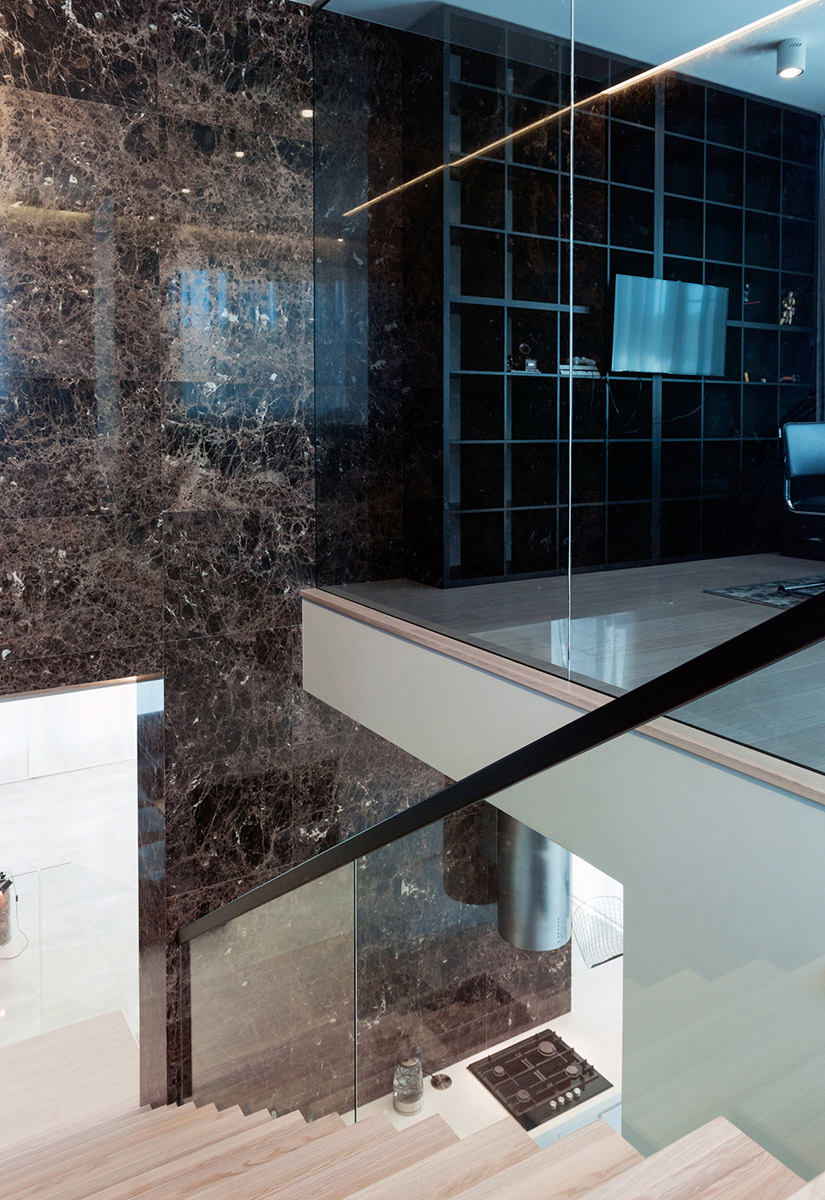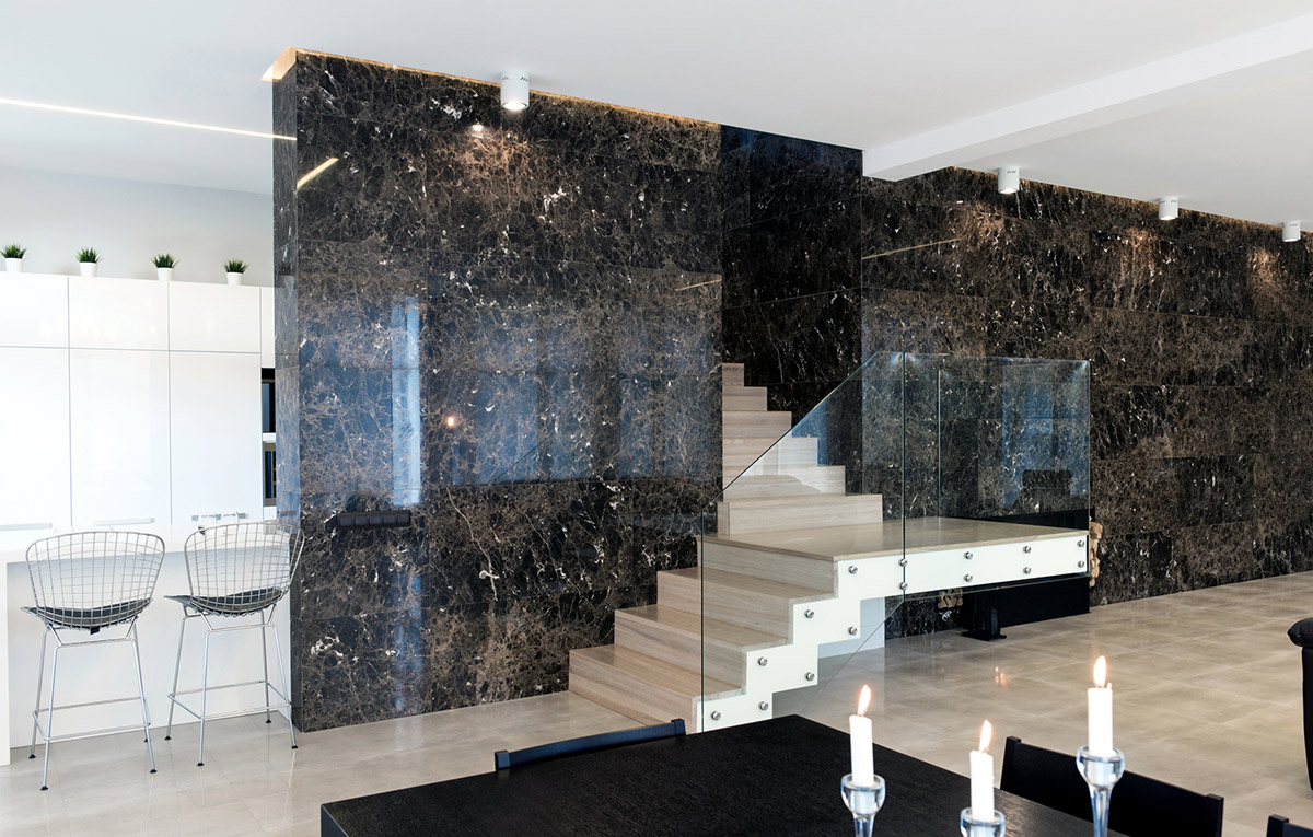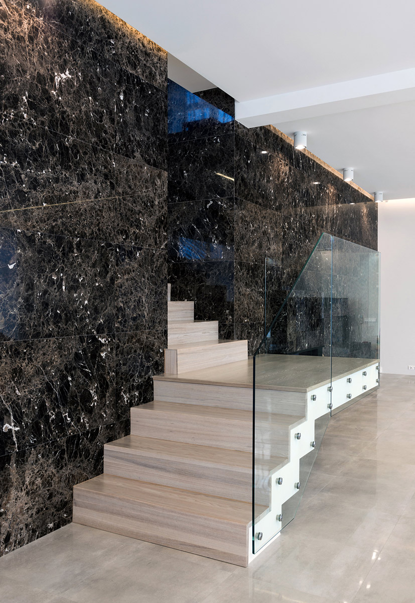На первом этаже находятся лаунж-зона, кухня-столовая, домашний кинотеатр, гостевая спальня, хозблок, гараж, спа-зона с сауной и бассейном. Центральный элемент дома — лестница, ведущая на второй этаж. Поднимаясь, можно видеть кухню и кабинет второго этажа. Стена лестницы облицована мрамором «Эмперадор дарк».