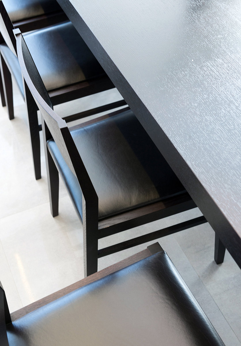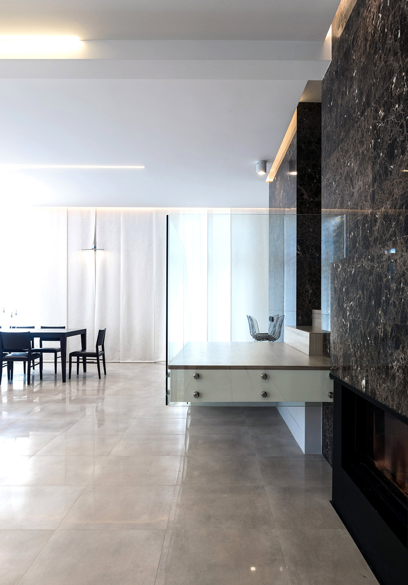 Планировка линейная, большие помещения дискретны и перетекают друг в друга. Перегородки выполнены из каленого стекла с возможностью изоляции шторами. Алюминиевые направляющие позволяют легко скользить текстилю.