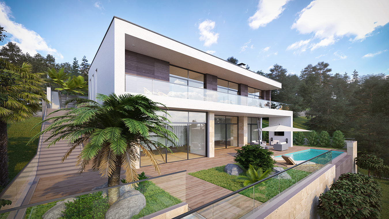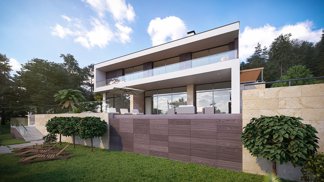 Рельеф участка имеет достаточно сильный уклон с задней стороны дома, поэтому было принято решение заглубить первый этаж в грунт с северо-востока. На территории проведено террасирование в три уровня с перепадом высот в 4 и 2 м. На верхнем уровне расположены входная группа и паркинг. Средний уровень соответствует отметке пола нижнего этажа, там обустроена зона придомовой террасы с бассейном и клумбами. Нижняя терраса представляет собой озелененную площадку с беседкой.