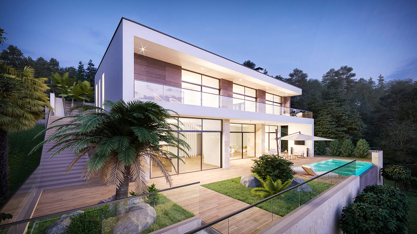 Участок расположен на склоне горы с панорамным видом на Чёрное море в окружении лесного массива, на высоте 218,35 метра над уровнем моря. Данные внешние факторы определили выбор стиля минимализм, панорамного остекления, стирающего грань между интерьером и природой. Все жилые помещения ориентированы на юг, юго-запад. С северо-востока находится въезд на участок, что обусловило местоположение входной группы и всех технических помещений. Также с северо-восточной стороны участка обустроен паркинг с перголой на 4 машино-места.