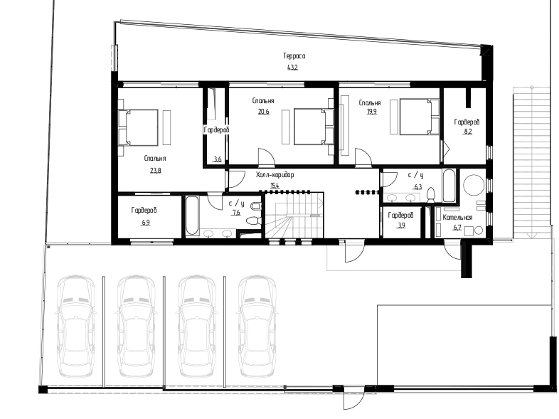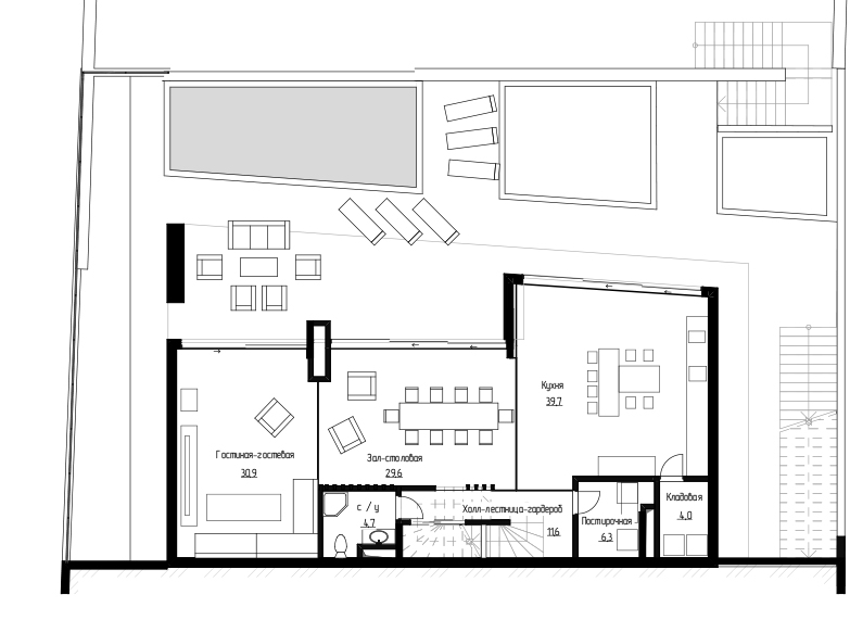 Эргономика внутреннего пространства всецело подчинена функциональности. На первом этаже размещены просторная кухня-гостиная, спа-зона, кладовые и технические помещения. На втором этаже — спальни, гардеробные с санузлами.