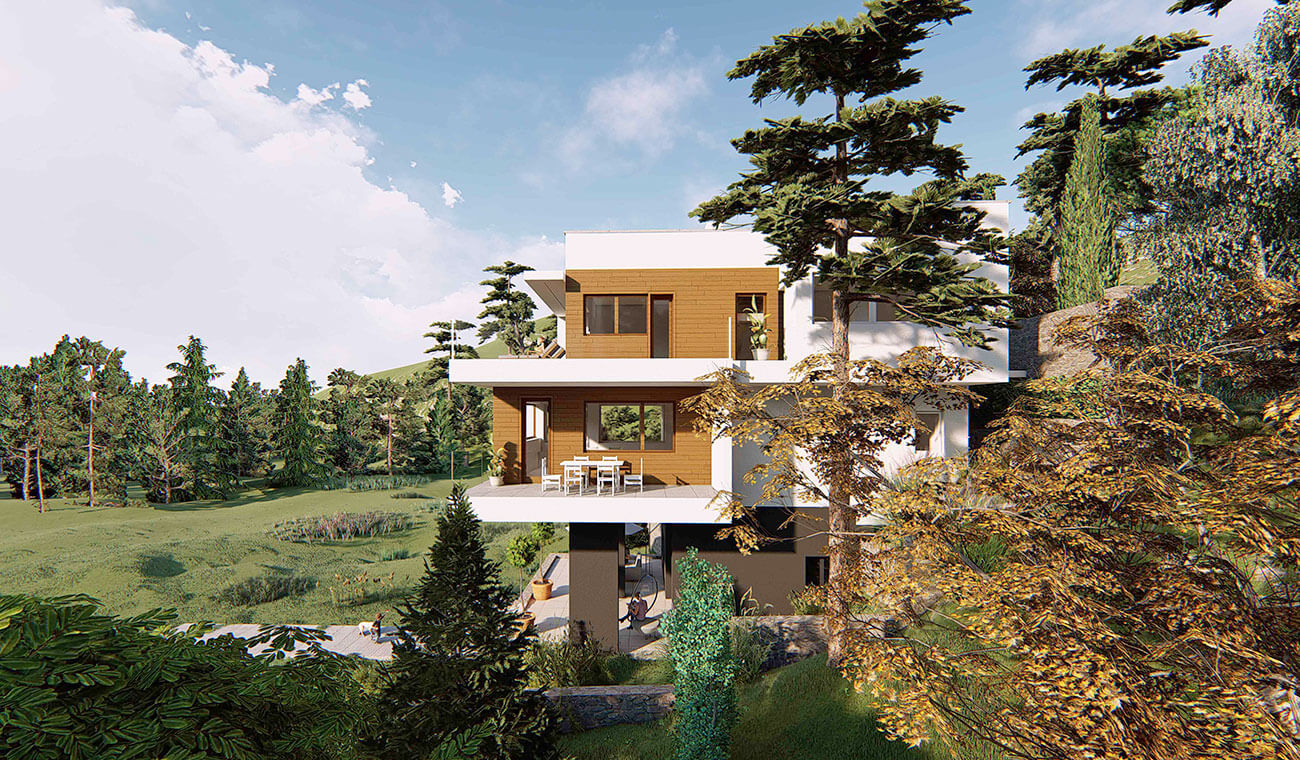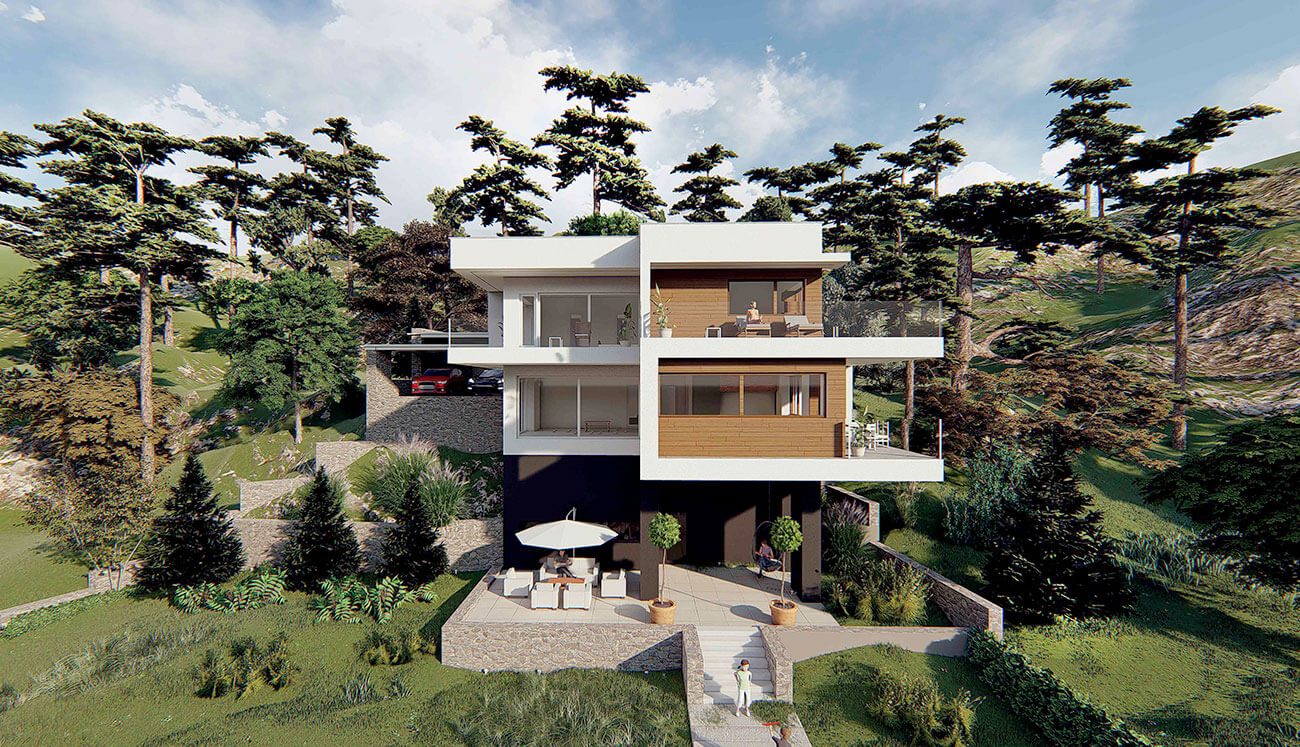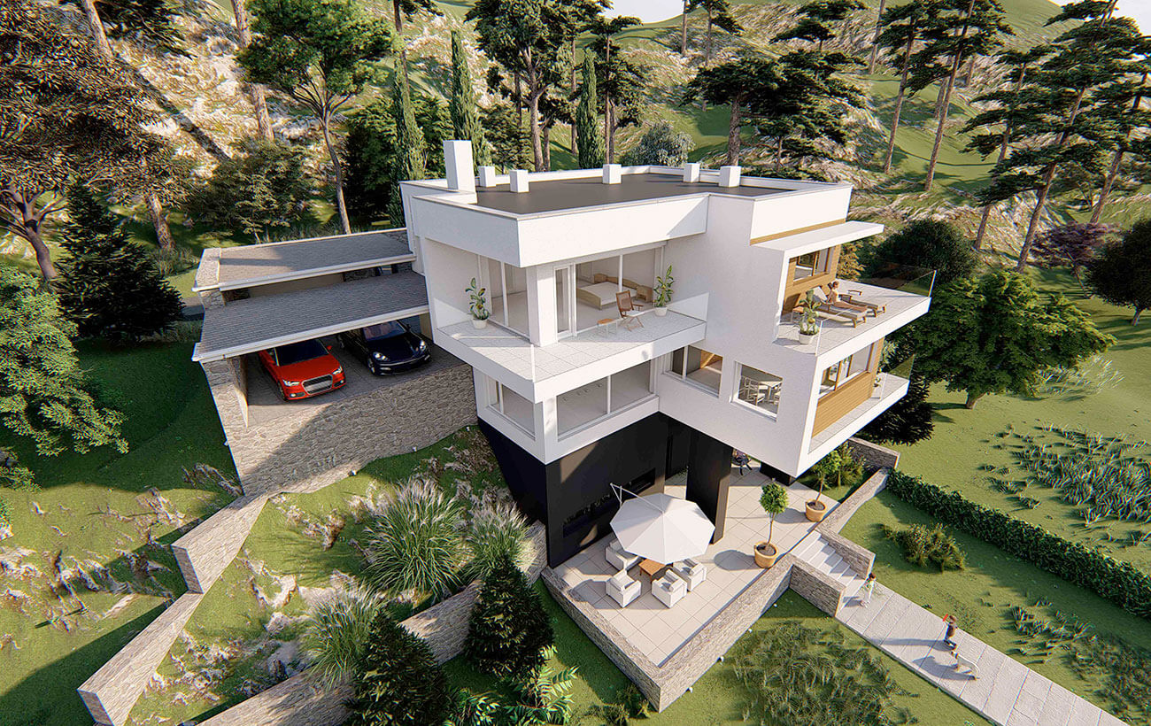 Вилла располагается в Крыму, г. Ялта, пгт. Гурзуф, на маленьком, но видовом участке порядка 6,5 сотки. Перепад высоты от нижней до верхней точки более 13 м. Именно поэтому конфигурация дома ступенчатая, с множеством террас. Для южного берега Крыма это достаточно типичная ситуация, т.к. более 80% рельефа имеет уклон разной крутизны.