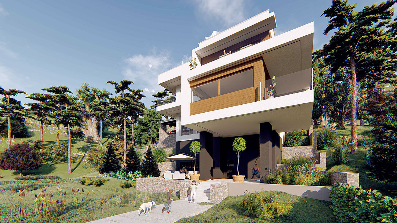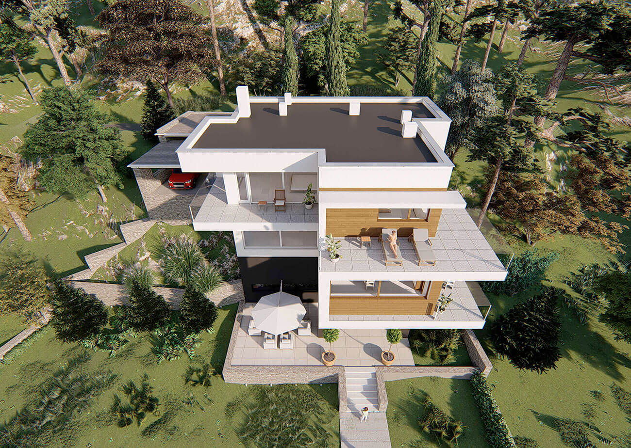 Идея была спланировать виллу таким образом, чтобы все члены семьи имели свою собственную зону отдыха и уединения с видом на море. Кроме того, сделали одну общую террасу с выходом из кухни, для совместного времяпровождения на открытом воздухе всей семьей. Она обращена на восток, утром можно при комфортной температуре завтракать, а вечером в тени поужинать.