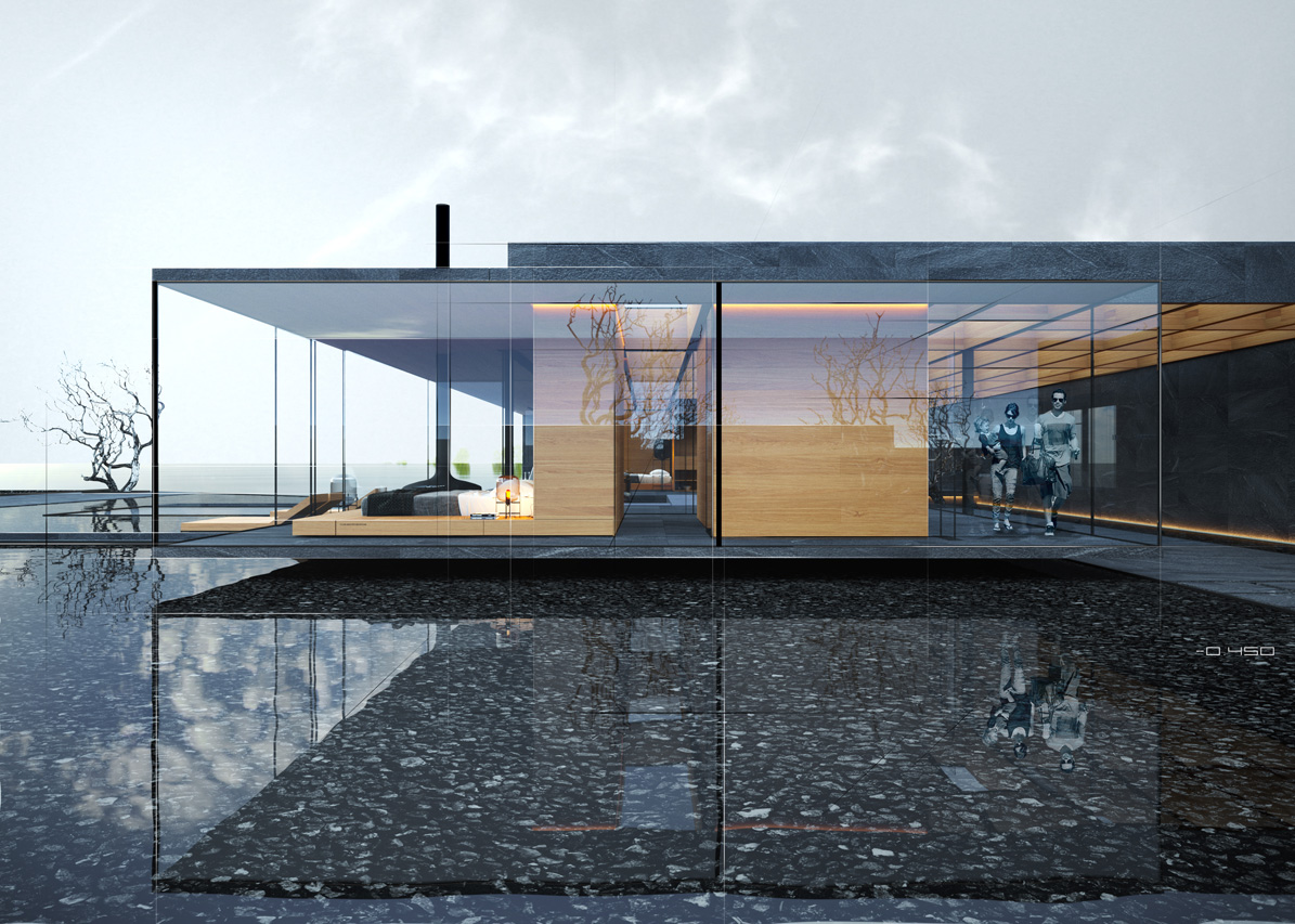 Западный фасад здания консольно вынесен над рекой и абсолютно глухой, он определяет особенности видовых точек с участка. Остекленный южный фасад дает возможность видеть лучшие ракурсы ландшафта и устроить максимально эффективную инсоляцию интерьеров.