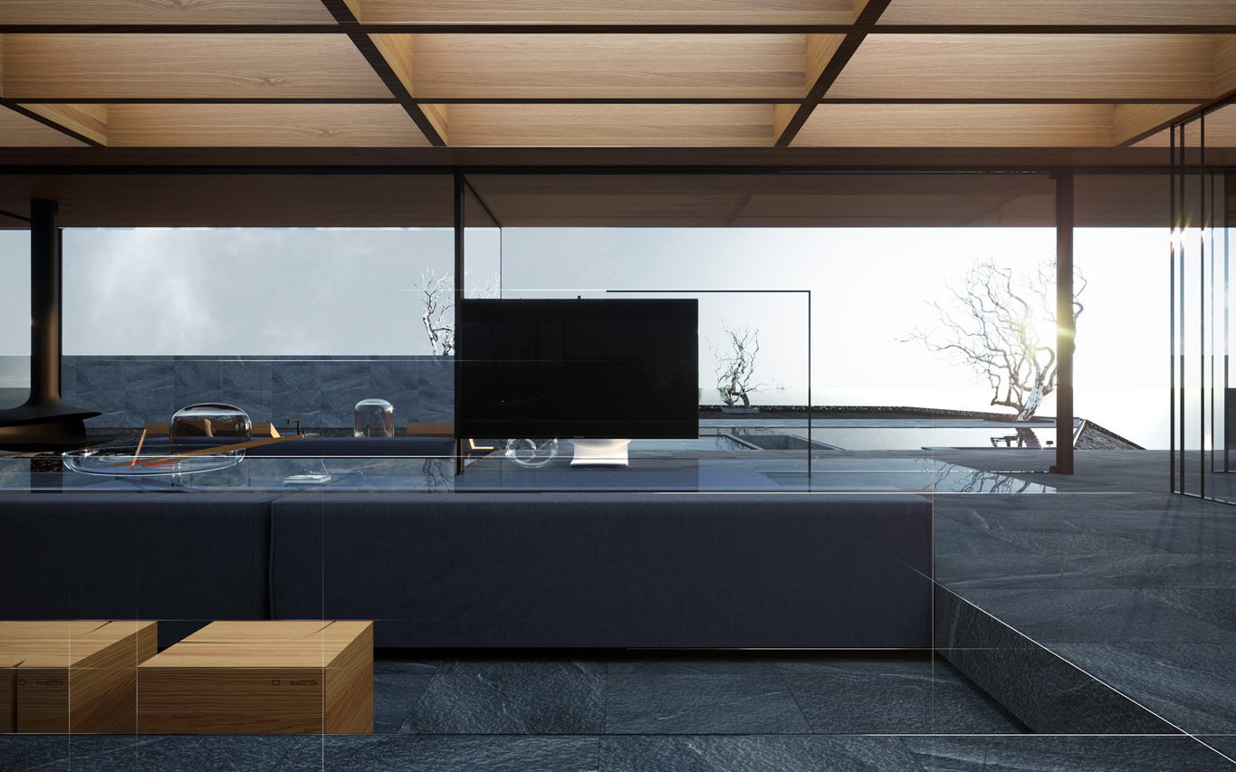 Дно реки и площадки под зеркалом воды на земле в щебне из темного сланца почти совпадают по оттенку и текстуре с Italon Contempora Carbon. В комплексе возникает целостное восприятие интерьеров и архитектуры.