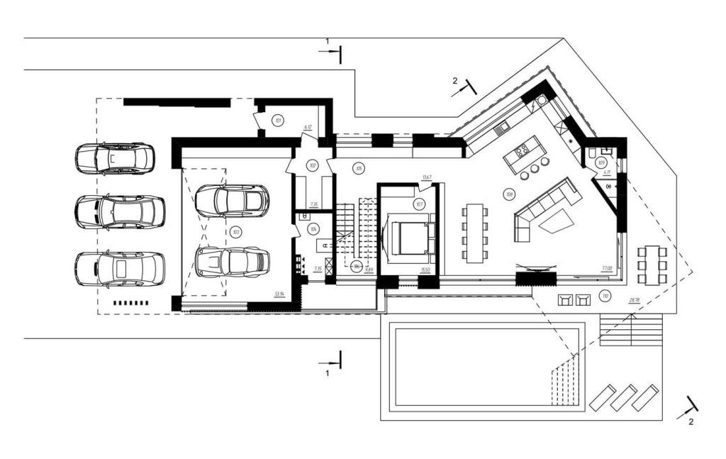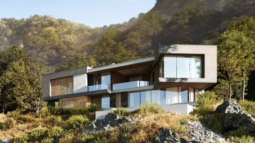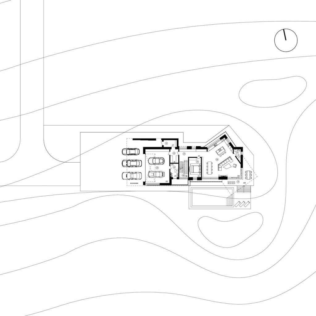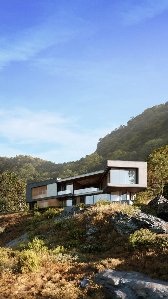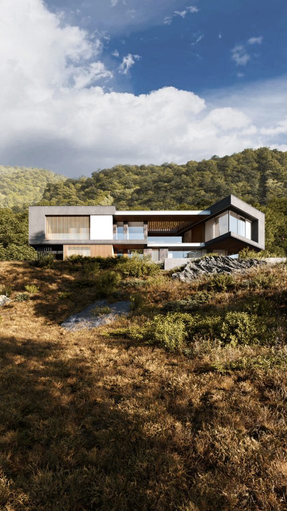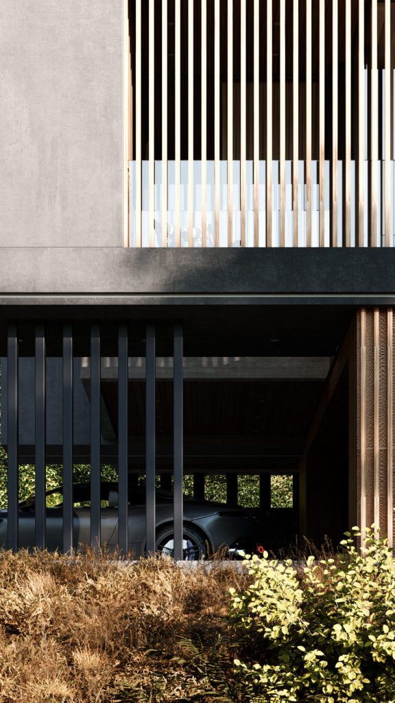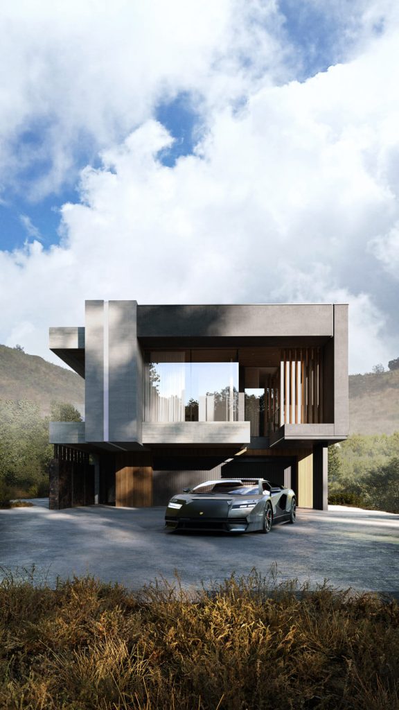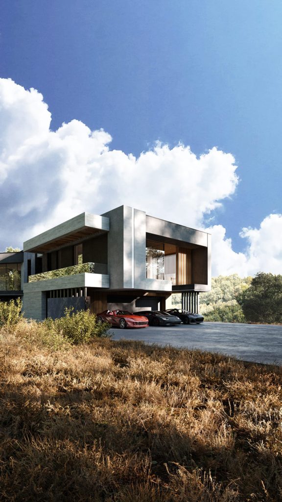 Подъезд к вилле, пролегающий со стороны гор, задаёт тон первому впечатлению посетителей. Въездная группа встречает гостей выразительной консолью второго этажа — кажущейся невесомой, она эффектно парит над парковочной зоной, укрывая автомобили под своим козырьком. В этом акцентирующем выступе на 2 этаже расположены детские спальни, сочетающие приватность с умиротворяющим видом из окон.