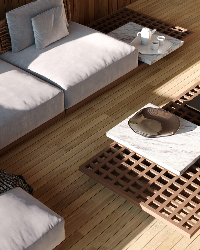 Сердце дома — просторная кухня-гостиная, интерьер которой благодаря раздвижной витражной системе плавно перетекает в уличное пространство к террасе с открытым бассейном. Динамику фасаду придаёт развёрнутый консольный объем мастер-спальни на втором этаже: этот приём не только придает вилле характер и узнаваемость, но и создаёт естественную защиту от палящего южного солнца в гостиной, бережно сохраняя при этом прекрасные виды на море.