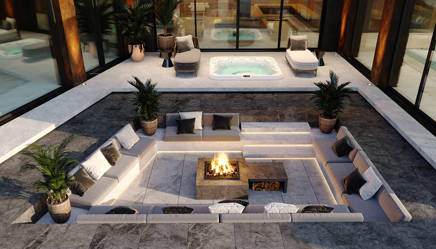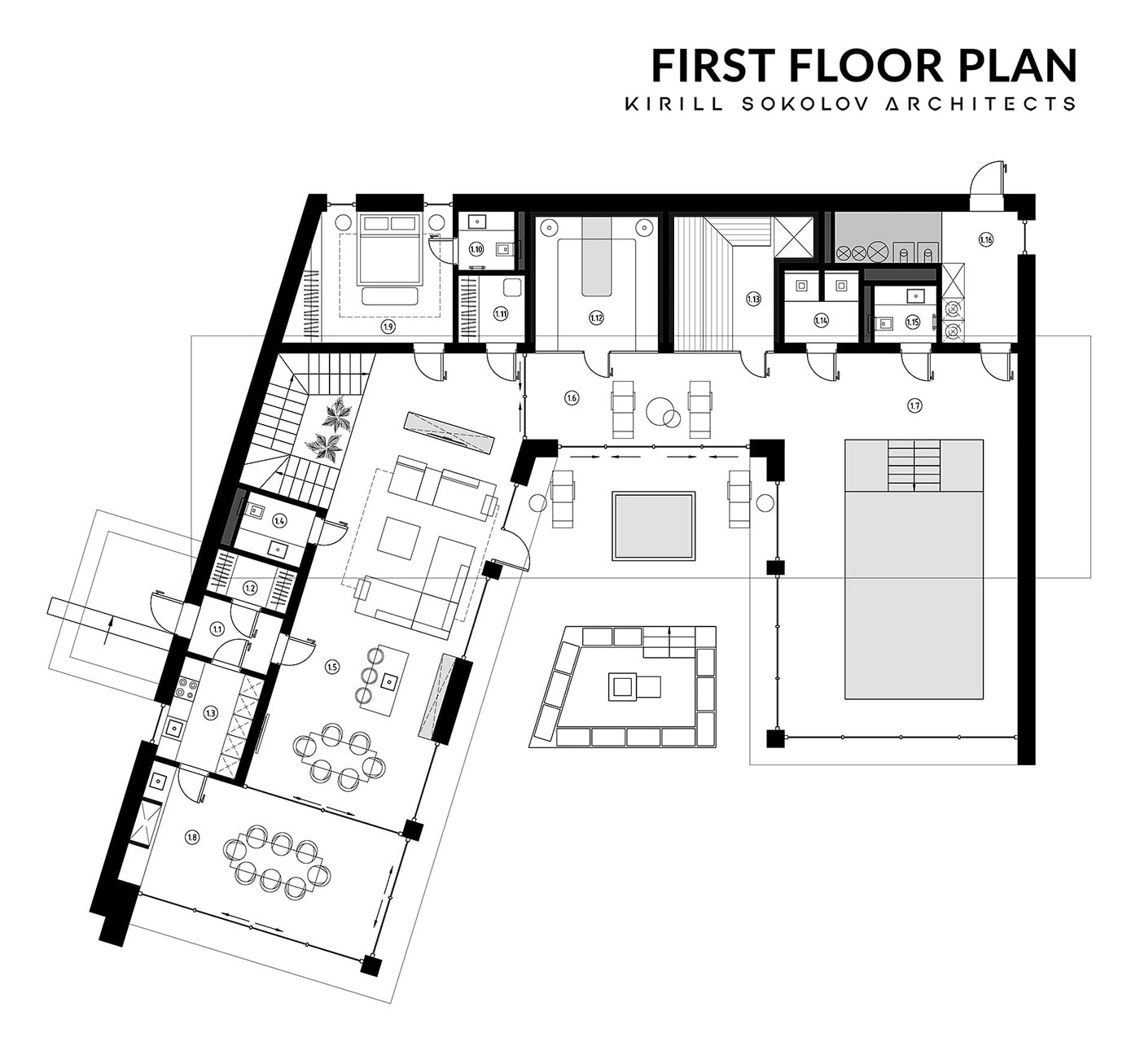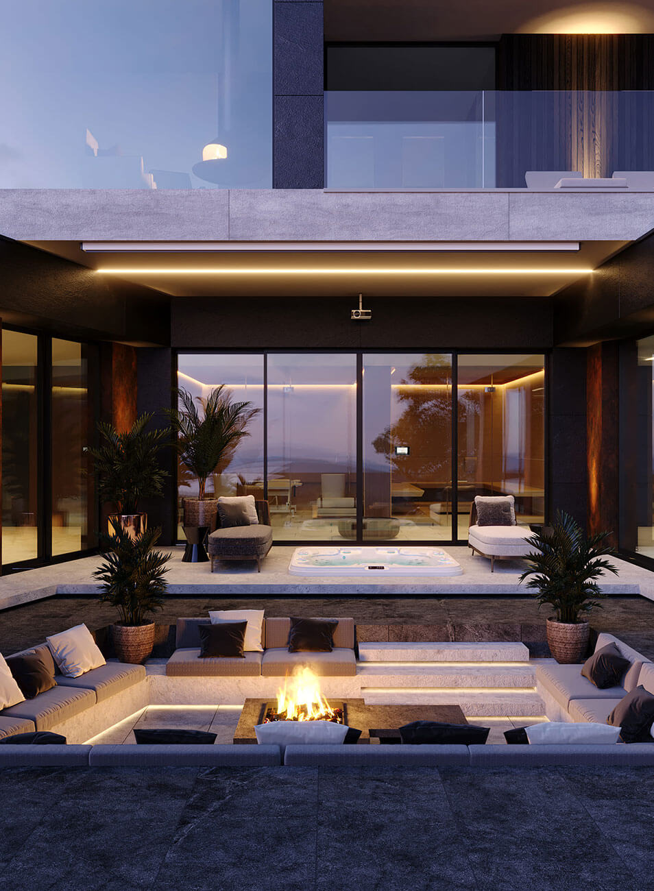 Функциональная внутренняя планировка вилы включает в себя все необходимое для комфортной жизни человека. На первом уровне виллы стояла задача разместить зону спа с большим бассейном, из которого открывается панорамный вид на реку. С левой стороны разместились жилые помещения, довольно вместительная гостиная, в которой есть бар для напитков и камин. Так же на первом уровне виллы мы продумали зону для барбекю, в которую мы попадаем через проходную кухню.
