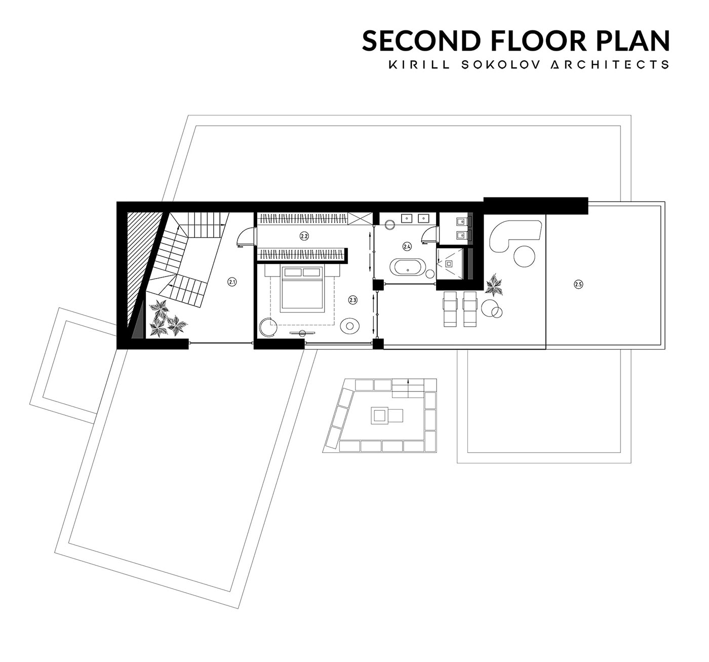 Верхний уровень виллы включает в себя: хозяйскую мастер спальню с подвесным камином, из спальни мы попадаем в мастер ванную с большой ванной, которая расположена у панорамного окна. В спальне есть большая, вместительную гардеробная. Опоясывает второй этаж терраса, где можно отдохнуть перед камином и уединиться от суеты внешнего мира.