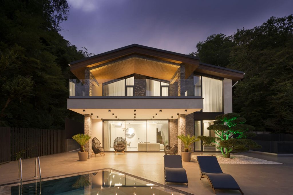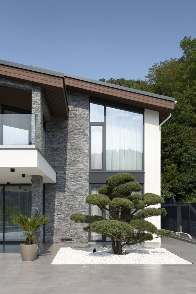 Проект ArchiNova Studio в Мацесте, где классический стиль шале получил современное прочтение. Мы совместили его с минимализмом, подчеркнули пластику панорамными витражами и создали лаконичный образ, органично вписанный в горный ландшафт. Фасады выполнены в комбинации белой камешковой штукатурки и натурального камня, что придало архитектуре элегантность и выразительность.