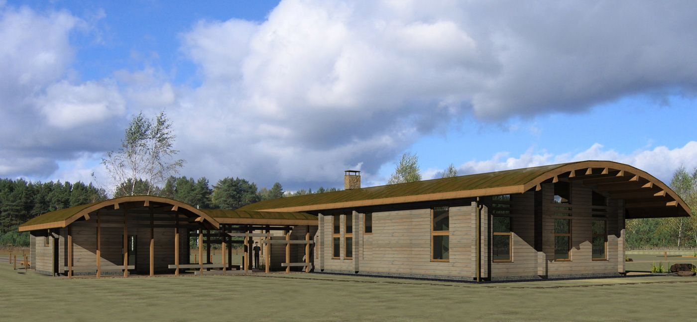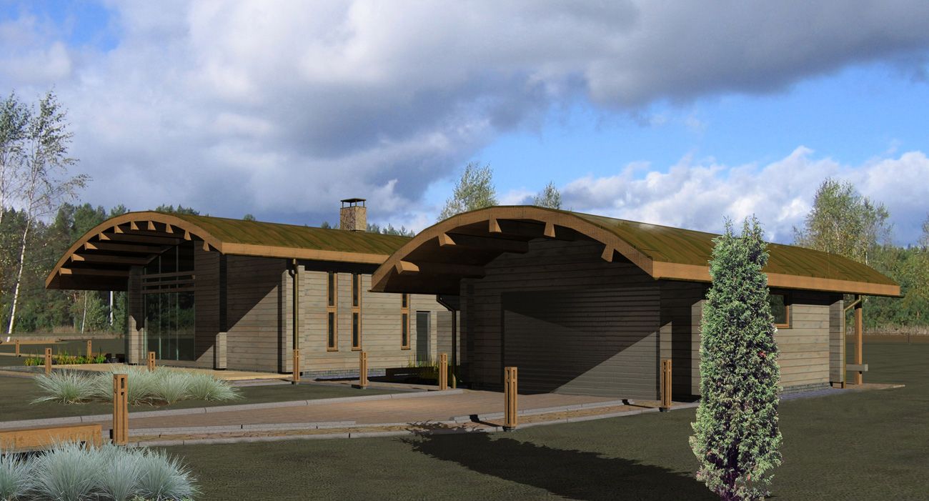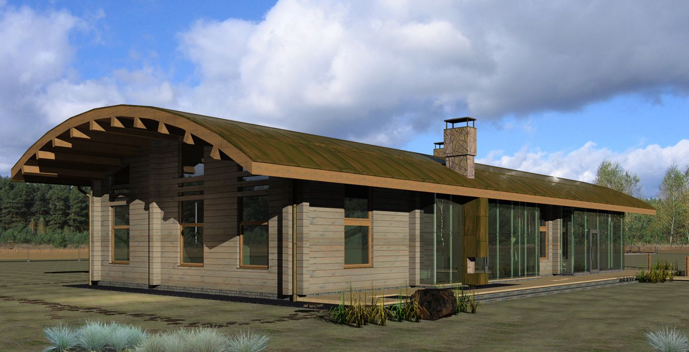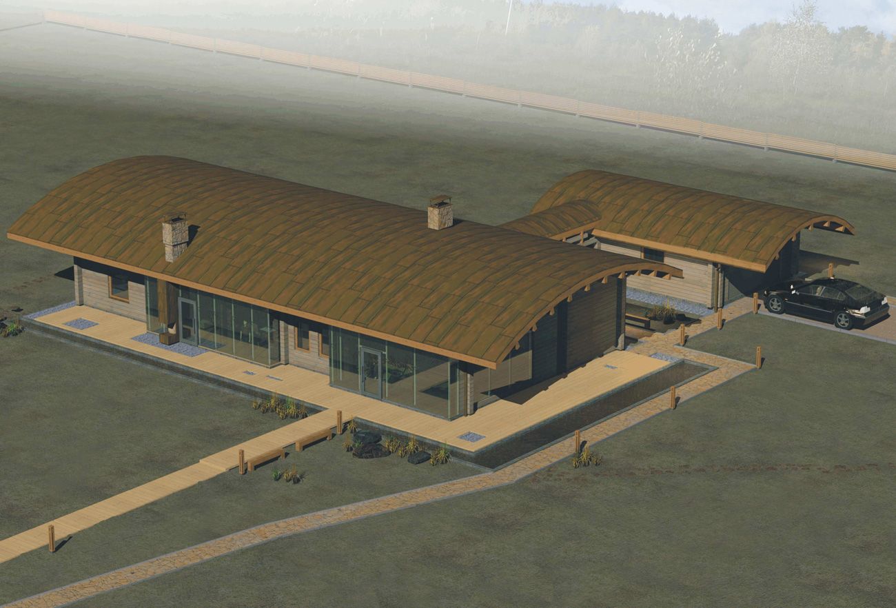 Идея одноэтажного деревянного особняка — максимально нейтральное визуальное воздействие на окружающую среду. Основным акцентом является пейзаж холмистой равнины, луговые травы, редкие деревья и бурая цветовая гамма.