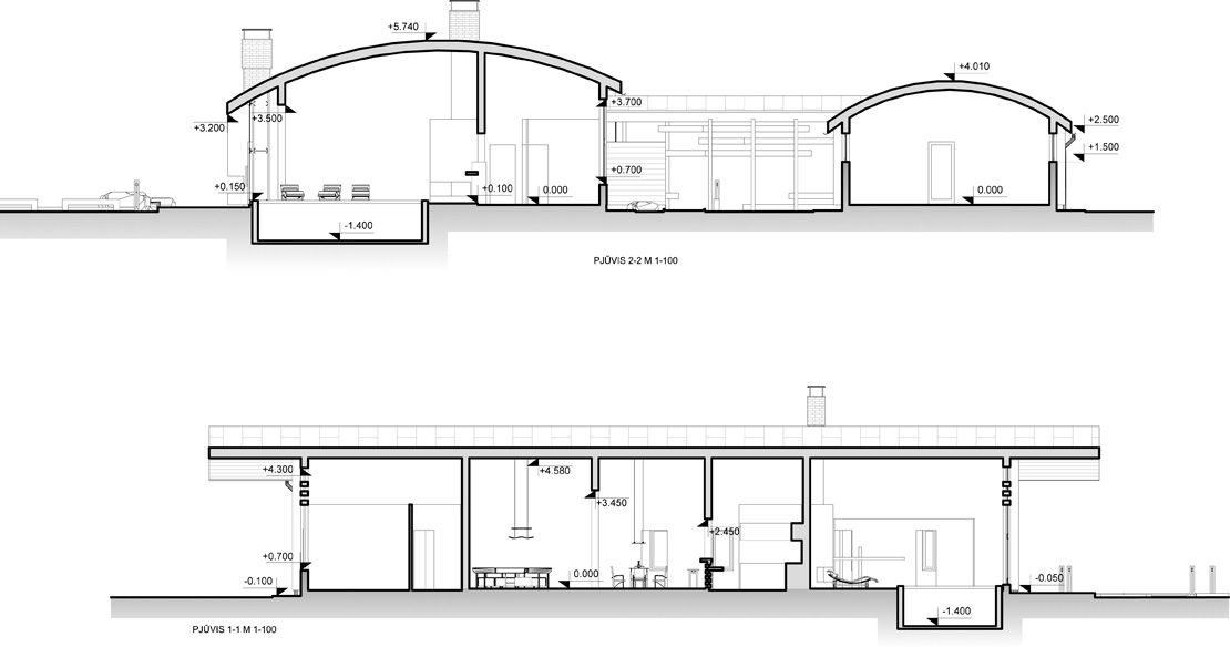 Дом состоит из двух прямоугольных строений, накрытых арочными крышами. Меньший объем (гараж на 2 авто) соединяется с большим (жилой дом) посредством крытой галереи.