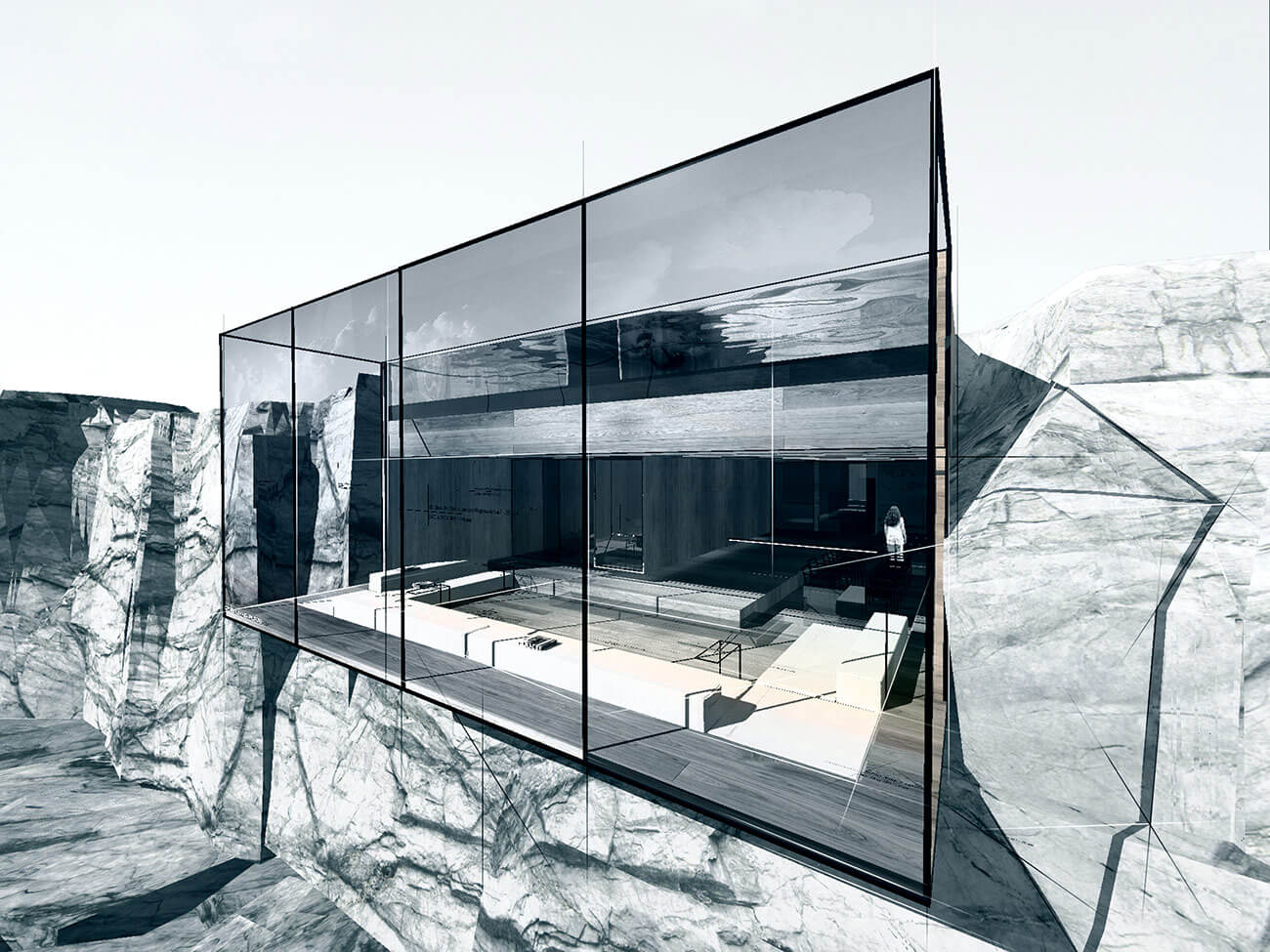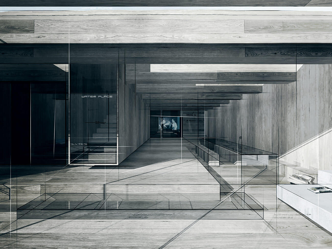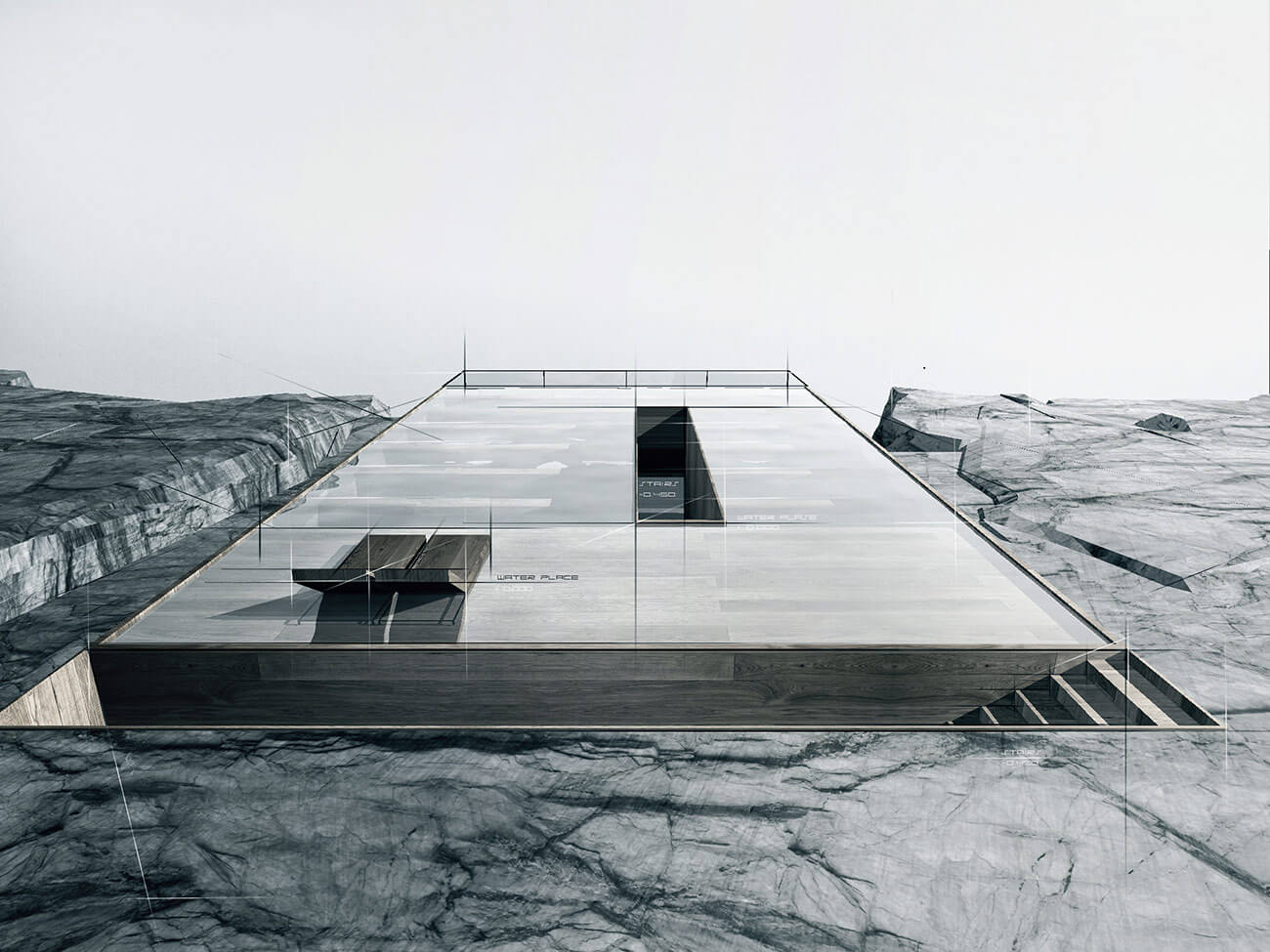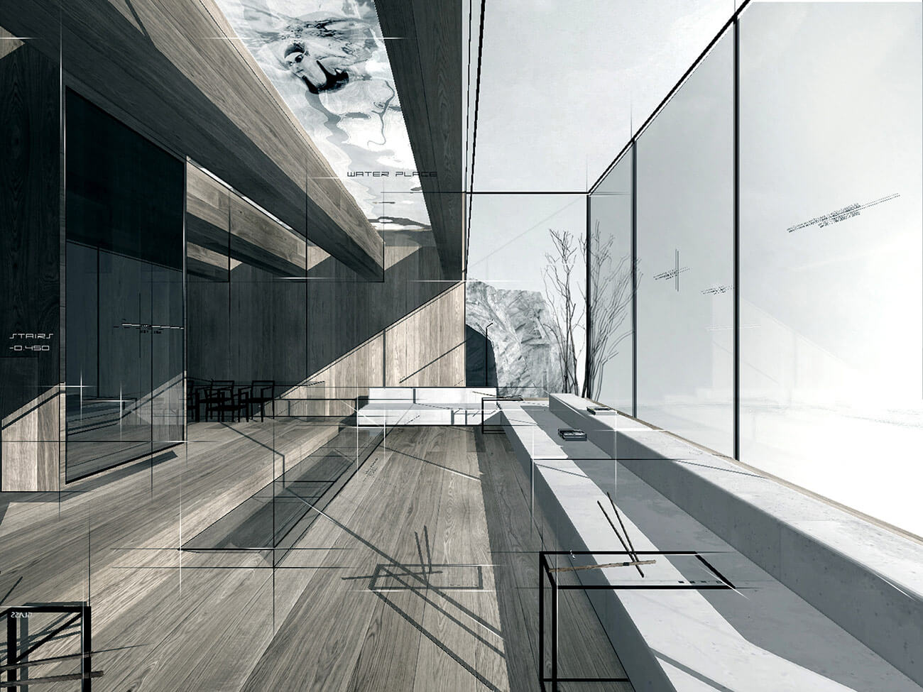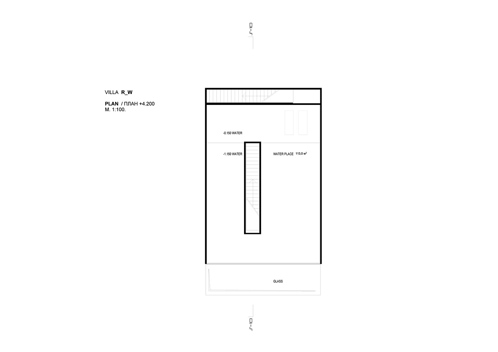 Основная составляющая — ориентирование дома с учетом инсоляции и красной линии участка. На нулевом уровне бассейн 200—1100 мм с прозрачным основанием по балкам, Из бассейна можно спуститься в гостиную.